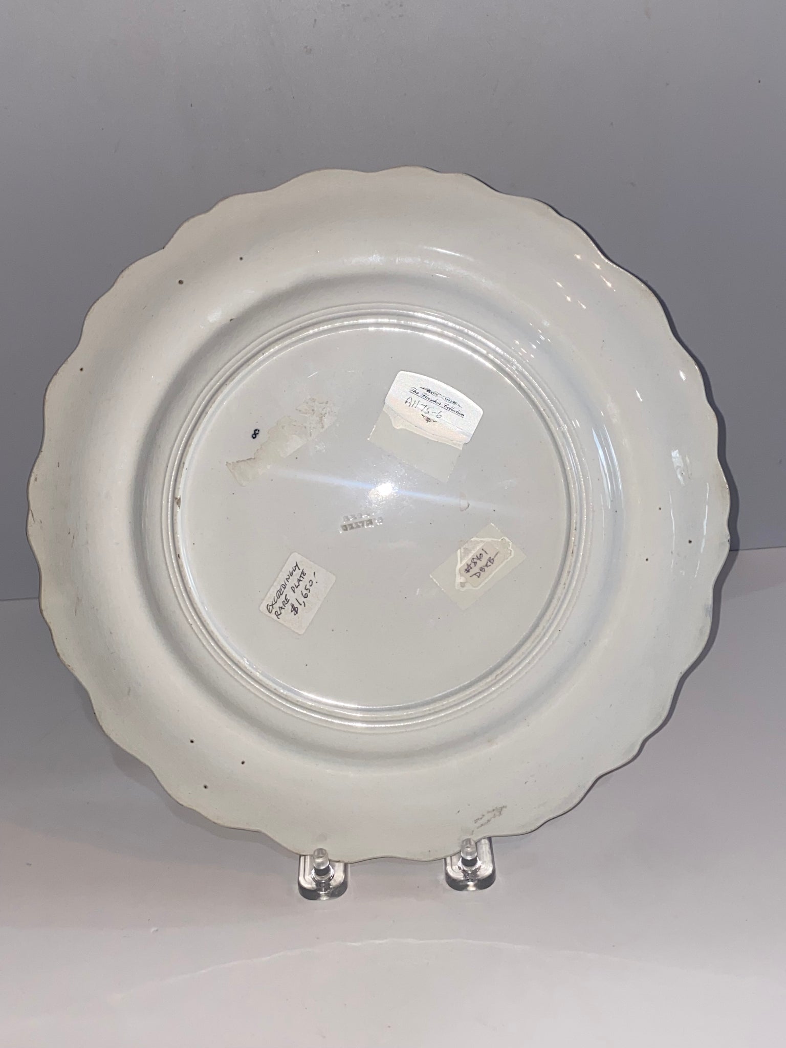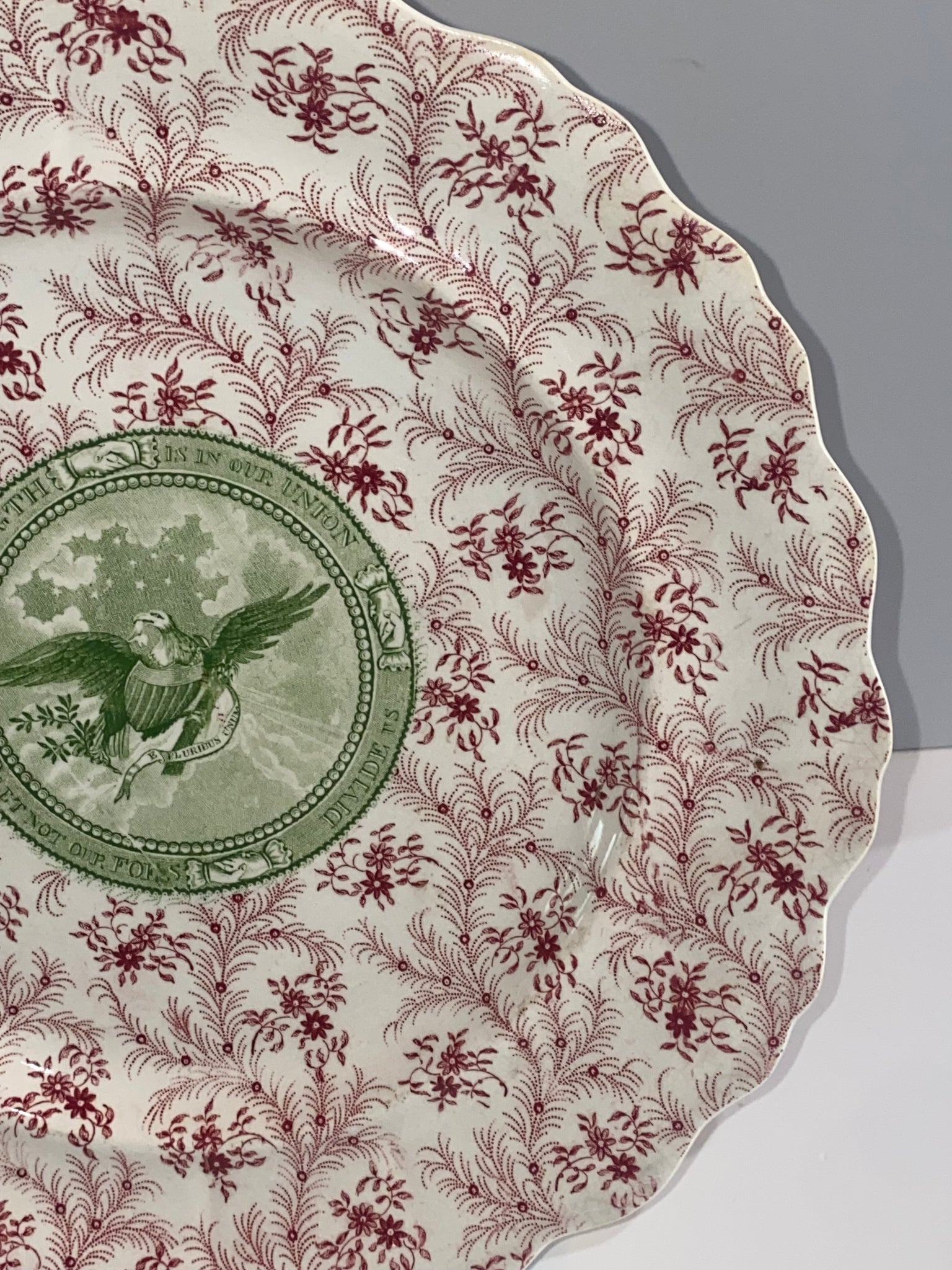 Historical Staffordshire Pink and Green transfer plate with Eagle and Shield. The eagle is surrounded by a band that reads “Let Not Our Foes Divide Us Our Strengths Is In Our Union”. In perfect condition with no chips, cracks or repairs. It measures 10 5/8” in diameter and dates circa 1830’s. Ex Gene Fleischer Collection. Impressed Mayer on back.