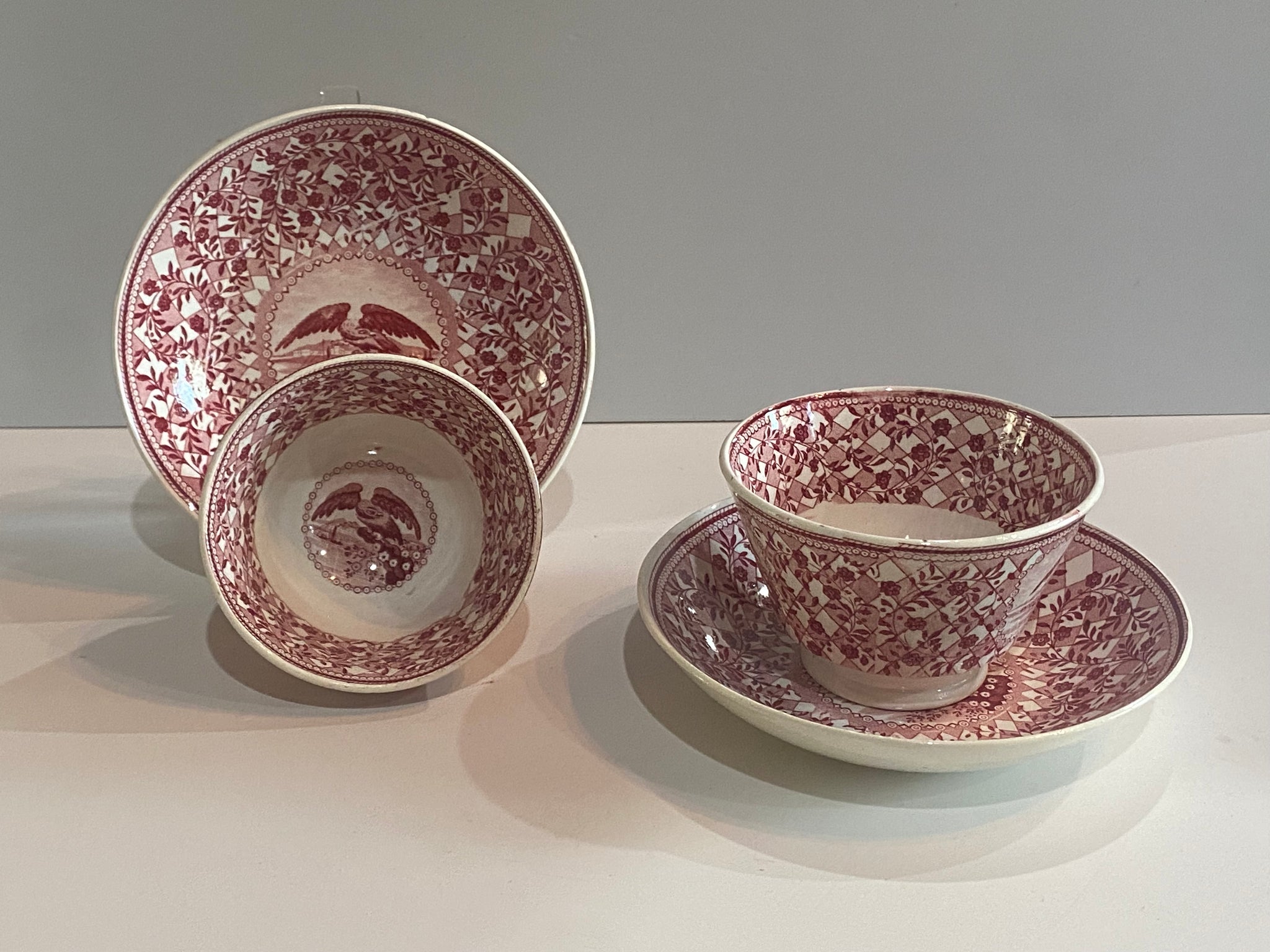 Historical Staffordshire pink transfer cup and saucer in an “Eagle” pattern by Enoch Wood and Sons. In perfect condition with no chips, cracks or repairs. The saucer measures 5 7/8” in diameter and the set dates circa 1835.