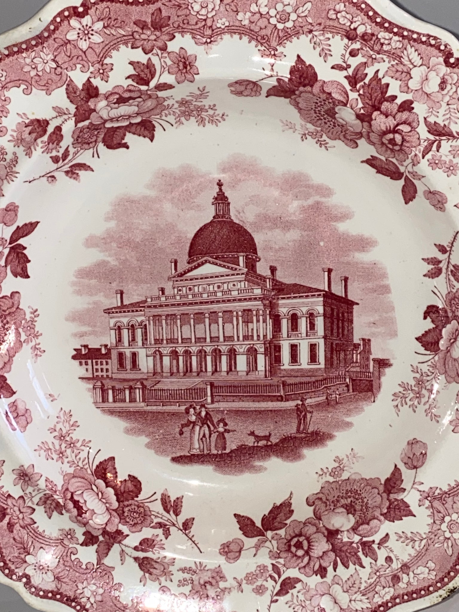 Historical Staffordshire pink transfer soup plate with view of “The Boston State House” by Jackson. In perfect condition with no chips, cracks or repairs and appears unused. It measures 10 1/4” in diameter and dates circa 1835.