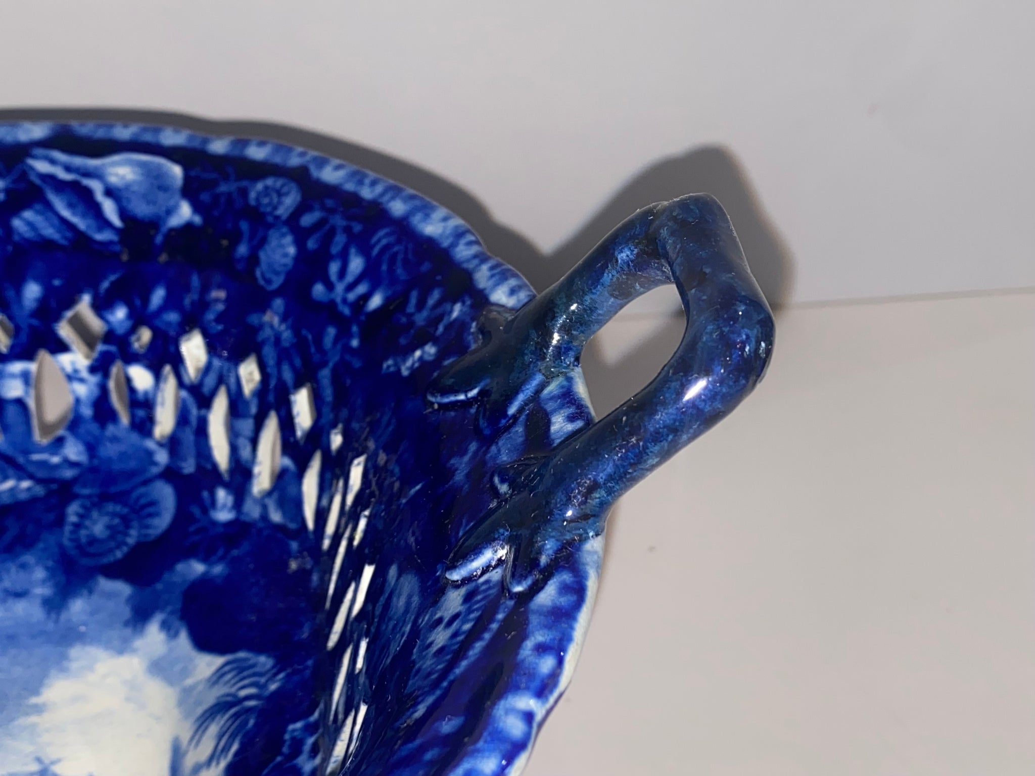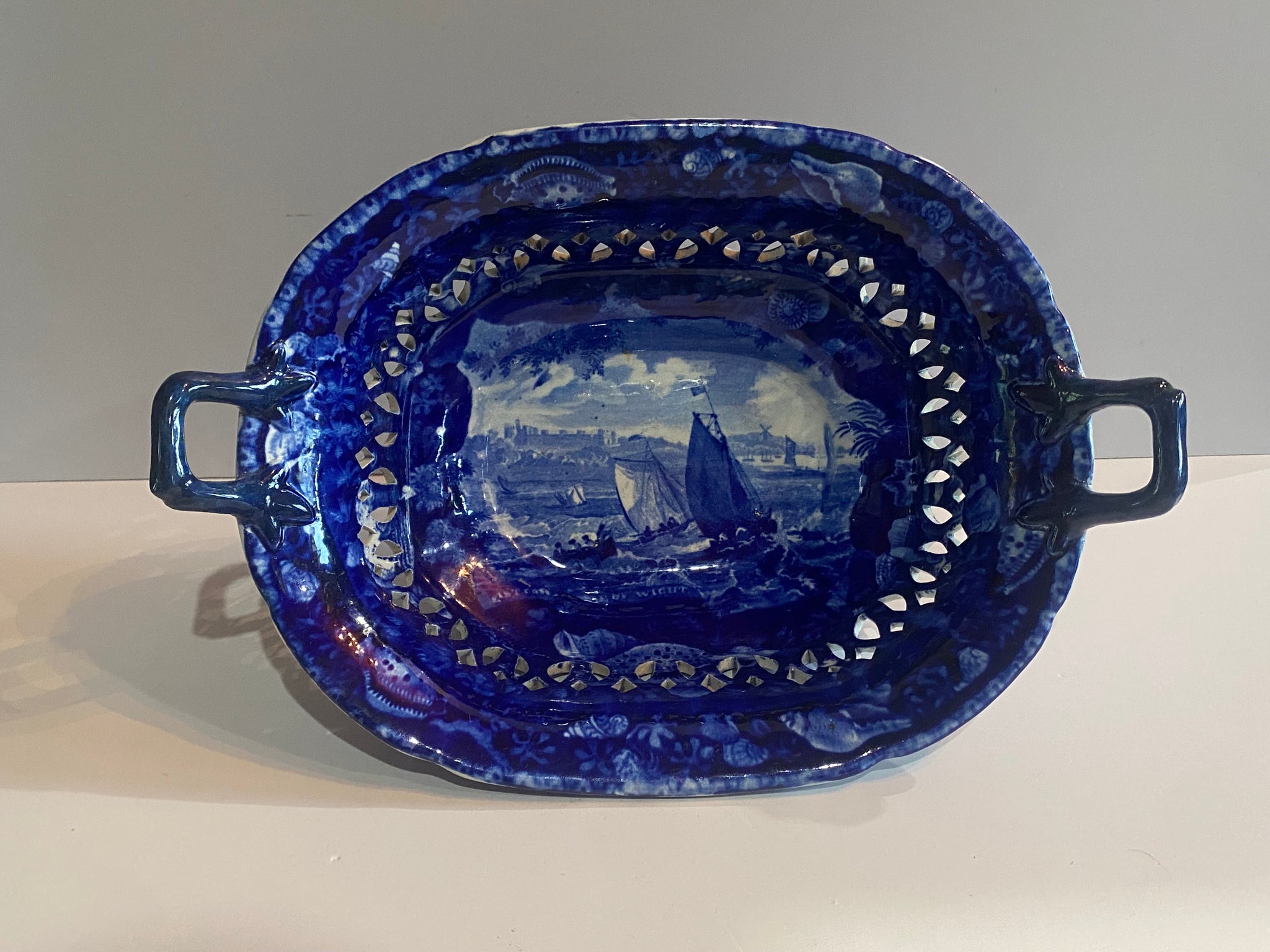 Historical Staffordshire blue reticulated basket with view of “East Cowes Isle of Wight” by Enoch Wood and Sons. Displays well with professional repairs to both handles and small underside chip. It measures 4” tall by 7 1/4” by 9 1/2” and dates circa 1825.