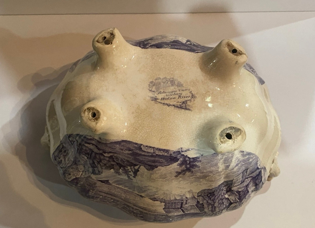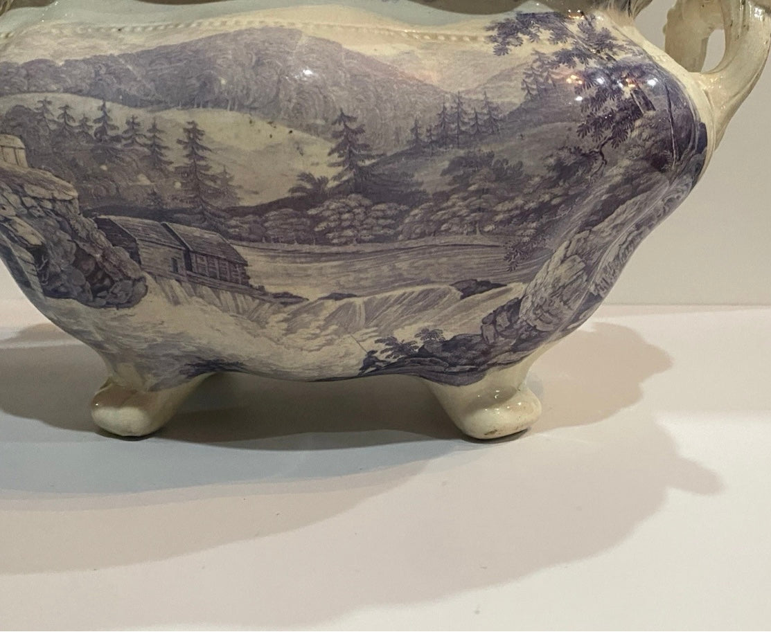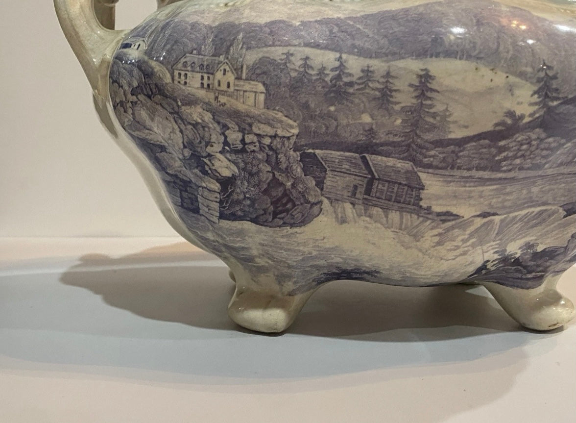 Historical Staffordshire mulberry transfer Soup Tureen with view of Little Falls At Luzerne Hudson River. Mislabeled Newburgh on the base. From Clews Picturesque Views series. Fair condition with some staining that could be cleaned. Small chip on the rim and short hairline on the lid. Hollow pieces in this series are hard to find. It measures 8” by 12 3/4” across the handles by 9 3/4” tall and dates circa 1835.