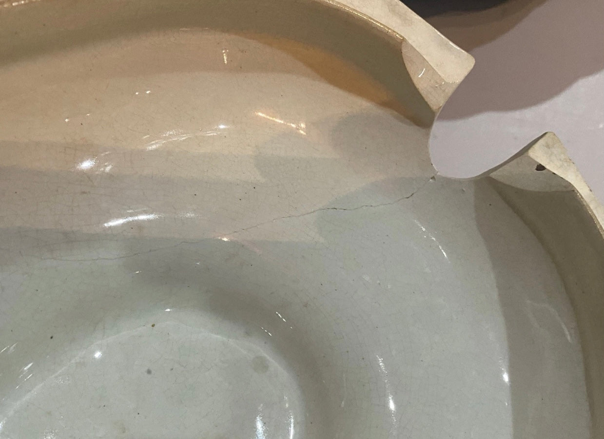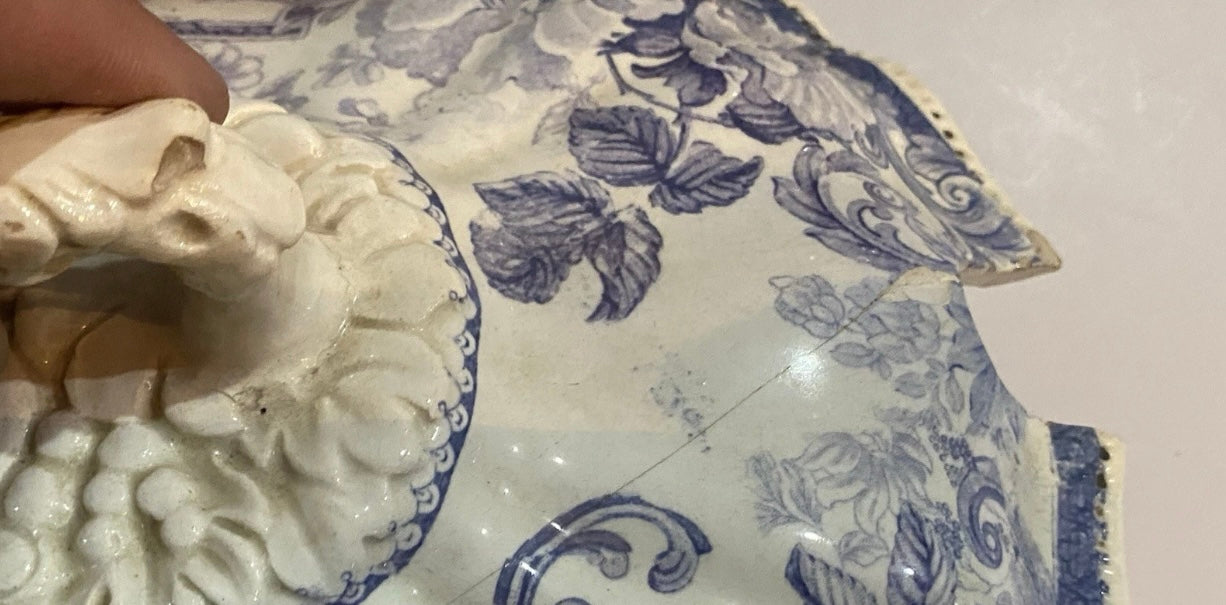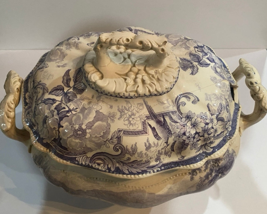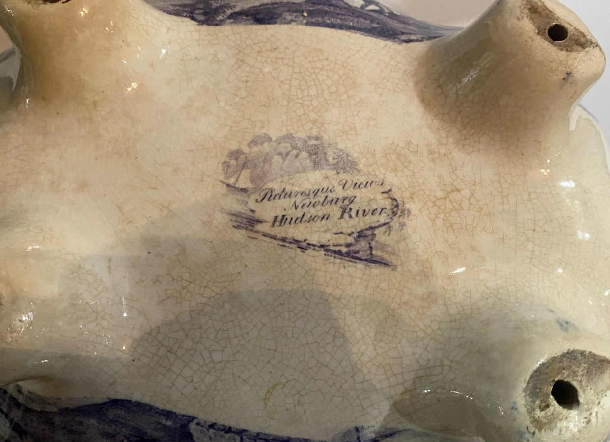 Historical Staffordshire mulberry transfer Soup Tureen with view of Little Falls At Luzerne Hudson River. Mislabeled Newburgh on the base. From Clews Picturesque Views series. Fair condition with some staining that could be cleaned. Small chip on the rim and short hairline on the lid. Hollow pieces in this series are hard to find. It measures 8” by 12 3/4” across the handles by 9 3/4” tall and dates circa 1835.