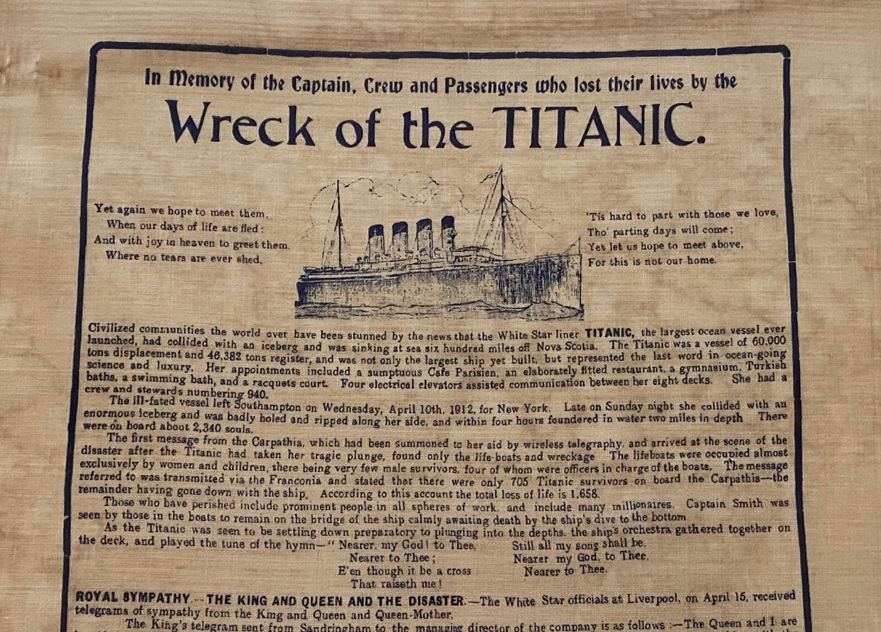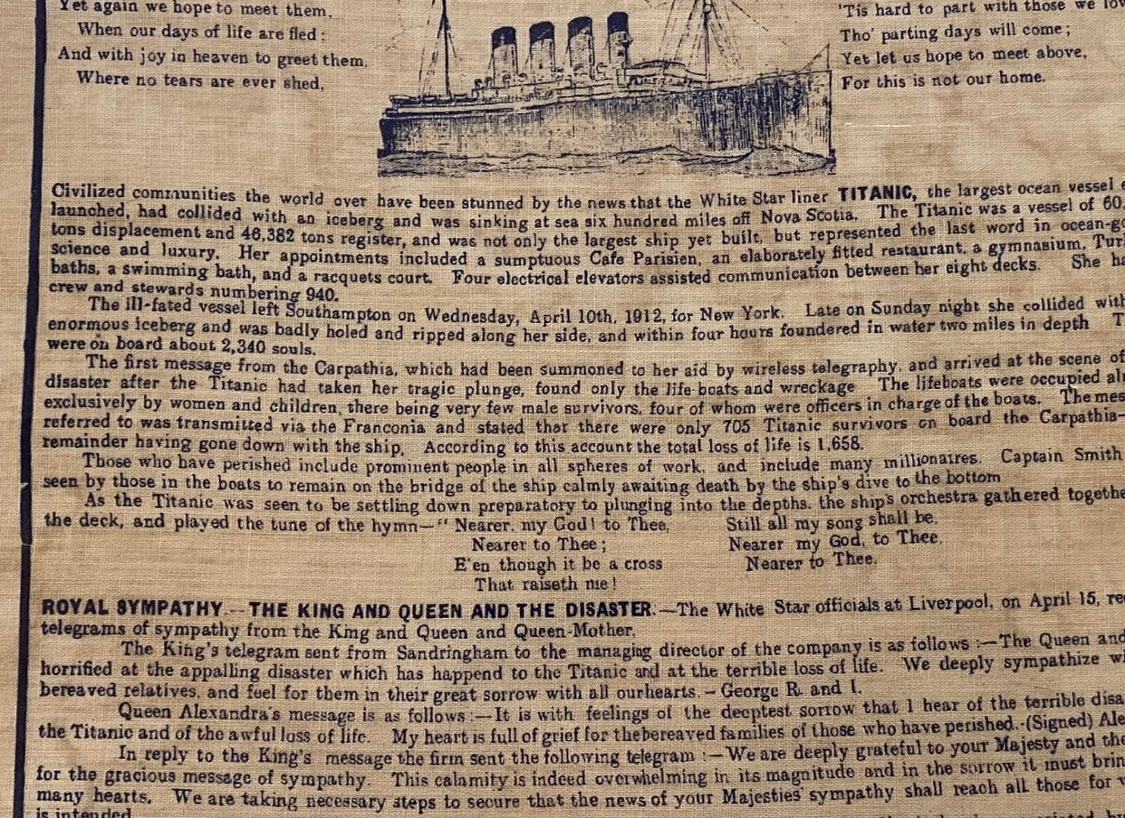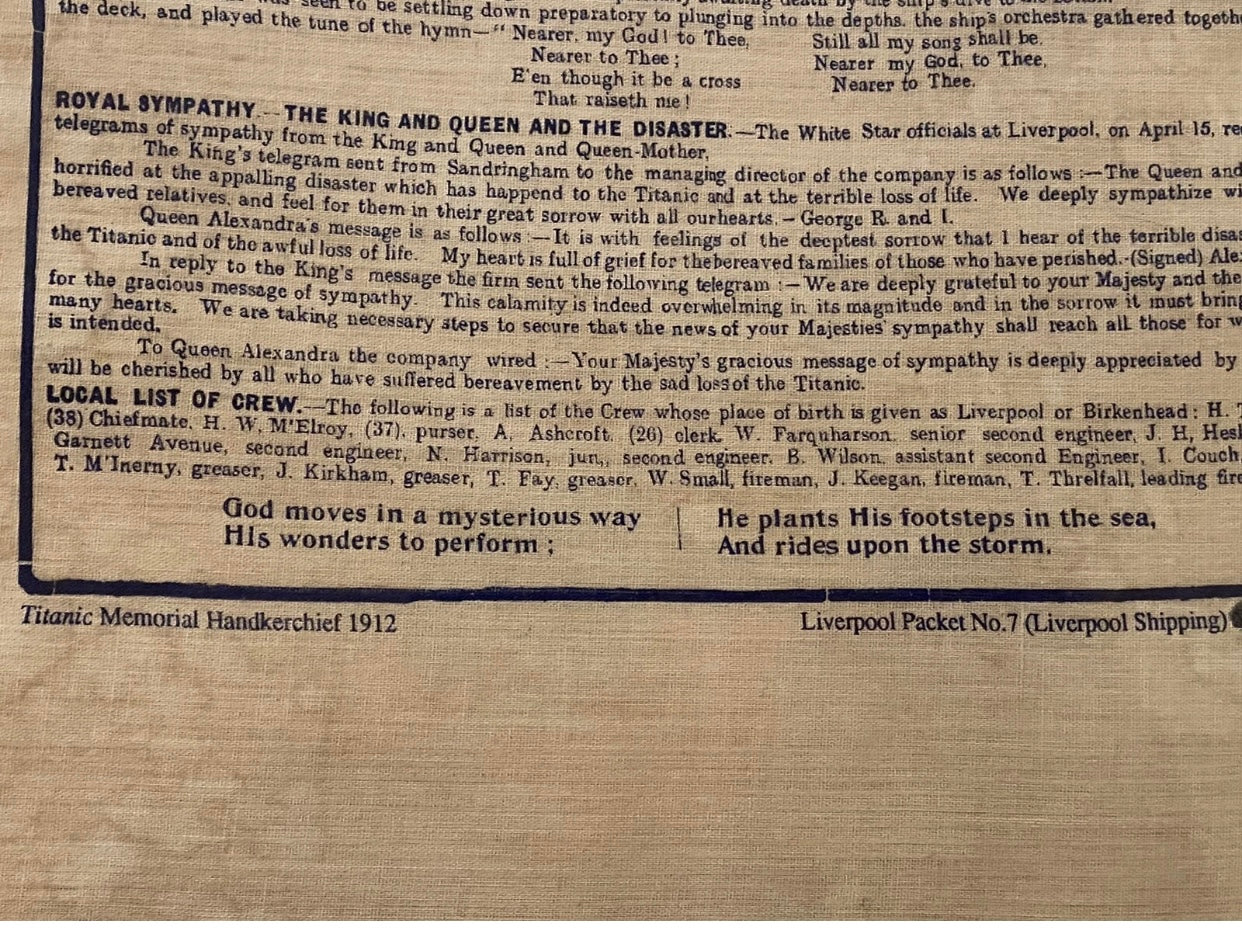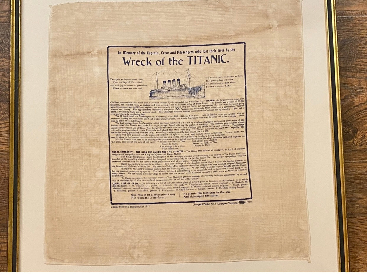 Very scarce In memory of the captain, crew and passengers who lost their lives by the wreck of the Titanic” handkerchief. Made short after that tragic time. This piece is in good condition with some minor stains but does present well. It measures 13 3/4” by 14” plus the frame. Ready to hang up.