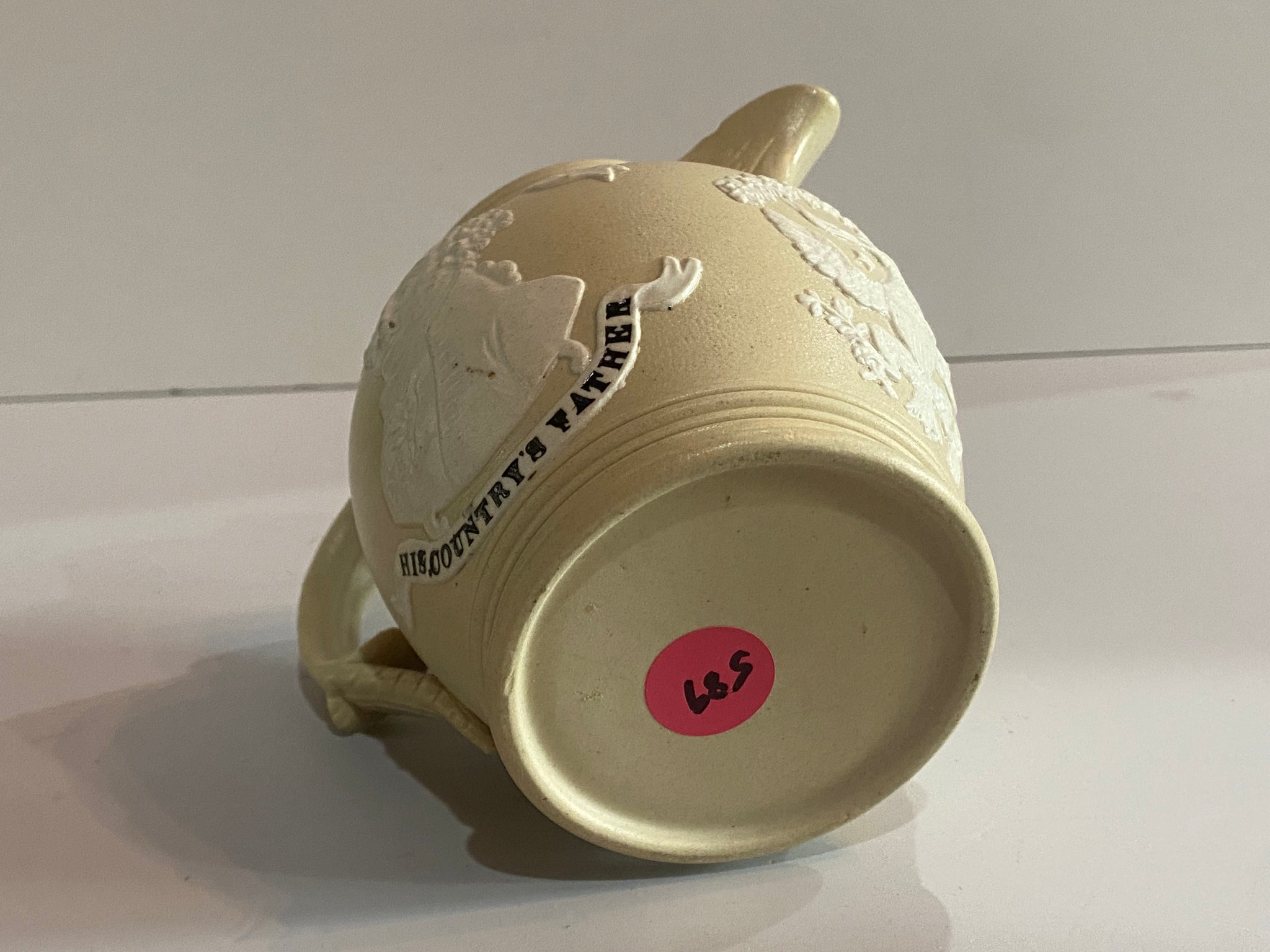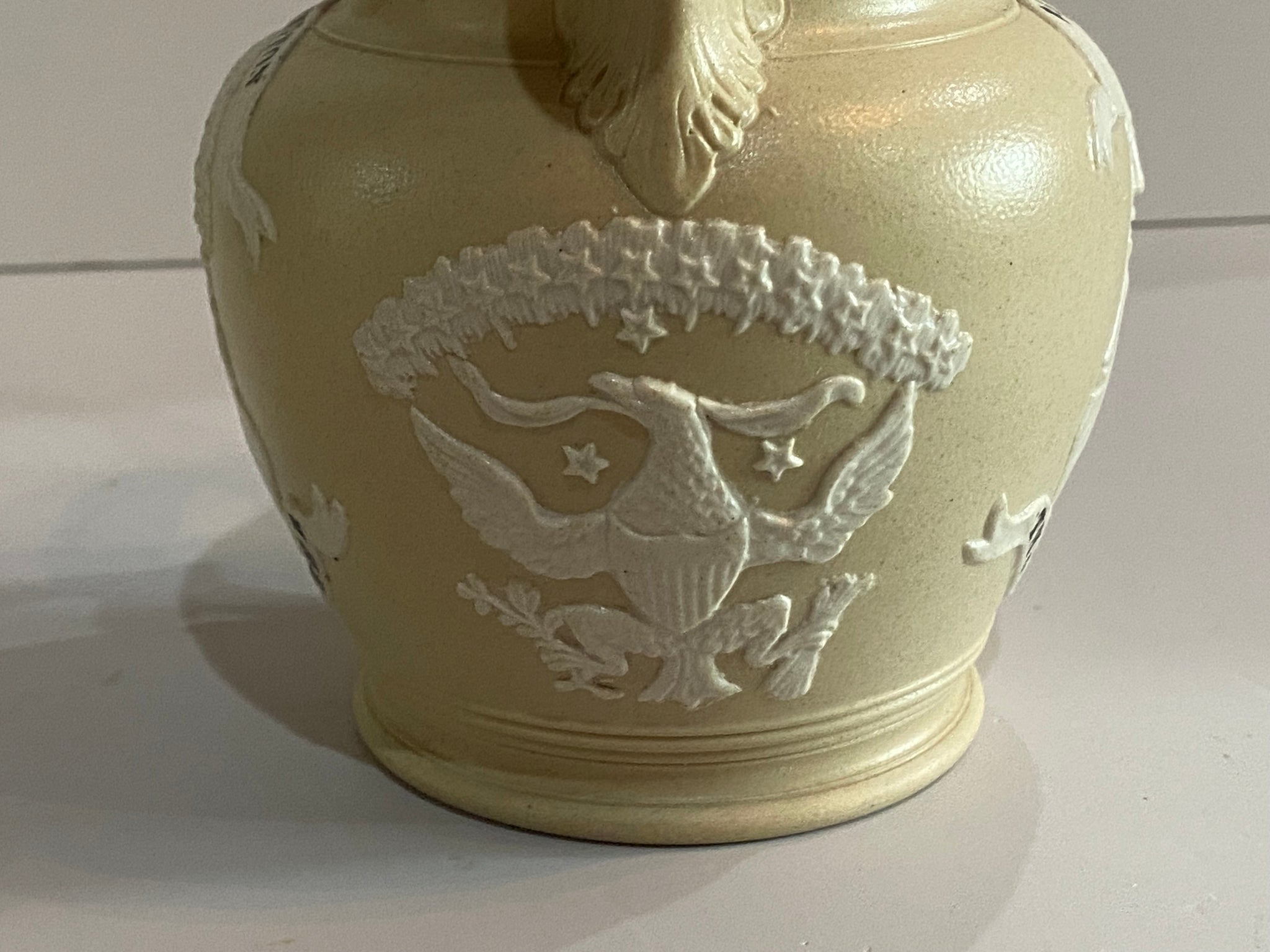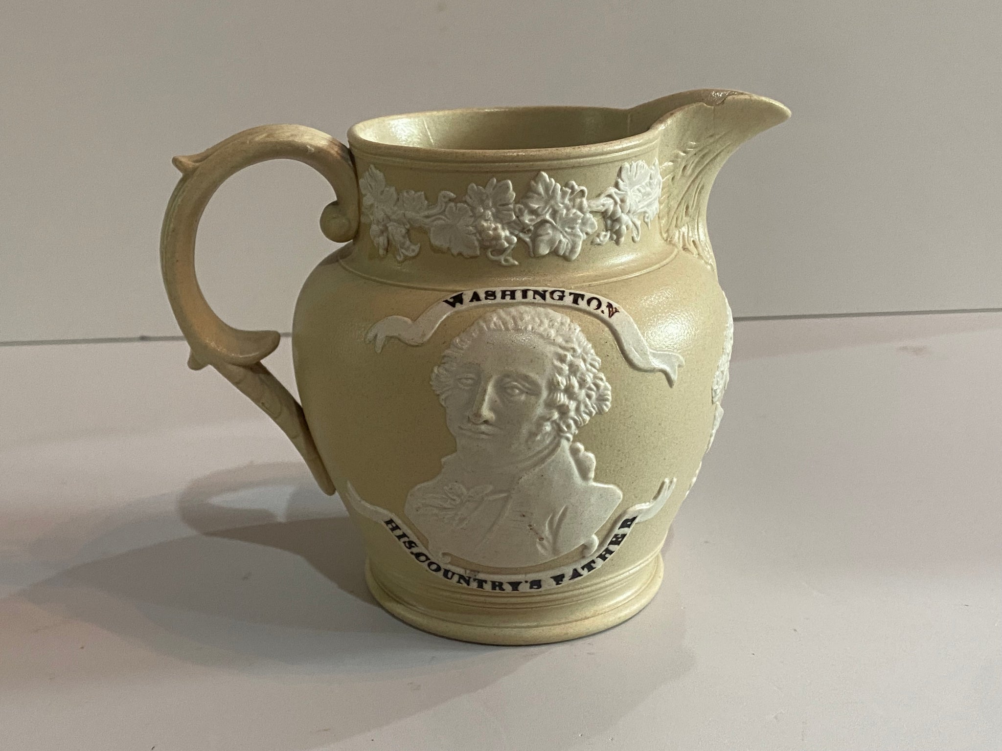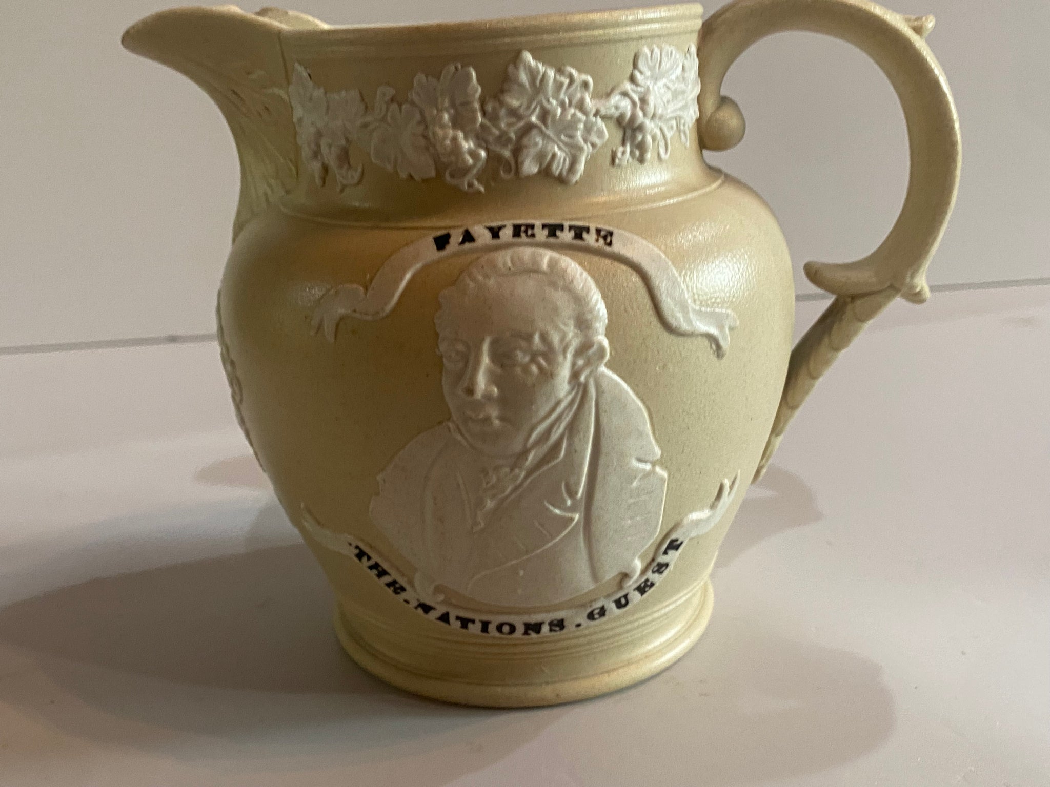 Staffordshire Jasperware George Washington and General Lafayette tan color pitcher with Seal of the United States under the spout. Very good condition with a small chip on the inner spout. It measures 4 1/2” tall and dates circa 1830’s.