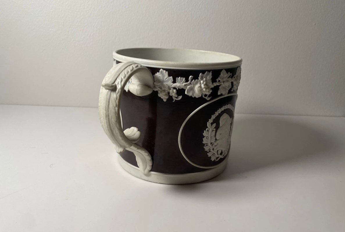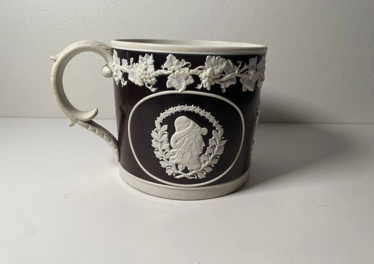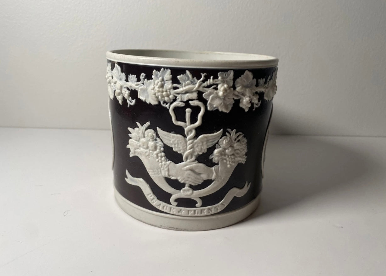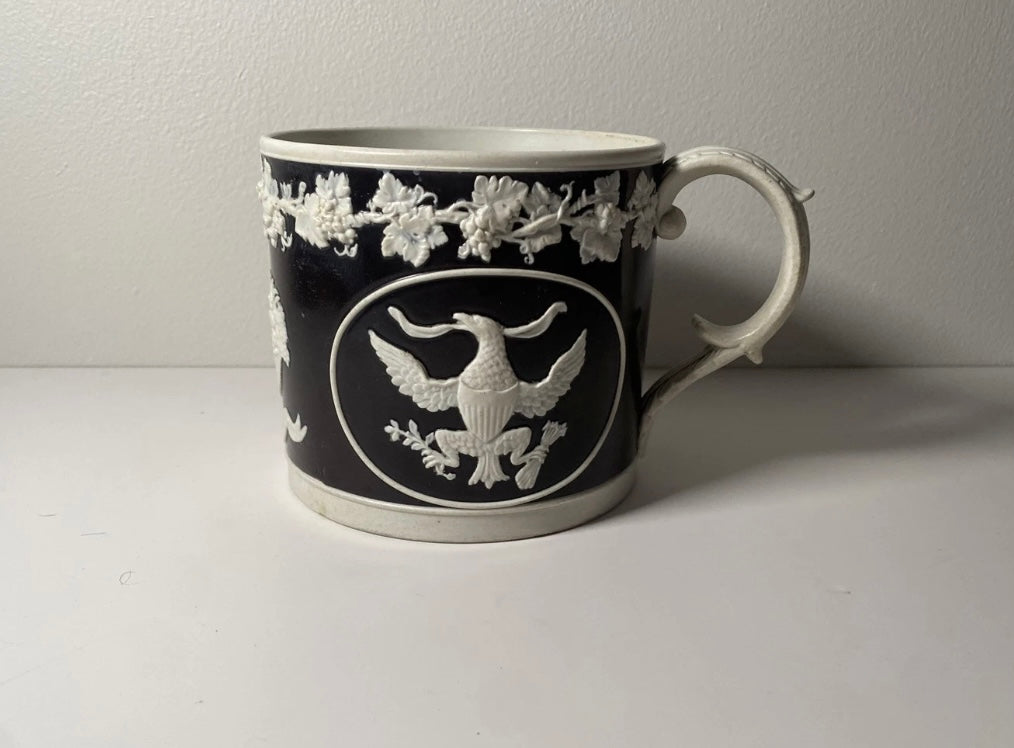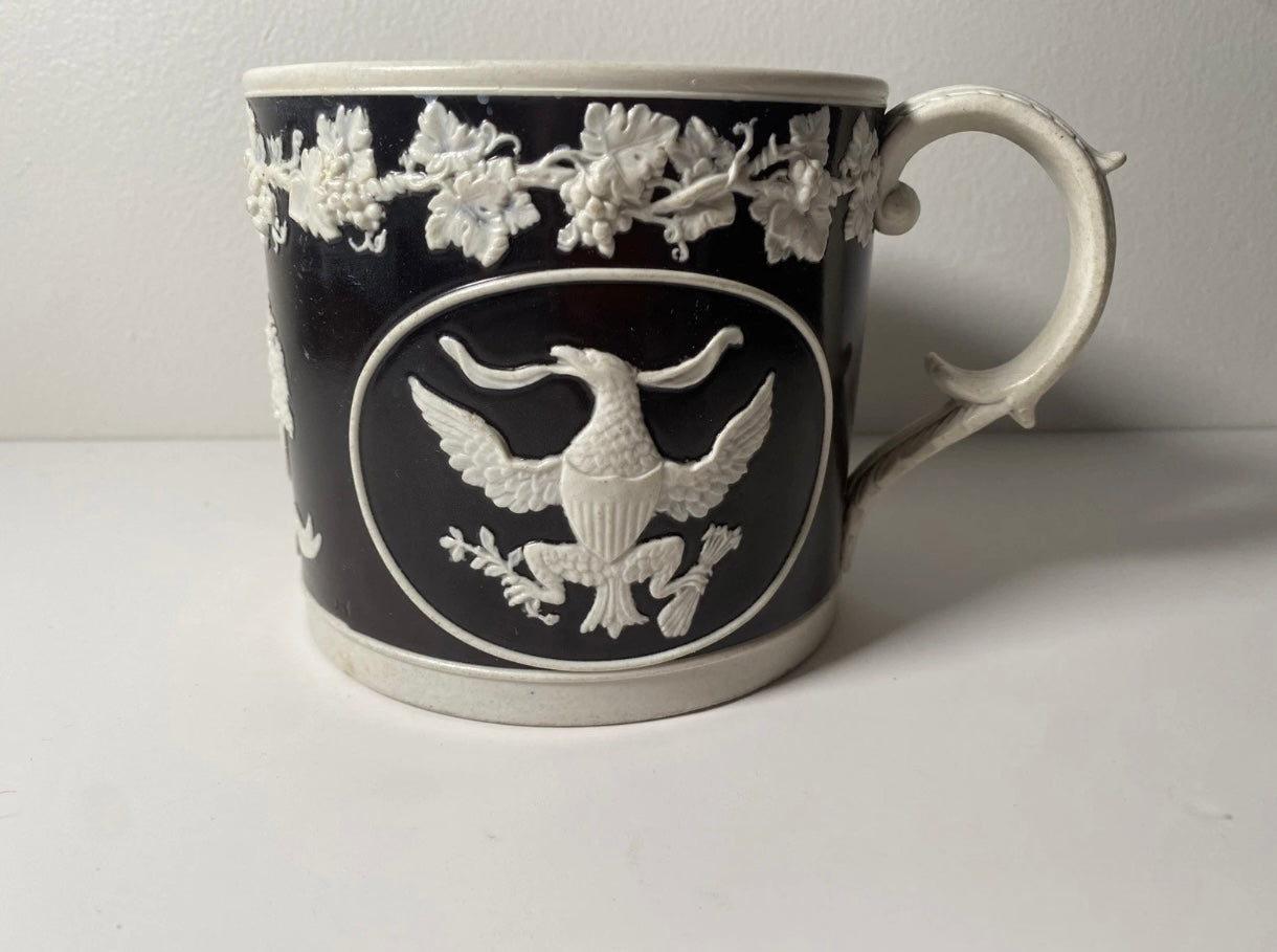 Staffordshire Jasperware mug with the Seal of the United States, Peace and Peace and figure of Columbia. Scarce brown background and also being a mug is pretty unusual. Perfect condition with no damage or repairs. It measures 4 5/8” in diameter by 4 1/8” tall and dates circa 1830’s