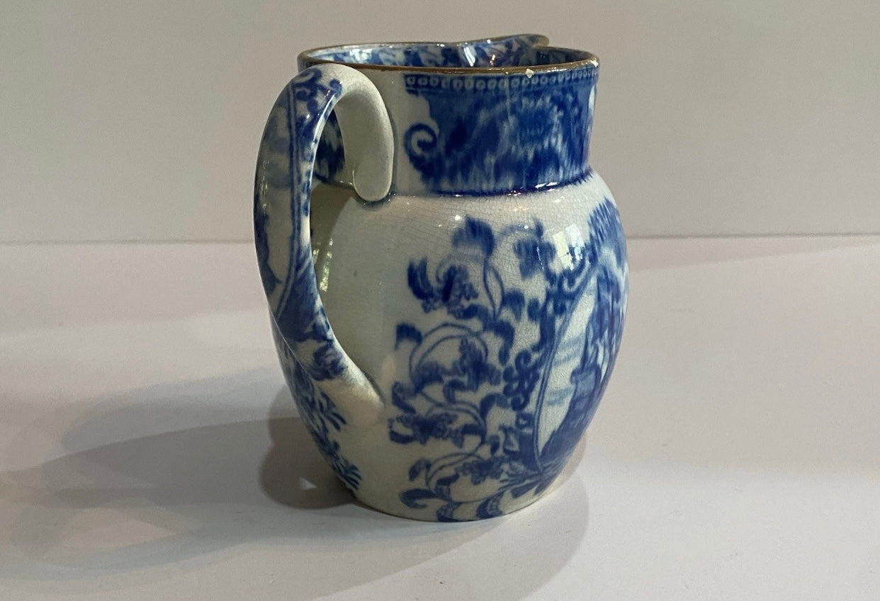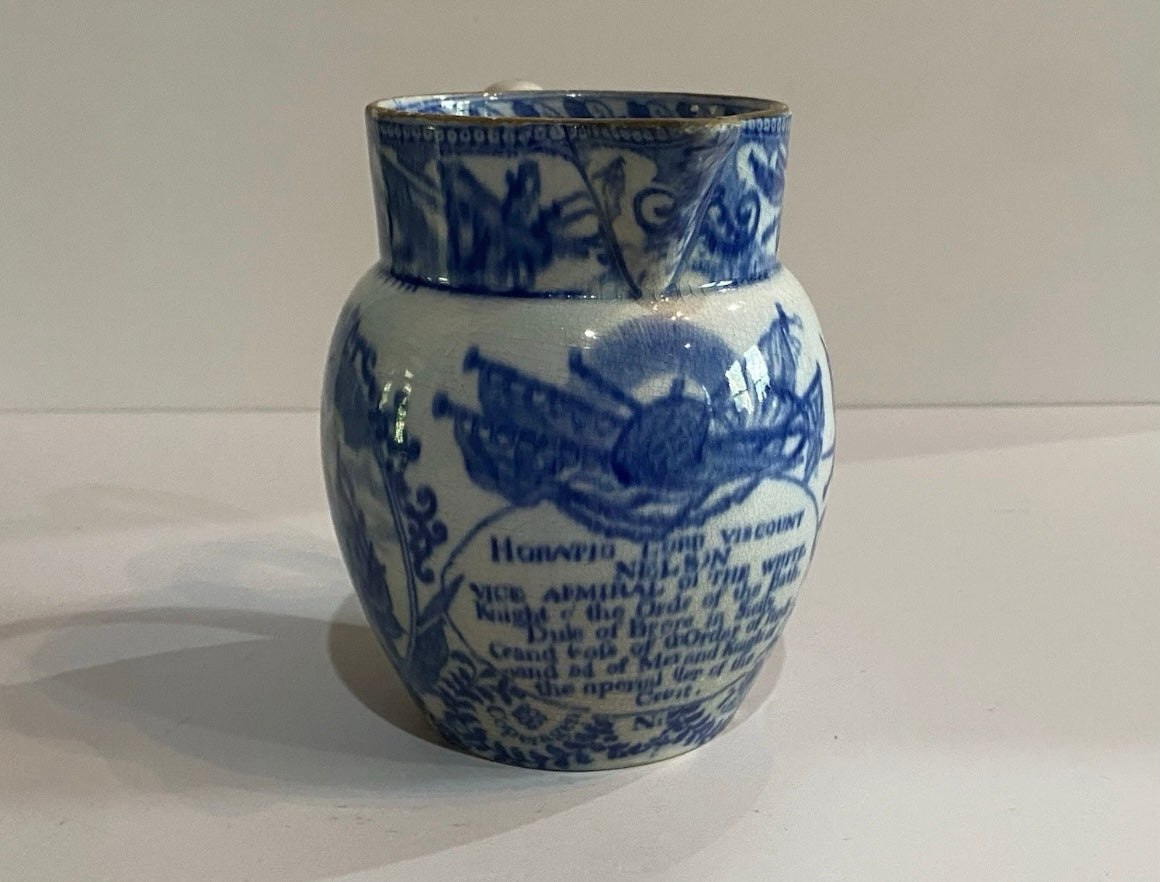 Staffordshire Pearlware blue transfer pitcher with Lord Nelson and his ship Victory. Good condition with a small foot chip and minor wear on the top rim. It measures 4 3/4” tall and dates circa 1820’s.