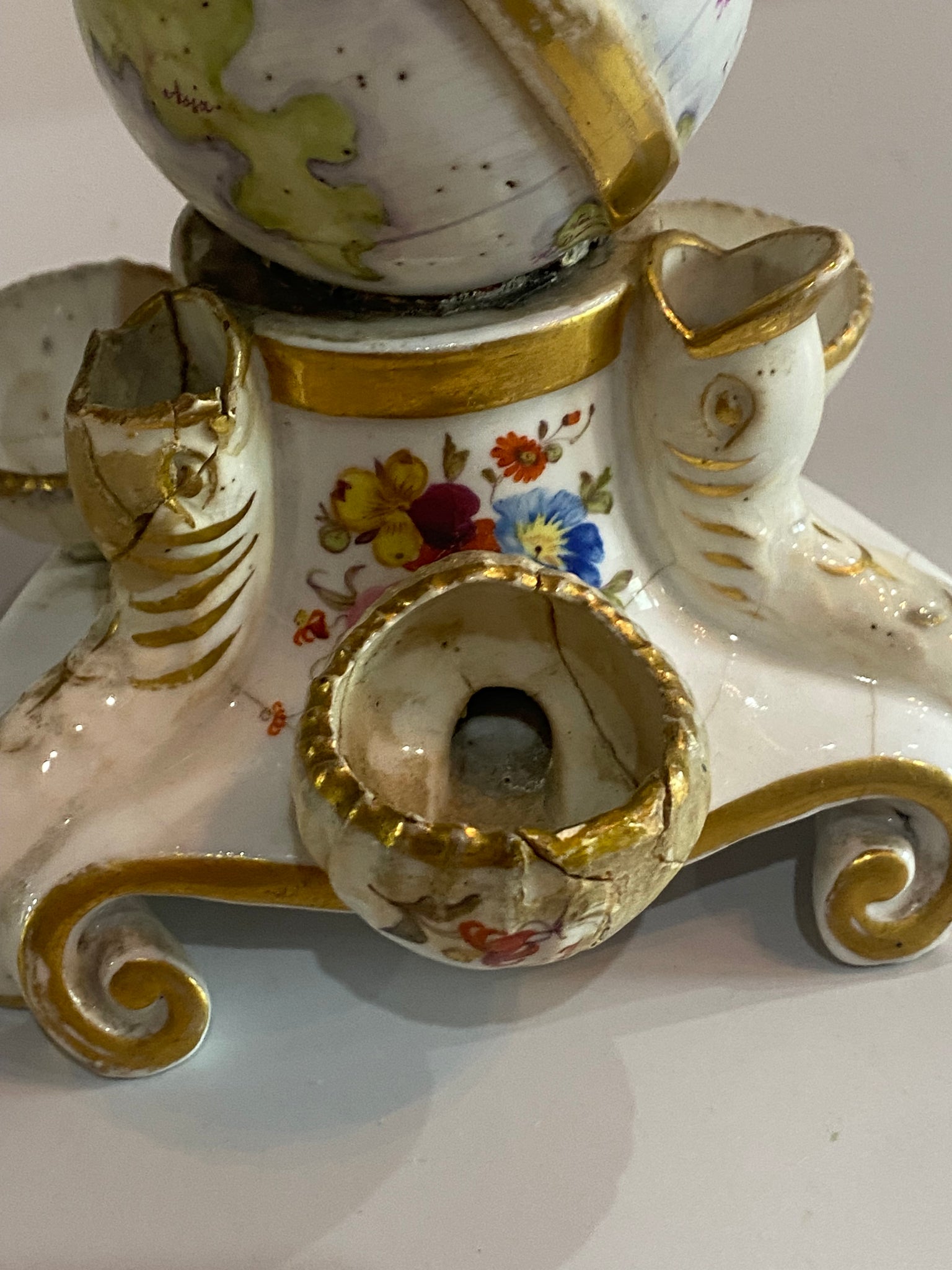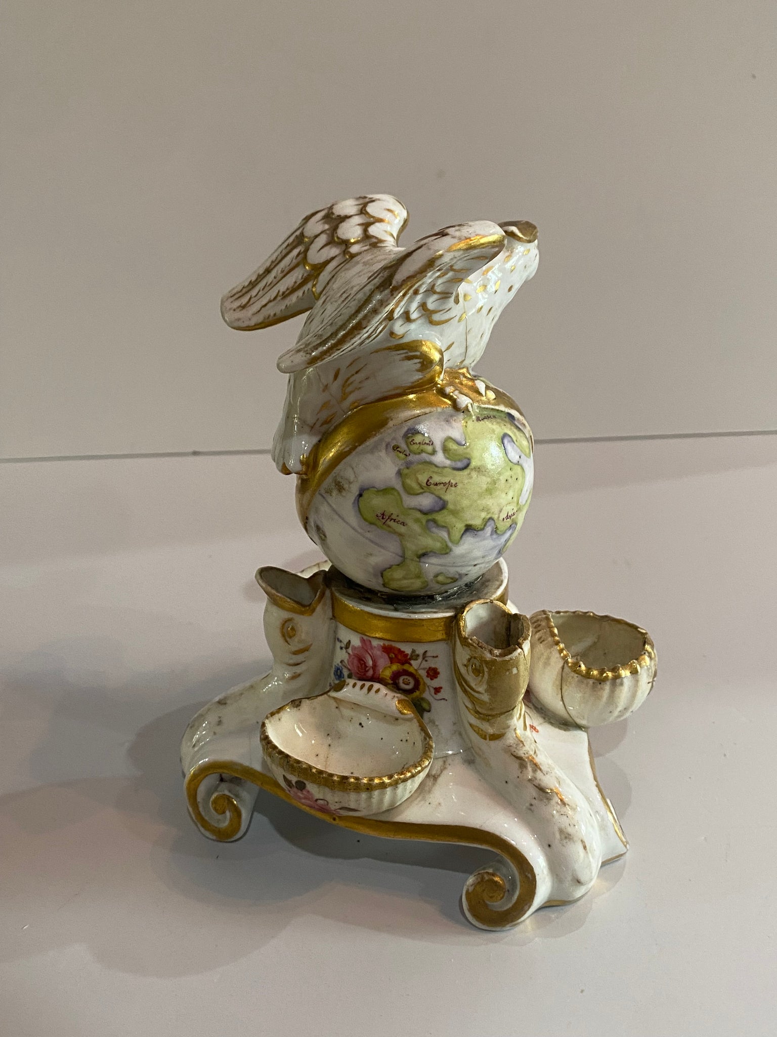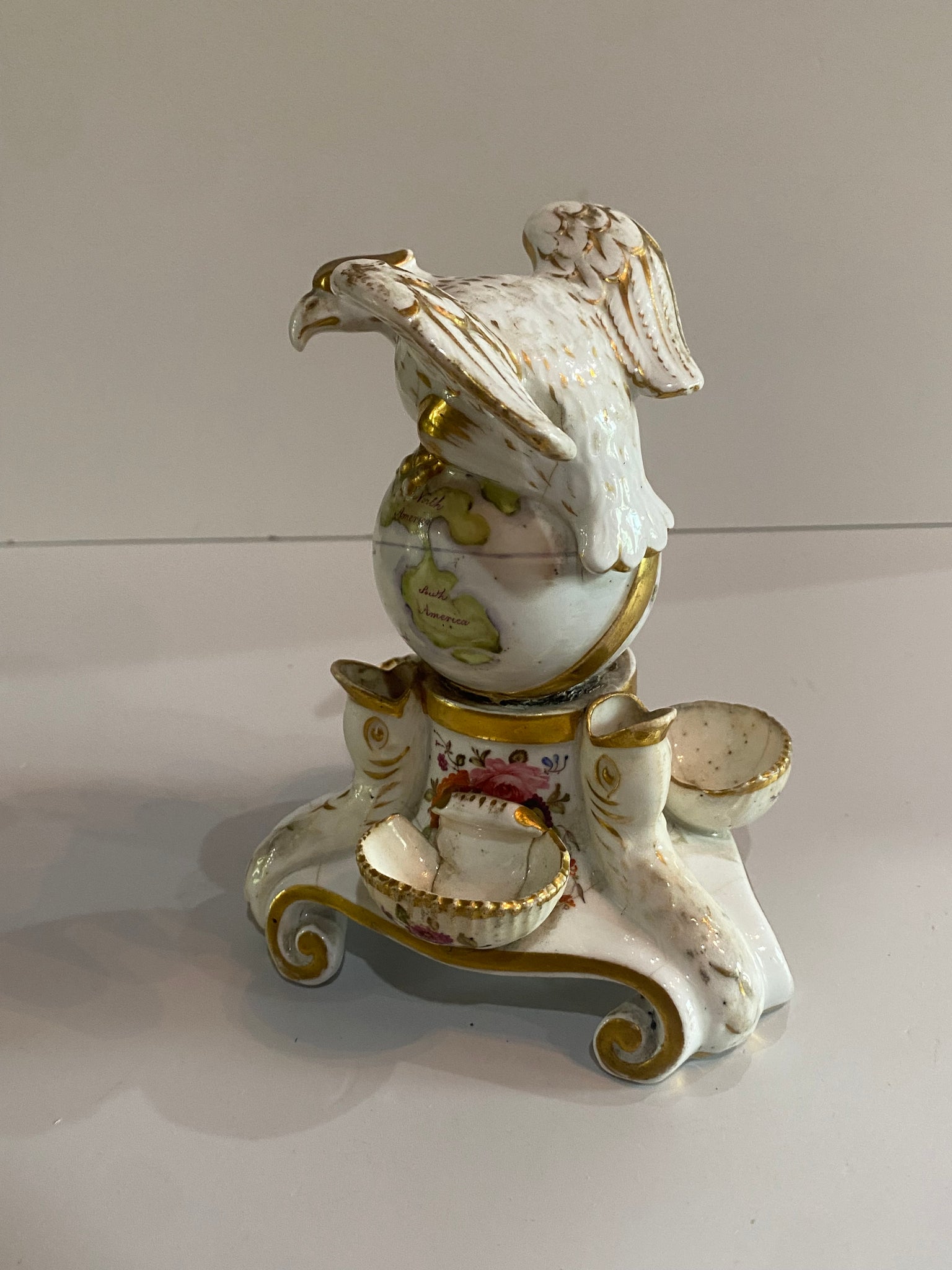 Staffordshire Porcelain inkwell with American Eagle perched on a globe being held up by fish. In fair condition with some breaks to the wells. Otherwise quite nice. It measures 6” tall and dates circa 1830’s.
