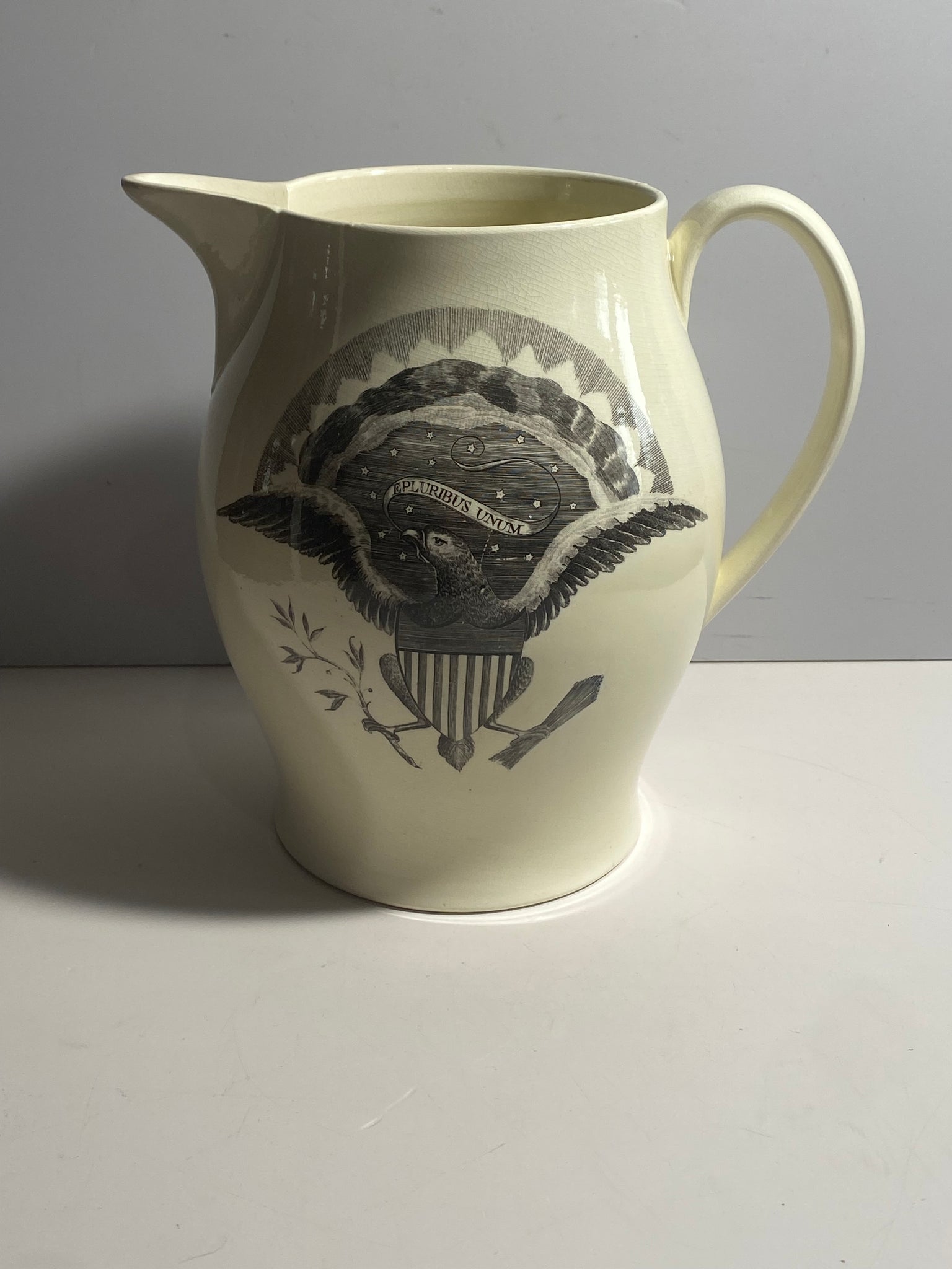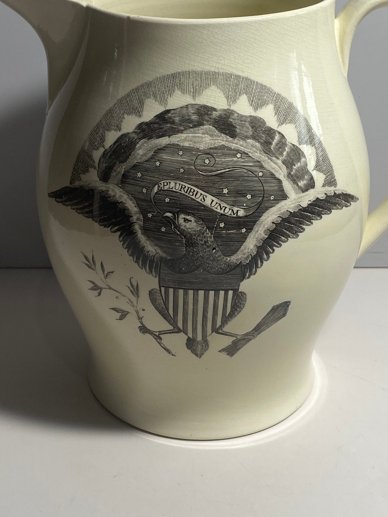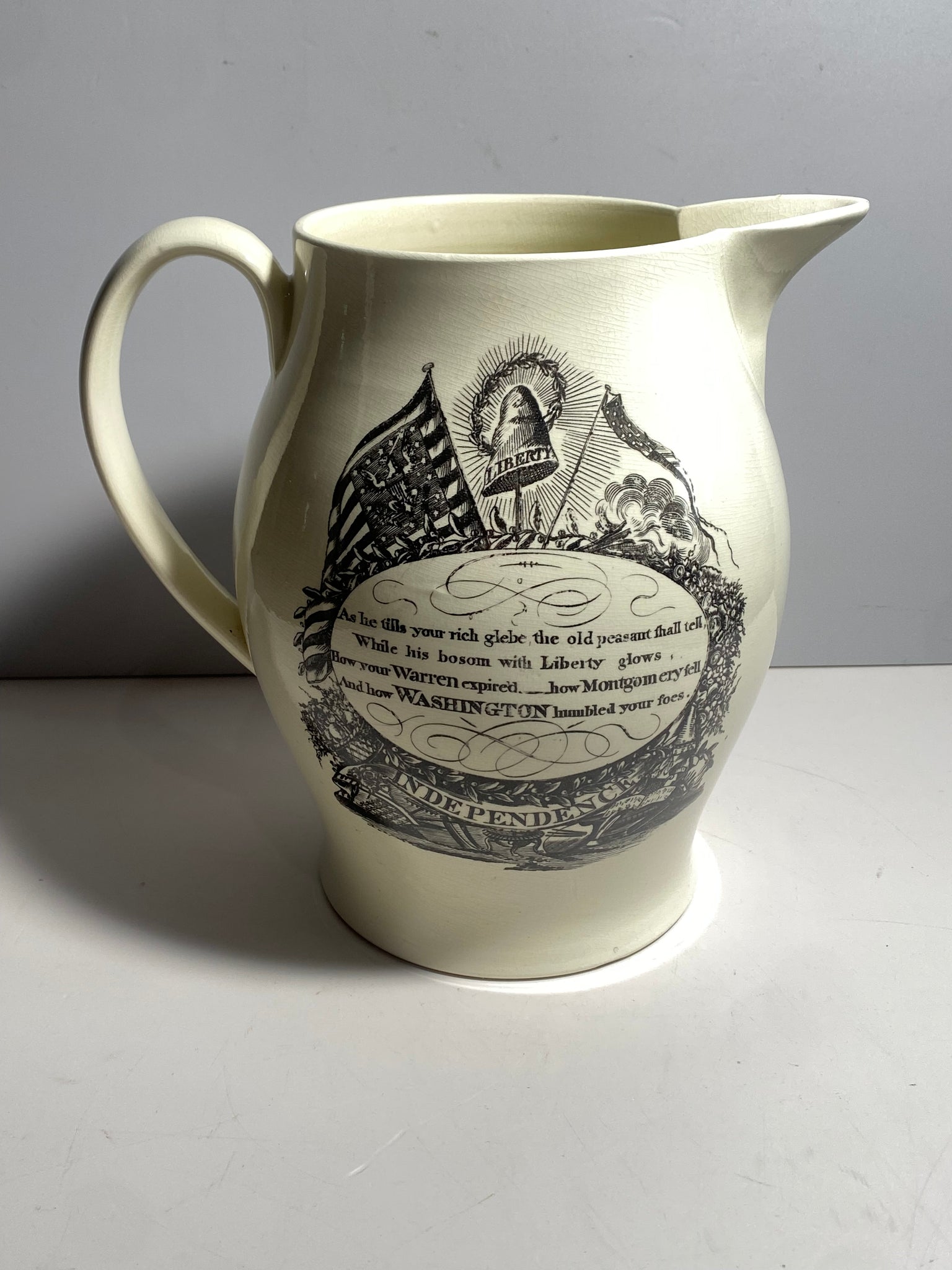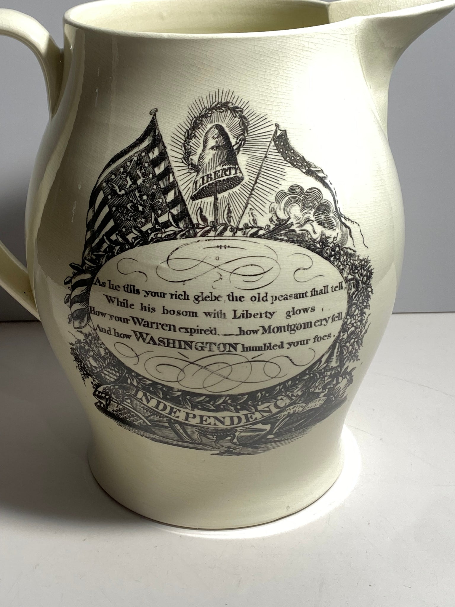 Staffordshire Creamware Liverpool pitcher with a late Eagle Seal of the United States and on the reverse show a Liberty and Independence Washington Poem. In excellent condition with a highly professional repairs to the base that had some glaze exfoliation spots and a small stone pop on the body near the right eagle leg. There were no chips or cracks. It measures 8 1/4” tall by 8 1/2” from the tip of the spout to the handle and dates circa 1800.