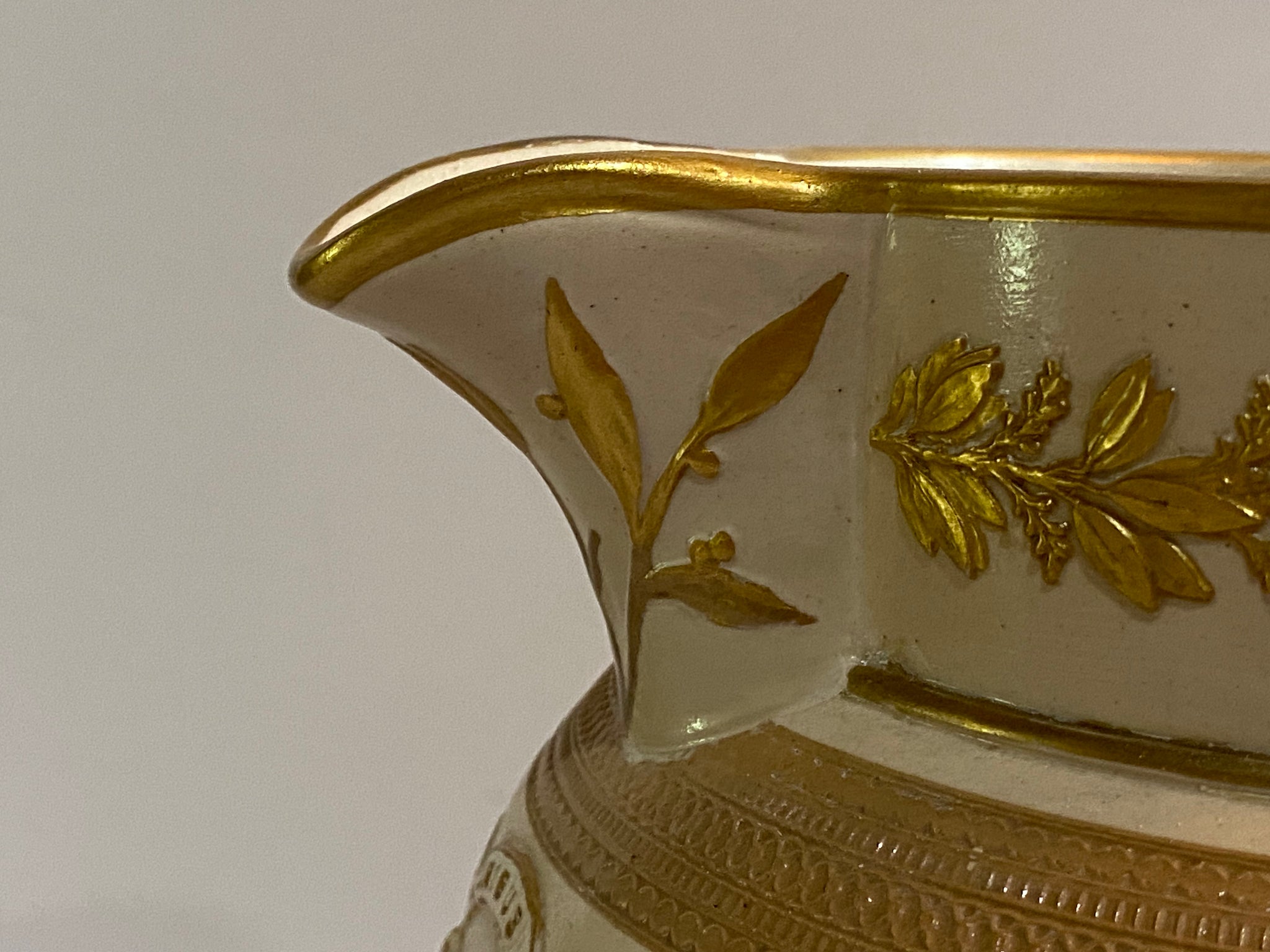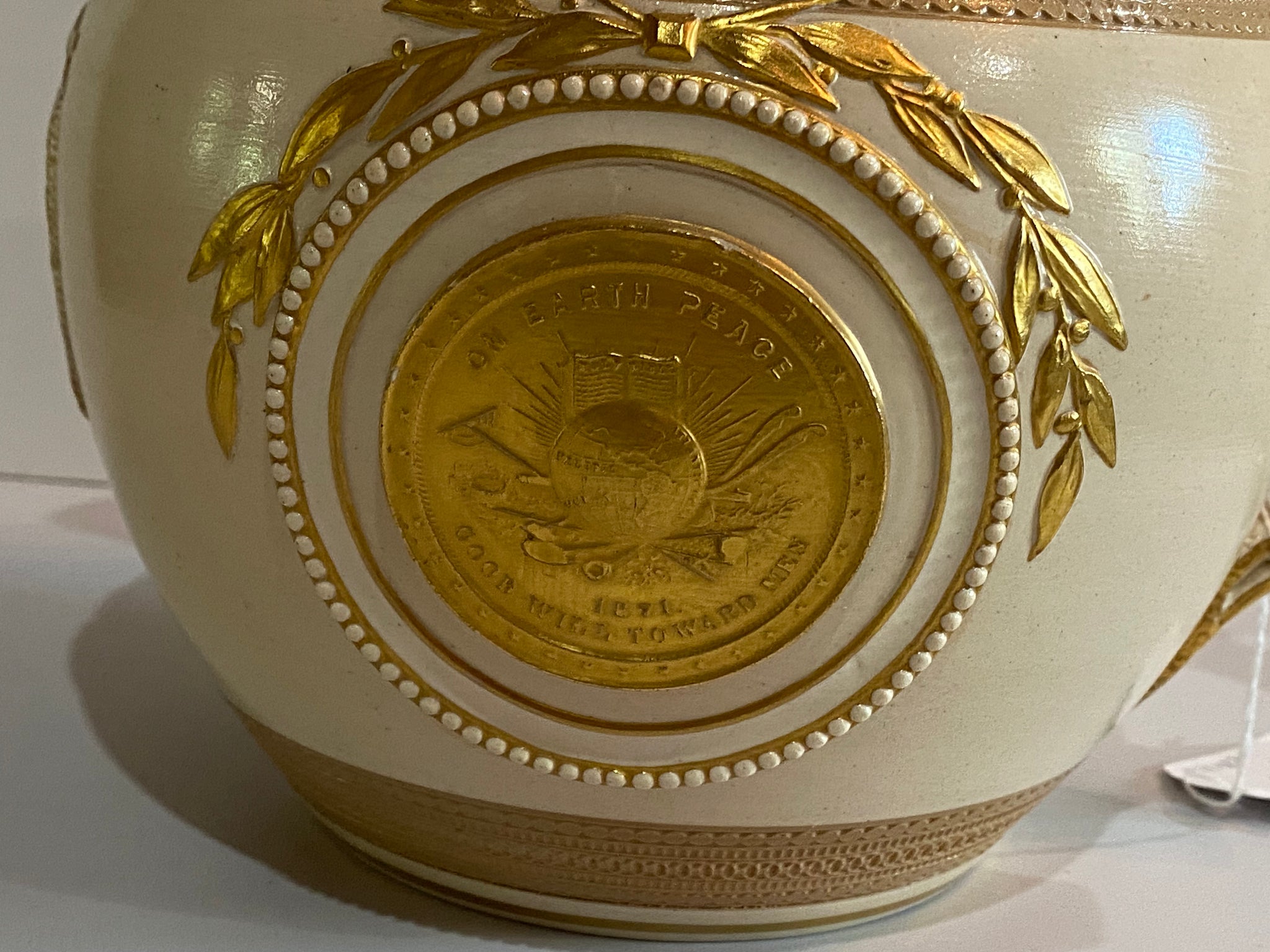 Ulysses S. Grant: 1871 Indian Peace Medal Pitcher by Copeland. Made by Copeland of England. The designs are raised with gilt highlights of the 1871 Grant Indian Peace Medal that appear on either side, while a displayed under the spout is the American eagle with shield. I think there may be a very good repair to the spout but I am not 100 percent sure. It measures 7 1/8” tall.
