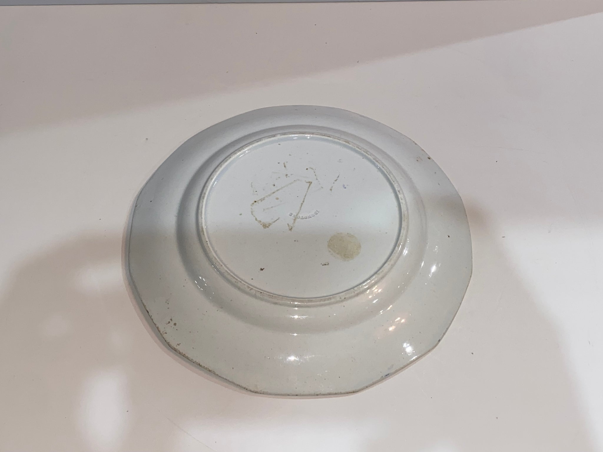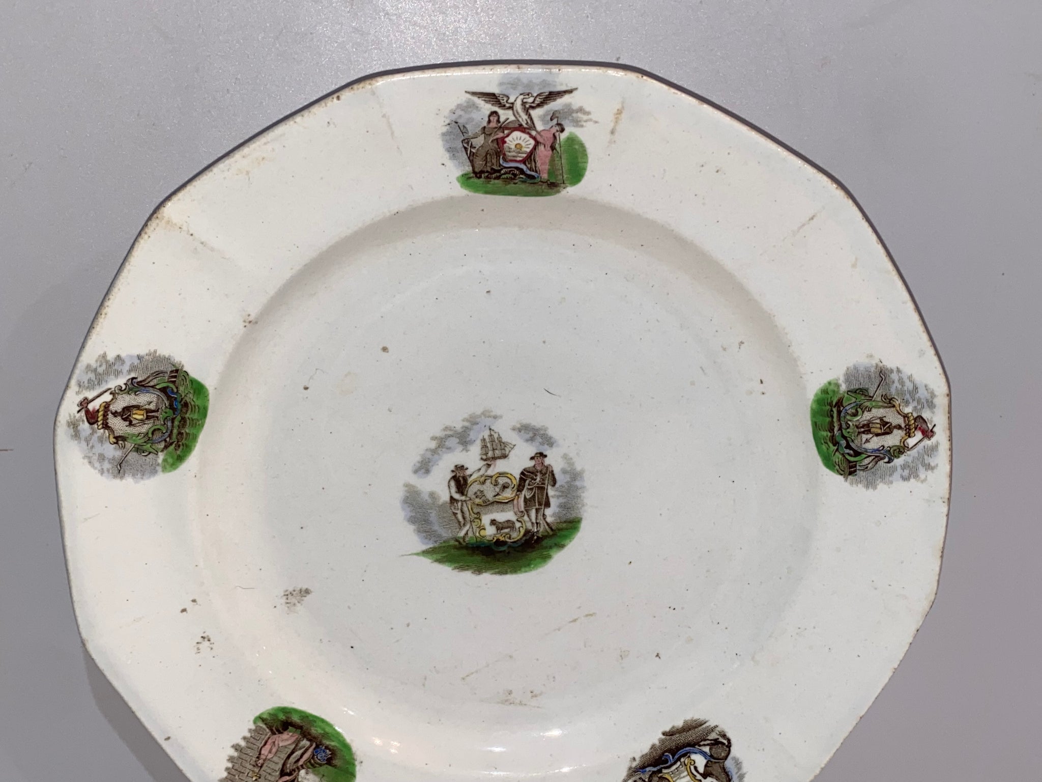 Historical Staffordshire Ironstone plate with polychrome “Arms of 6 States”. By Mellor and Venables. In good condition with no chips, cracks or repairs. It measures 8 1/4” in diameter and dates circa 1840’s.