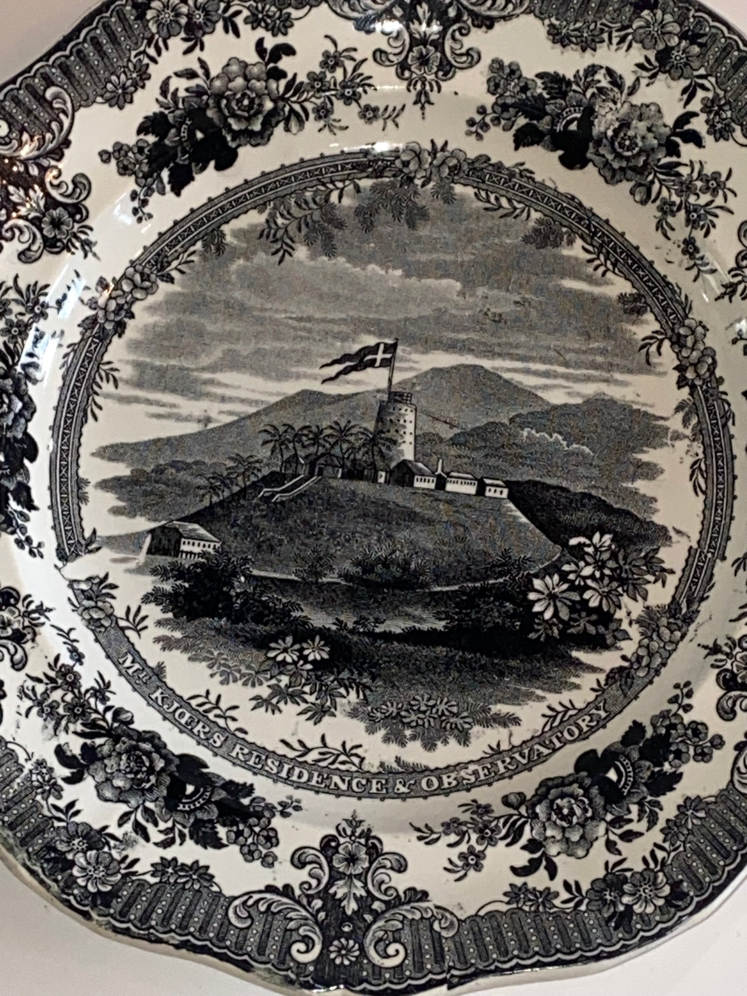 Historical Staffordshire black transfer plate with view of “MR. Kjaers Residence & Observatory Saint Thomas” by an unknown maker. In perfect condition with no chips, cracks or repairs. It measures 9 1/4” in diameter and dates circa 1835. Very Scarce Virgin Island View.