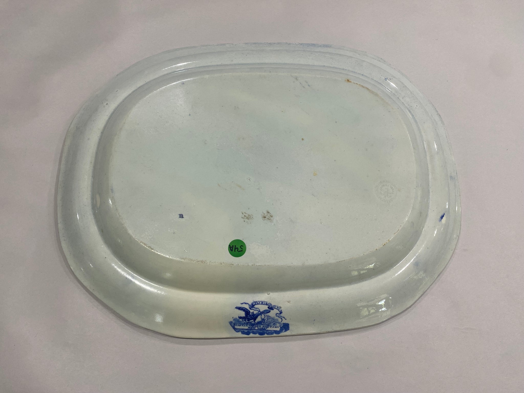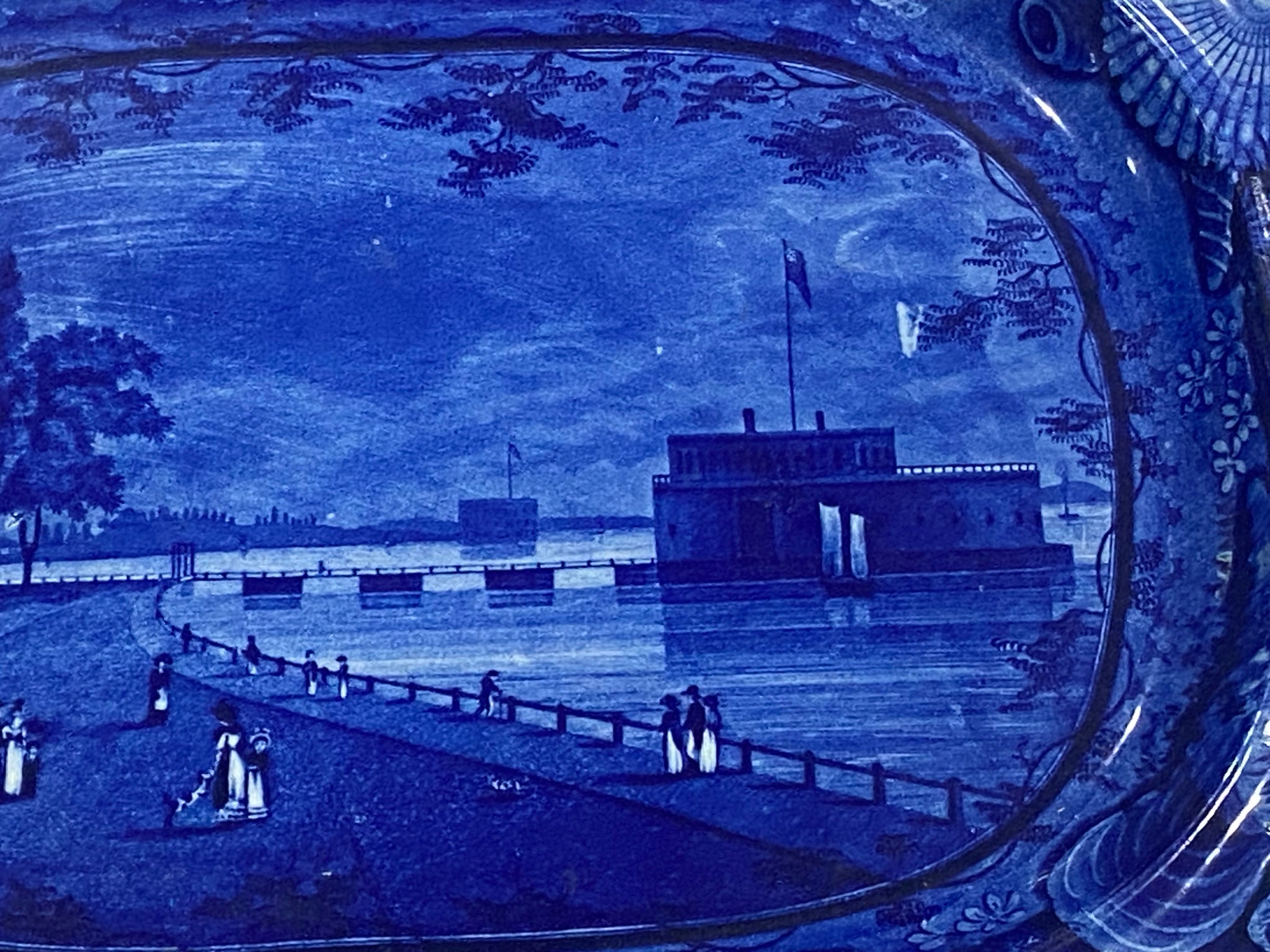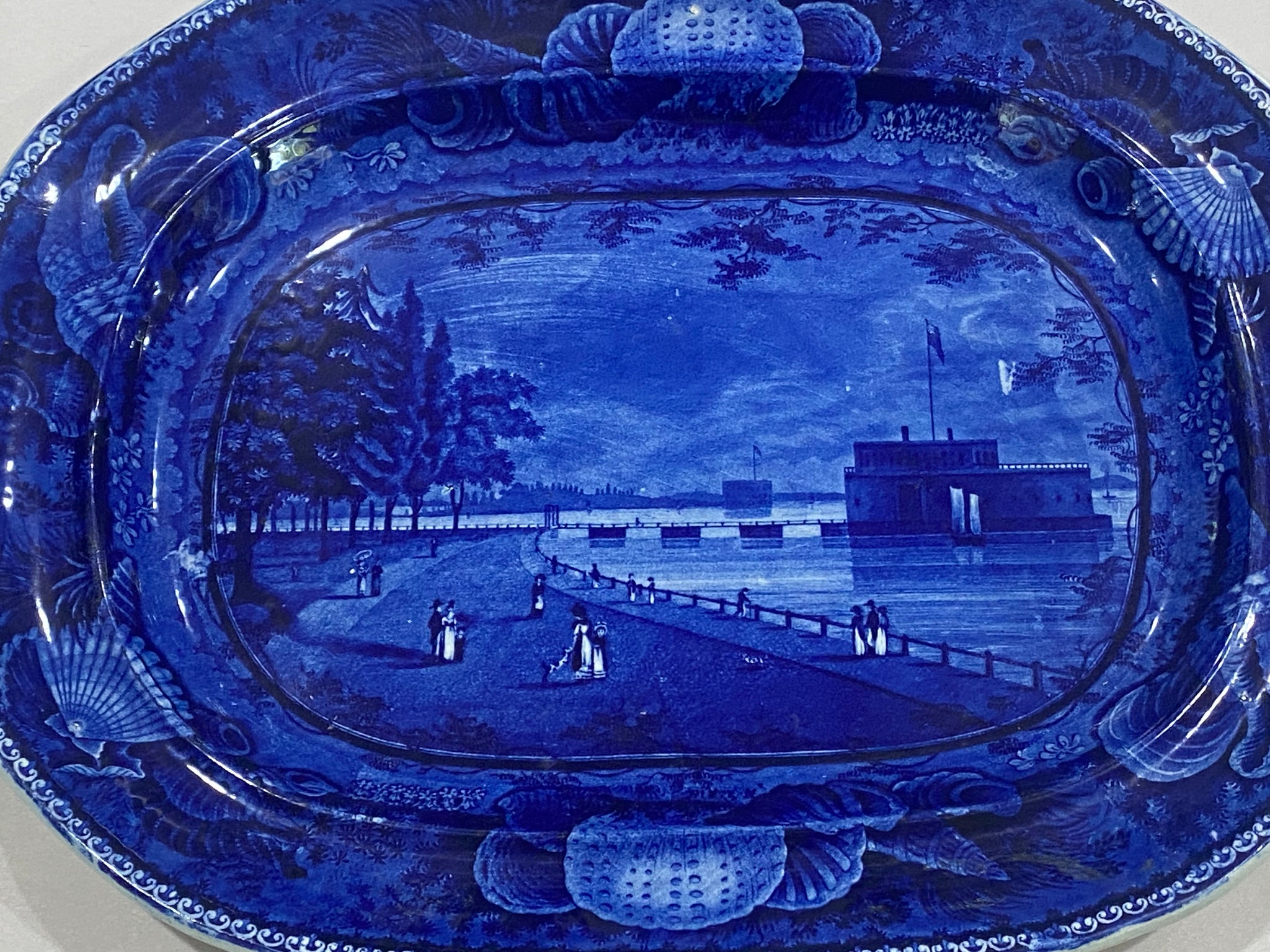 Historical Staffordshire blue platter with a view of Castle Gardens Battery New York by Enoch Wood and Sons. In good condition with a minor short hairline repair. It measures 14 5/8” by 18 3/4” and dates circa 1825.