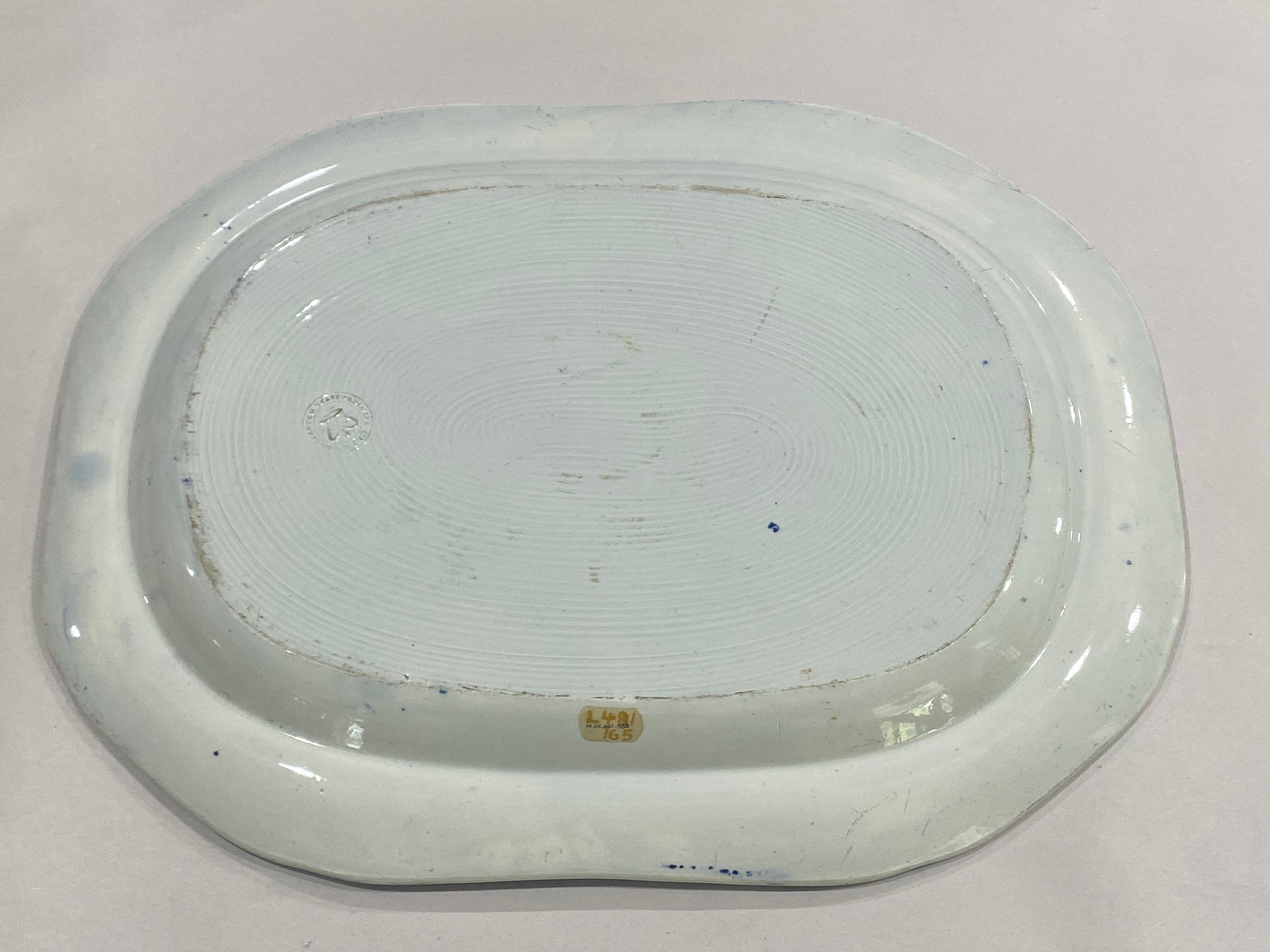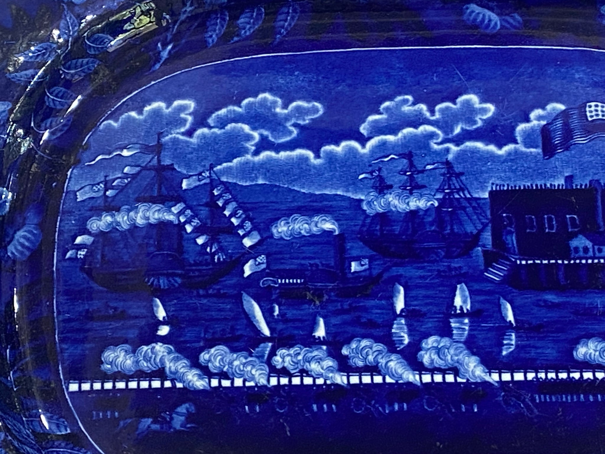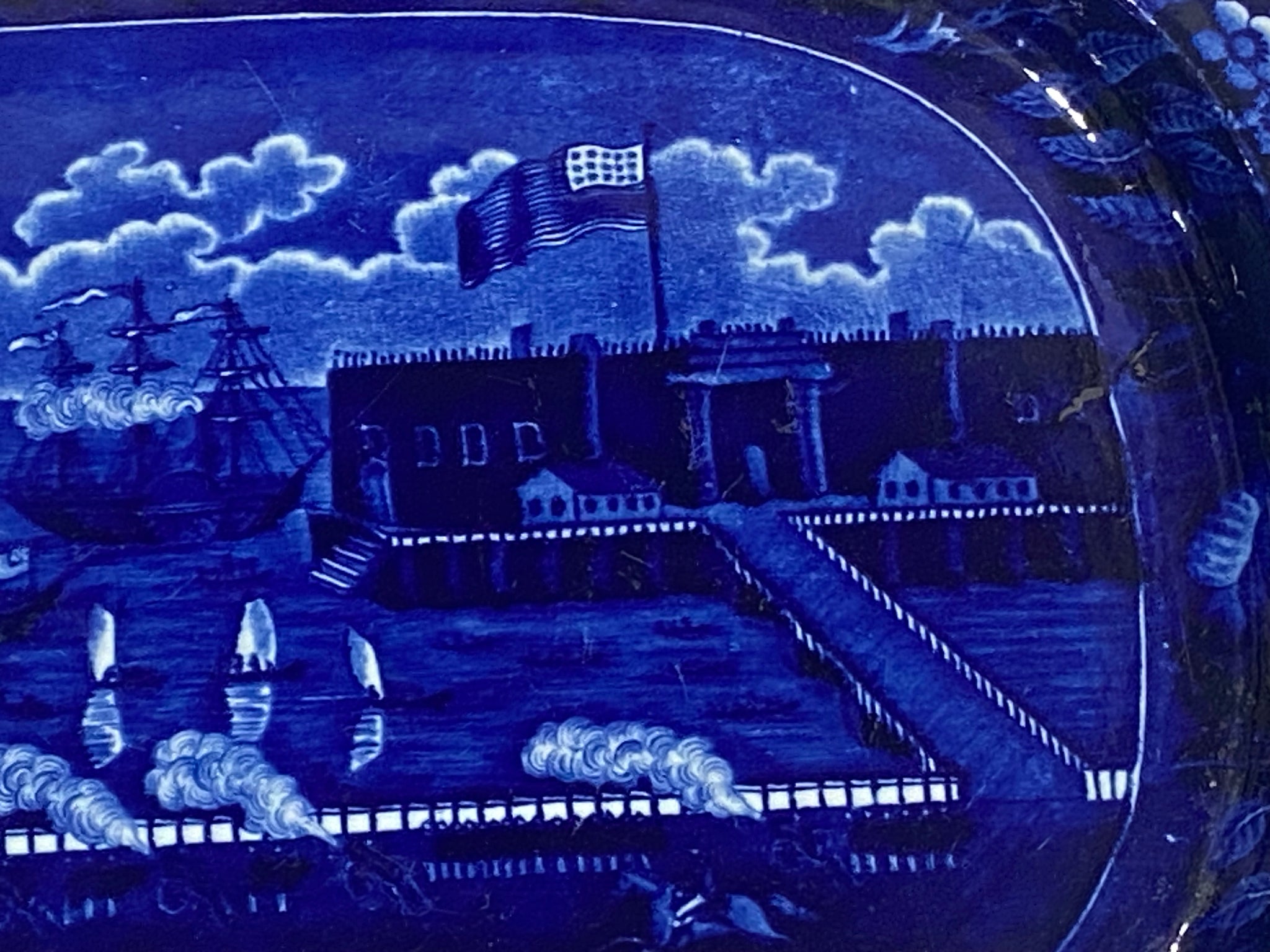 Historical Staffordshire Blue platter in the “Landing of Lafayette” pattern by James and Ralph Clews. In perfect condition with no chips, cracks or repairs. Nice deep blue color while still having a good crisp and clear transfer. It measures 13” by 17” and dates circa 1825.