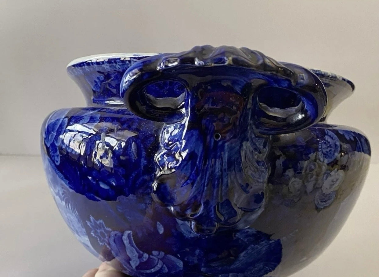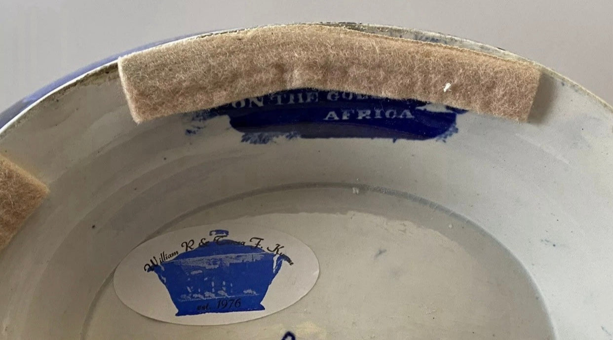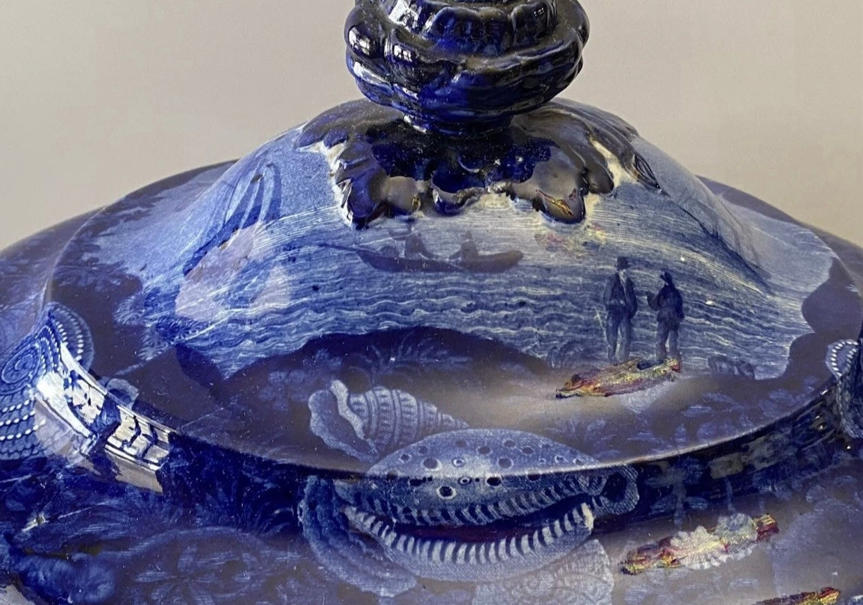 Historical Staffordshire blue soup tureen with a view of” The Dix Cove On The Gold Coast of Africa” from Enoch Wood & Sons Irregular Shell border series. Extremely rare centerpiece and one of the hardest pieces to find in the series. This tureen has beautiful crisp transfers and great contrast. Spectacular condition with minor crows foot on the side of the body that would clean out and disappear. The lid has a minor professional chip repair on the underside of the lid rim that is invisible. It measures 14 3/4” across the handles by 11 3/8” tall and dates circa 1825.