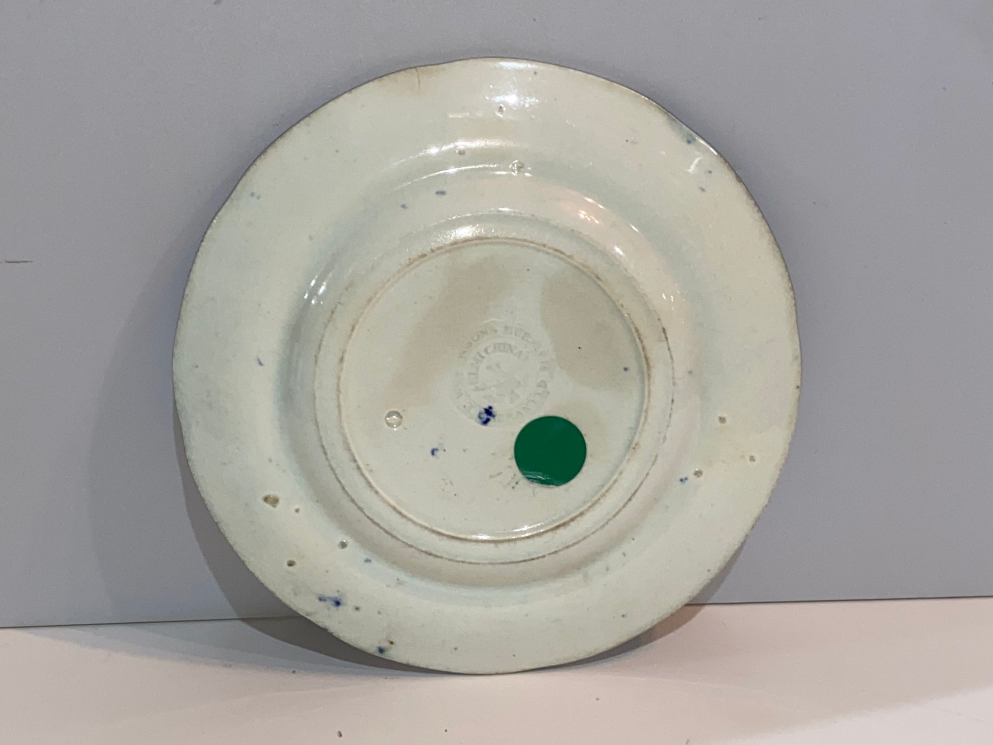 Historical Staffordshire blue small plate in the Macdonough’s Victory pattern by Enoch Wood and Sons. In perfect condition with no chips, cracks or repairs. It measures 6 5/8” in diameter and dates circa 1825.