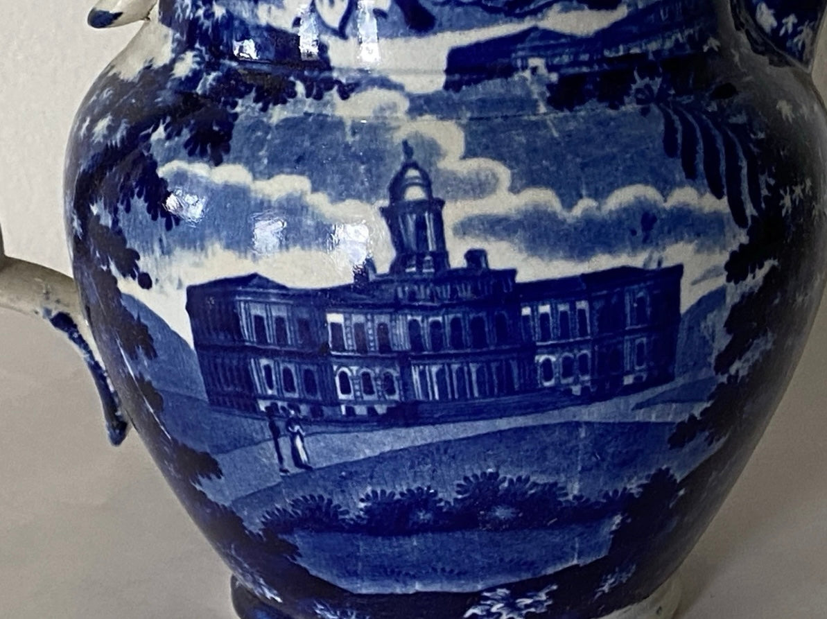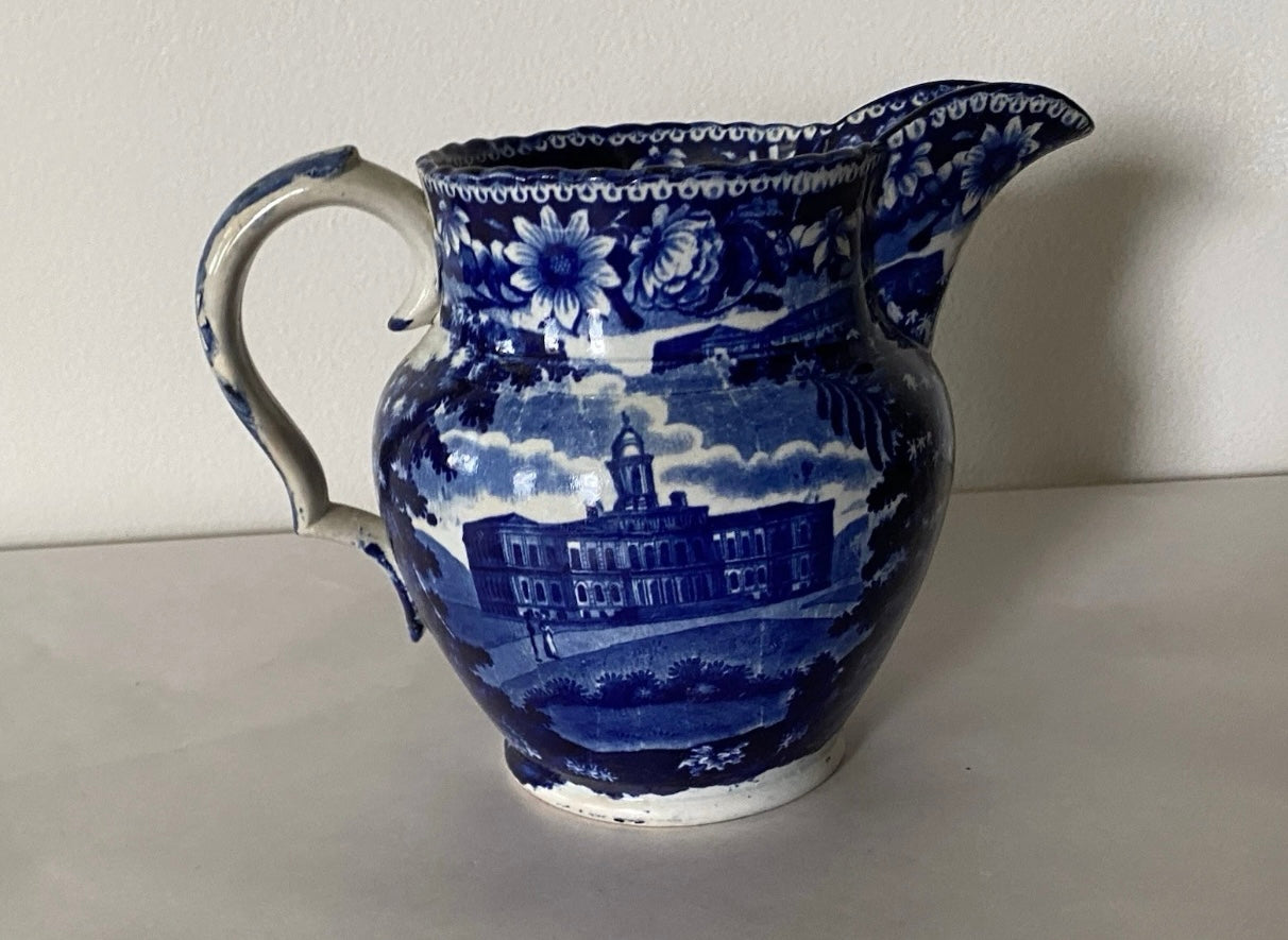 Historical Staffordshire pitcher with views of the Insane Asylum, New York to one side and New York City Hall to other, each with two figures in foreground, from the Flower and Foliage series. Impressed "CLEWS" on the base. I very good condition with a highly professional repair to the spout tip being broken and reattached. It measures 6 1/4 tall and dates circa 1825.