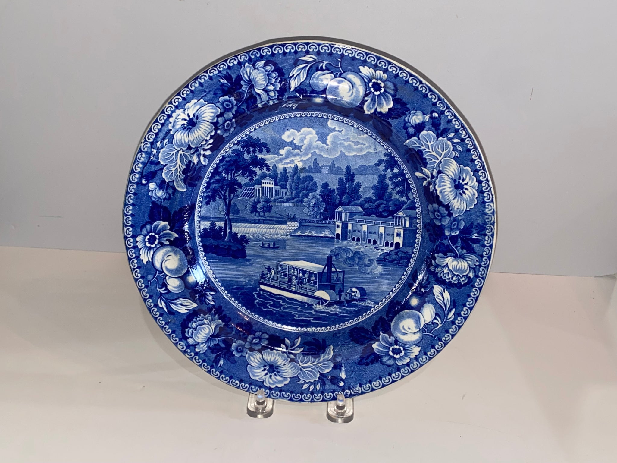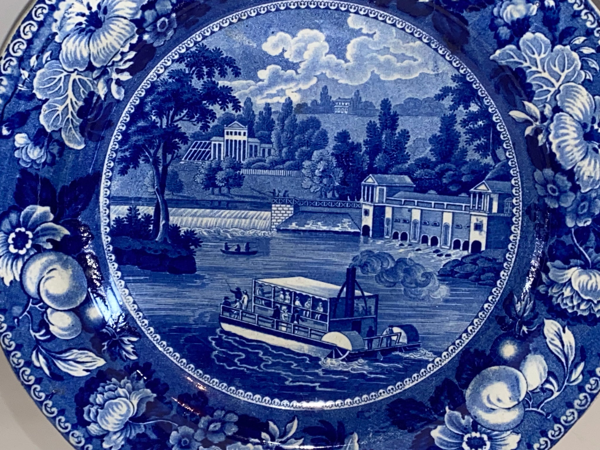 Historical Staffordshire Blue Plate Water Works Philadelphia with Sternwheeler