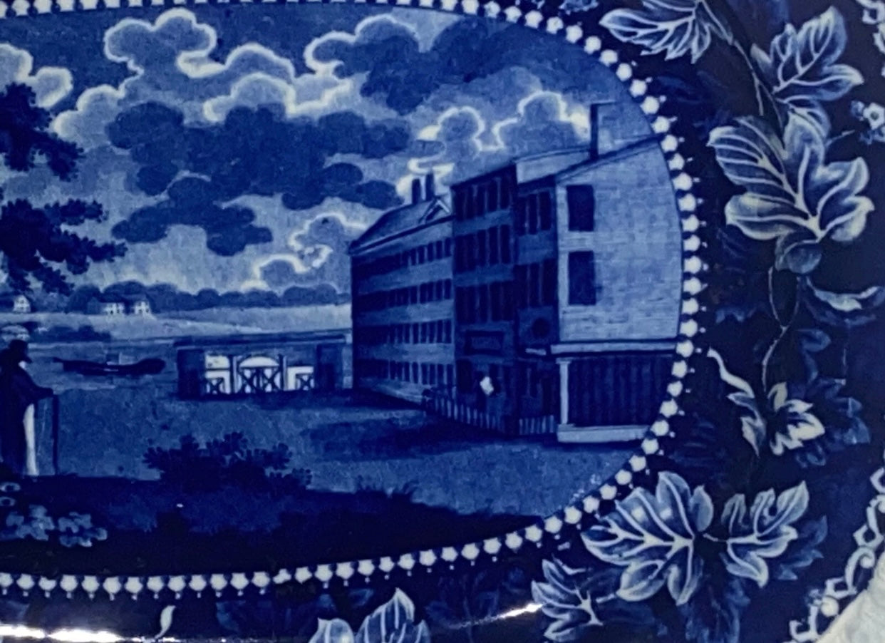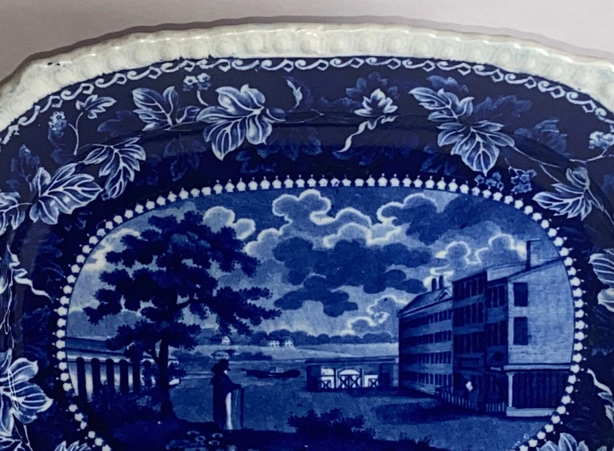 Historical Staffordshire blue view of Brooklyn Ferry platter by Stevenson. Appears as perfect with a few short professional hairline repairs that are invisible. Measures 8 1/4” by 10 5/8” and dates circa 1825. Very scarce view to find.