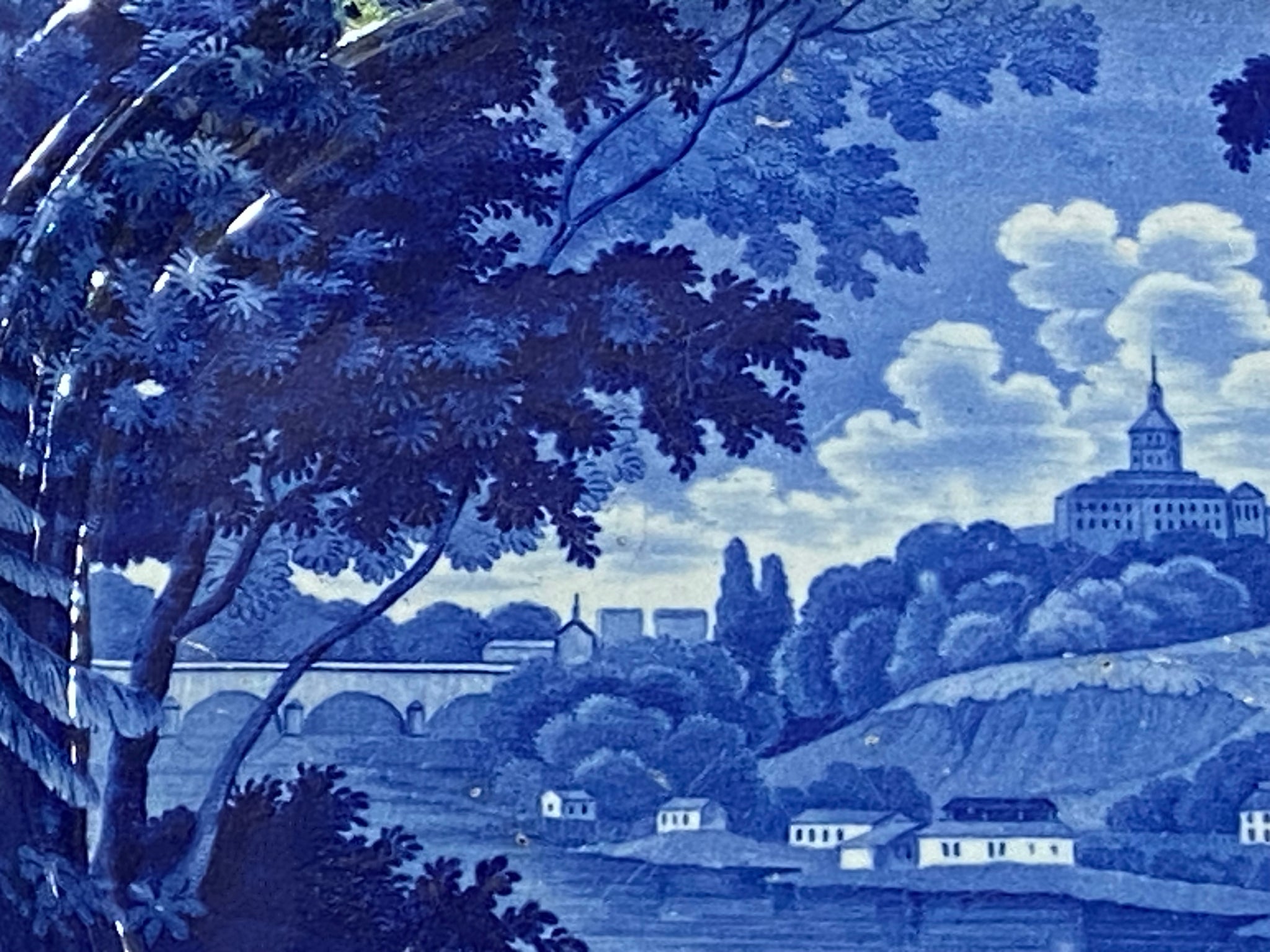 Historical Staffordshire blue platter from the Italian Scenery Series with a view of “Turin”. In very good condition with no chips, cracks or repairs but does have some very minor utensil marks. It measures 14 1/2” by 18 1/2” and dates circa 1825.