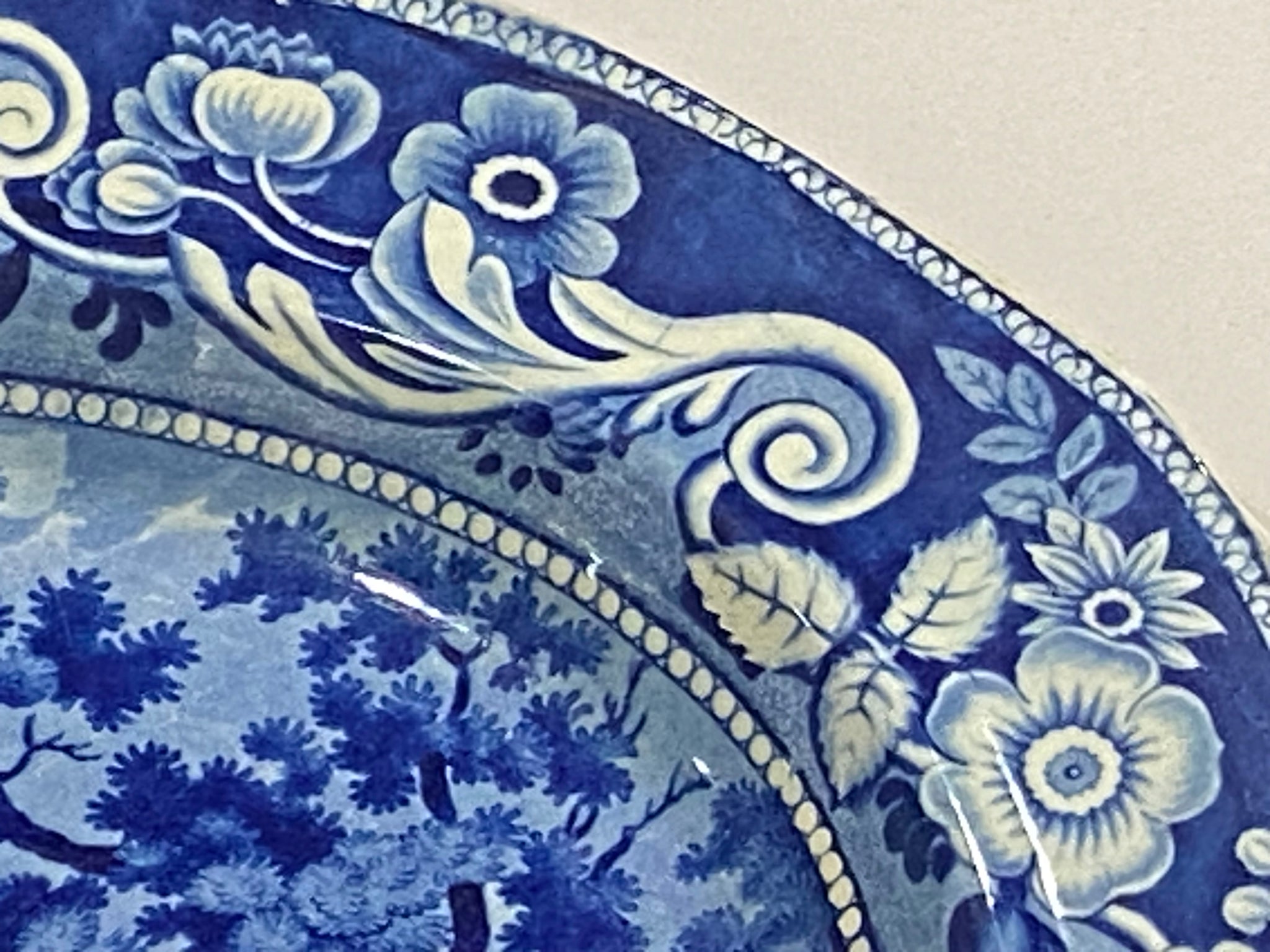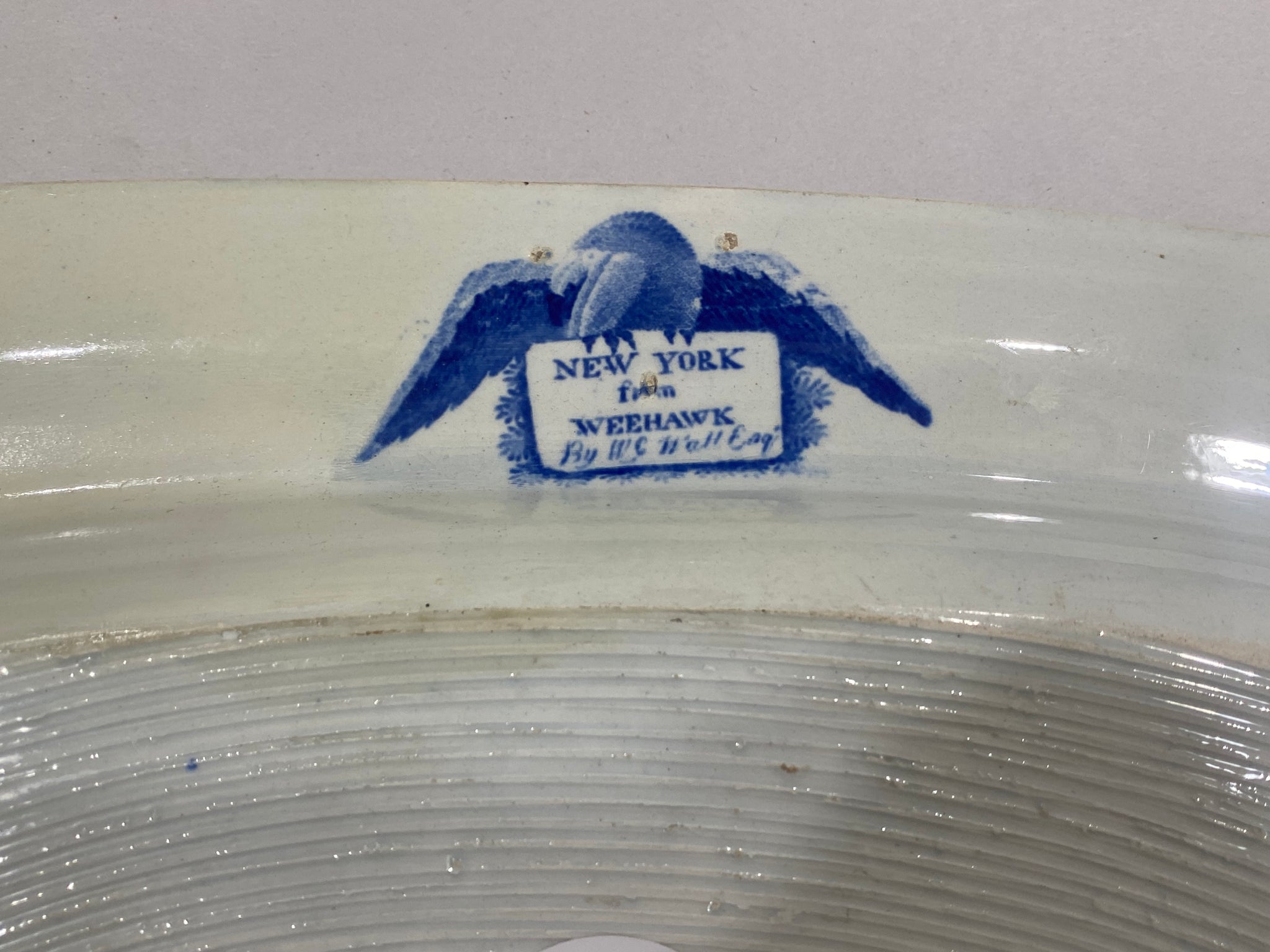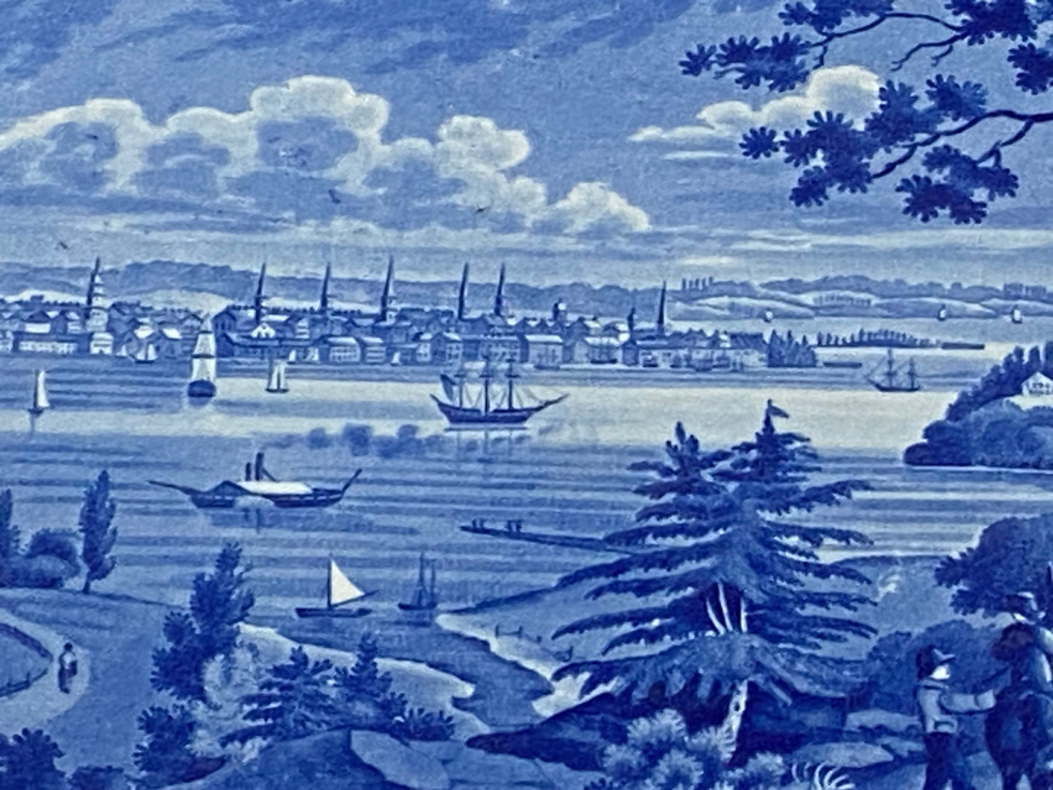 Historical Staffordshire blue platter with view of “New York From Weehawken” by Andrew Stevenson. This platter displays very well with a slightly older hairline repairs that have changed color slightly on the back but still looks great on the front. A very hard view to get in this series. It measures 14 1/4” by 18 1/2” and dates circa 1825.