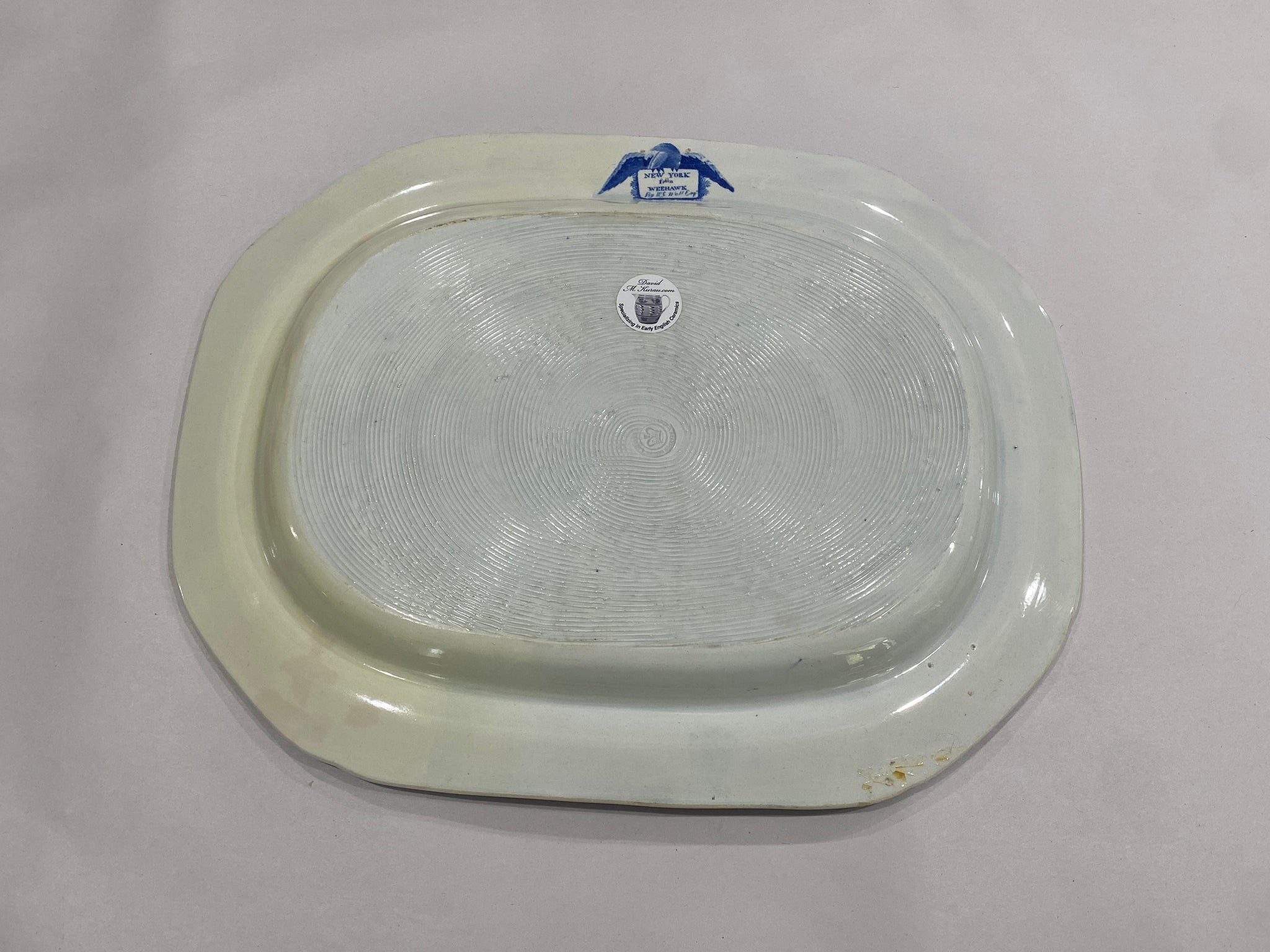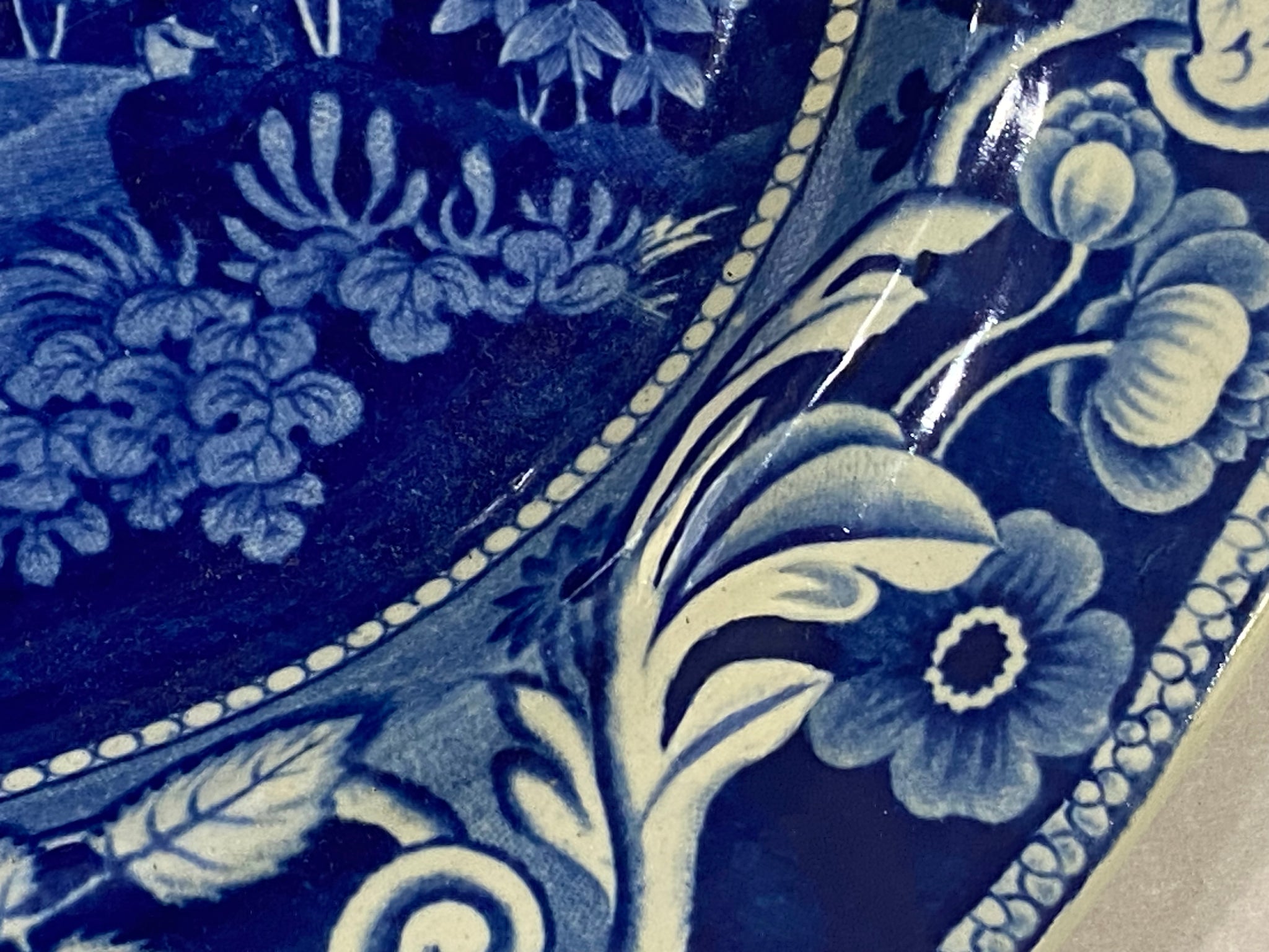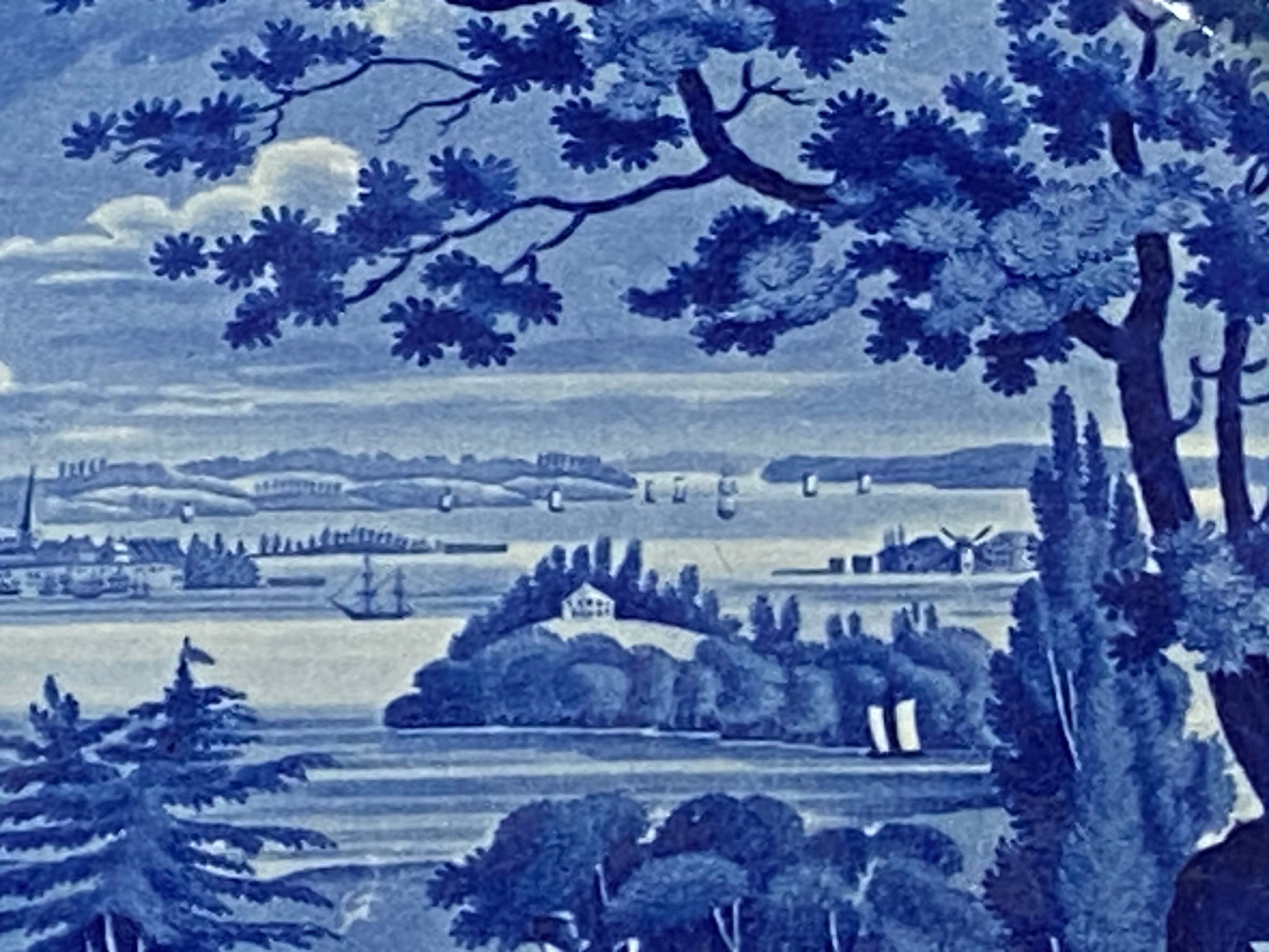 Historical Staffordshire blue platter with view of “New York From Weehawken” by Andrew Stevenson. This platter displays very well with a slightly older hairline repairs that have changed color slightly on the back but still looks great on the front. A very hard view to get in this series. It measures 14 1/4” by 18 1/2” and dates circa 1825.