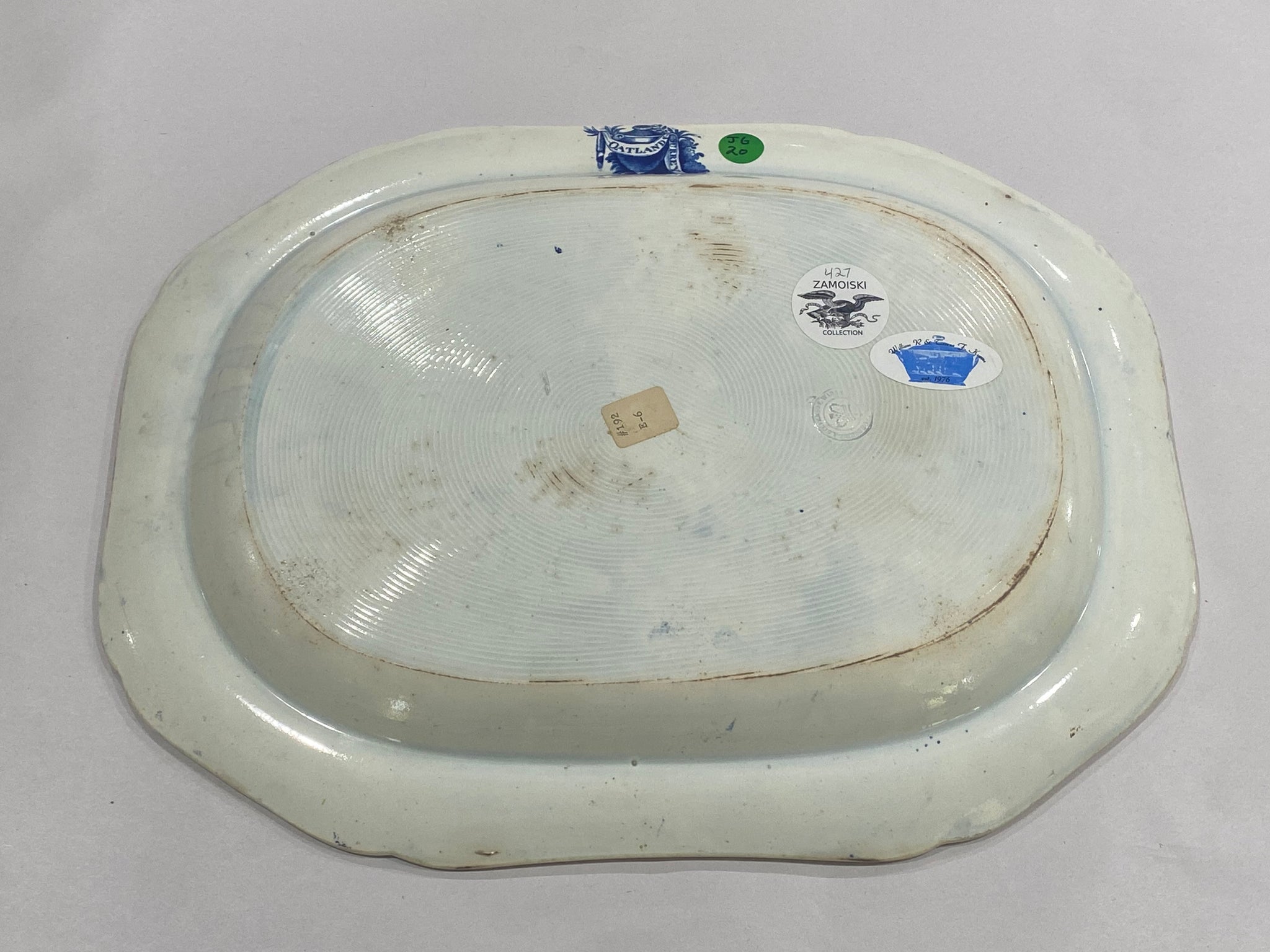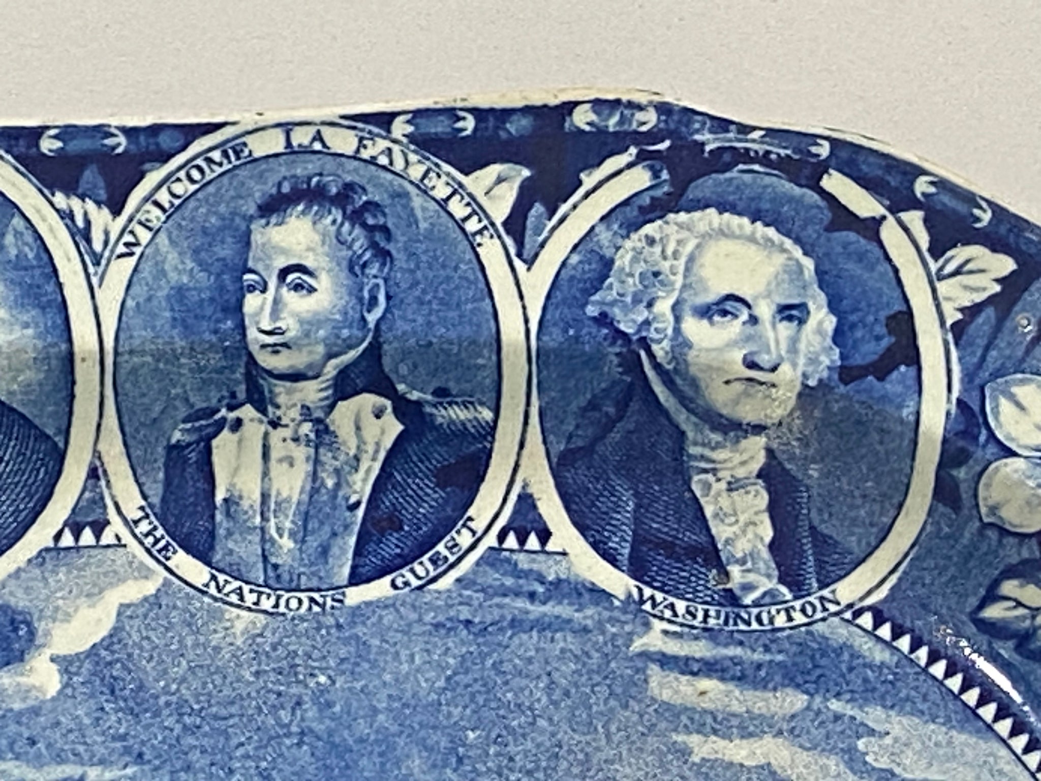Historical Staffordshire blue platter with a view of “Oatlands Surrey” with 4 medallions of Washington, Lafayette, Jefferson and Clinton. With a snippet of View of the Canal at Aqueduct Bridge at Little Falls. In perfect condition with no chips, cracks or repairs and appears unused. It measures 12 1/4” by 16 1/8” and dates circa 1825. Ex Buddy Zamoiski Collection.