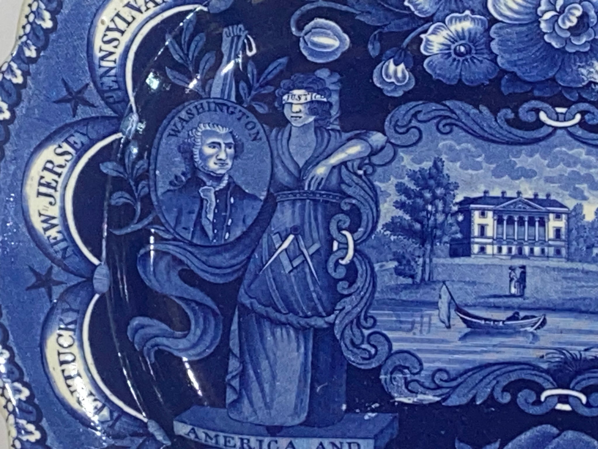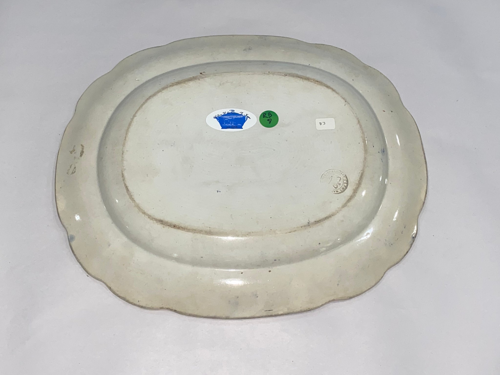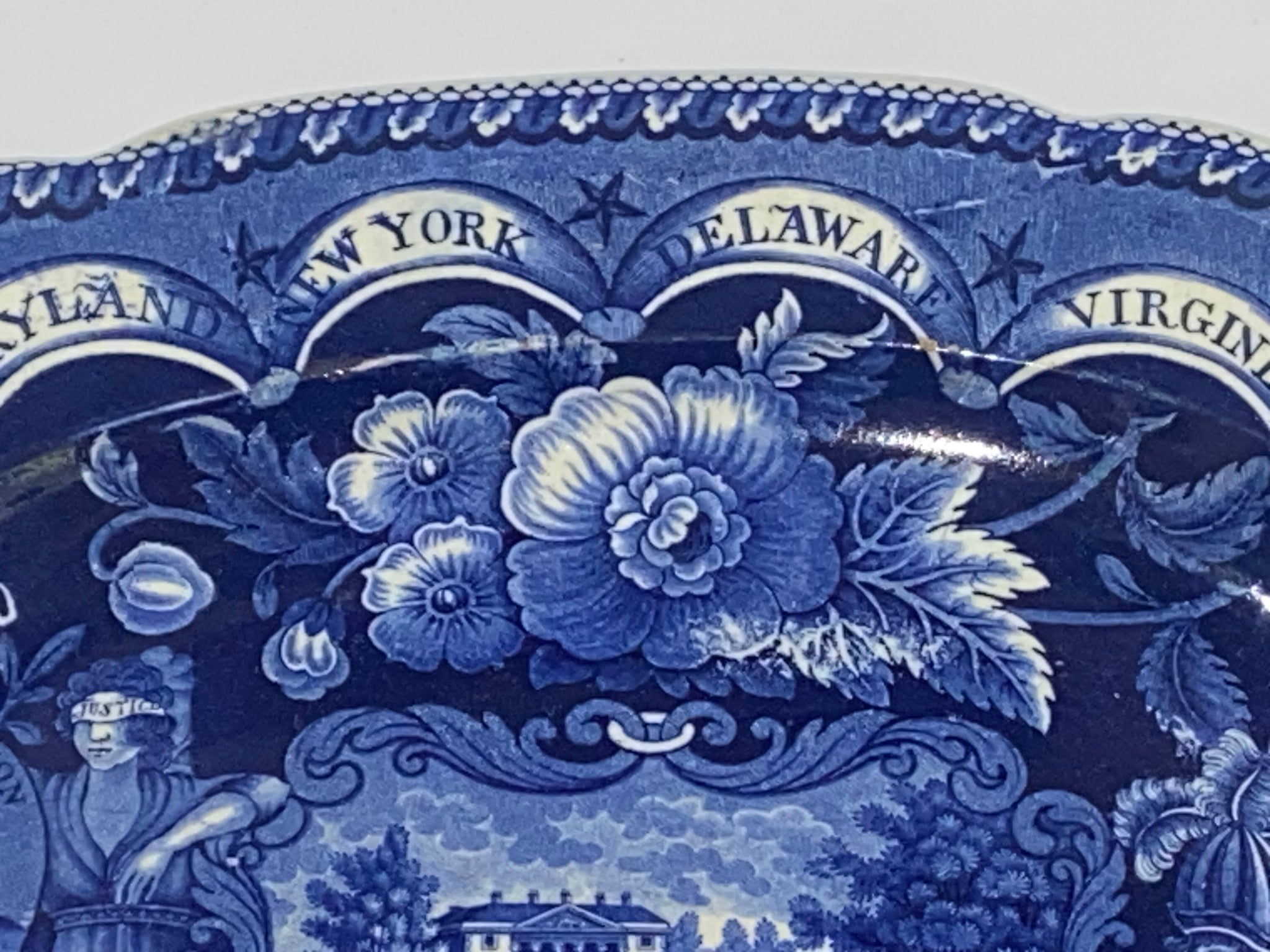 Historical Staffordshire Blue platter in the “States” pattern by James and Ralph Clews. Perfect condition with no chips, cracks or repairs and appears virtually unused. It measures 12 1/4” by 14 5/8” and dates circa 1825.