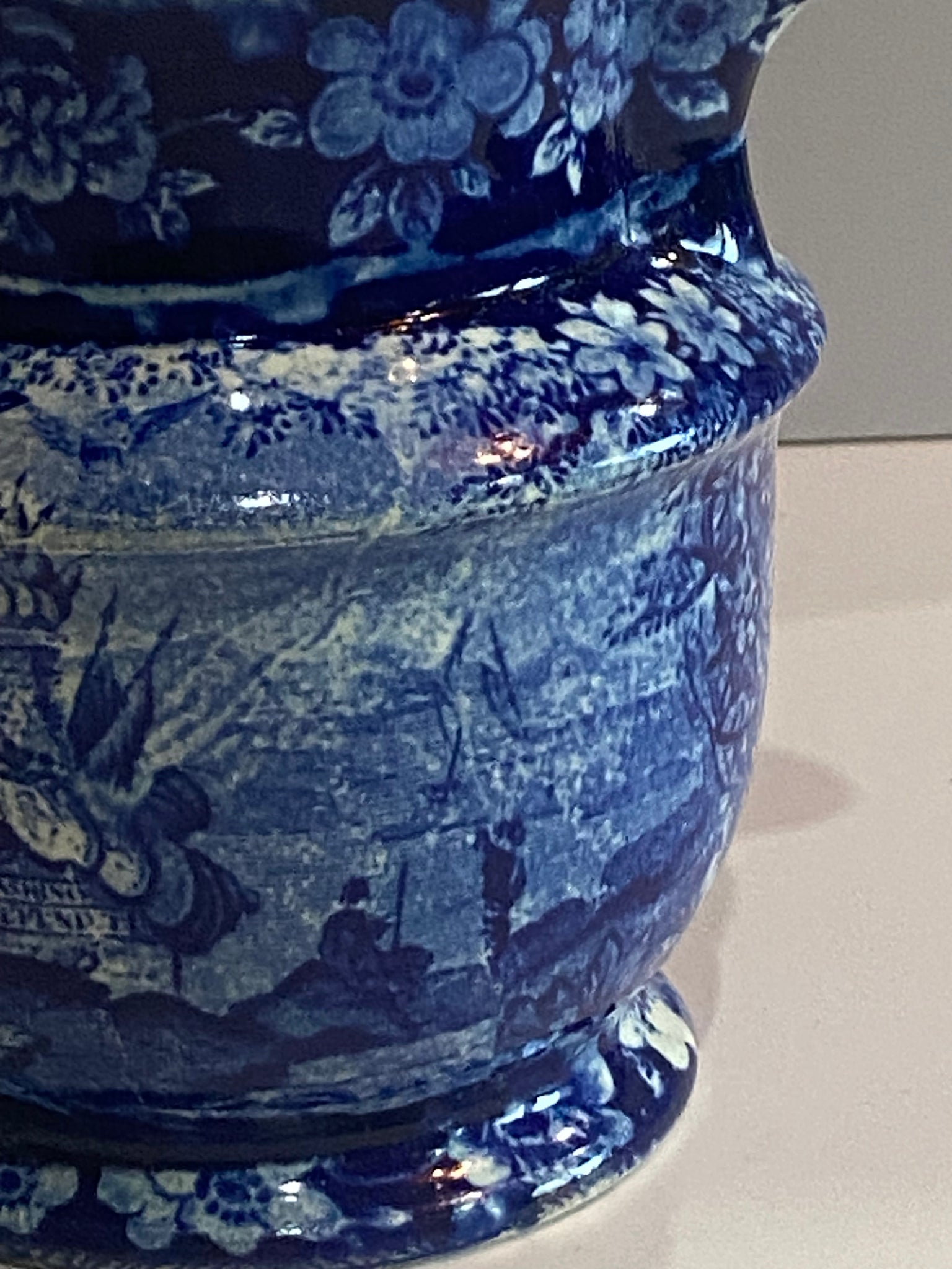 Historical Staffordshire blue small pitcher in the Navel Hero’s pattern. This piece displays very well with professional repairs to some base hairlines and spout chip. Done invisibly and ready to put in your collection. It measures 6 1/2” from the tip of the spout to the handle by 5 1/8” tall and dates circa 1825.