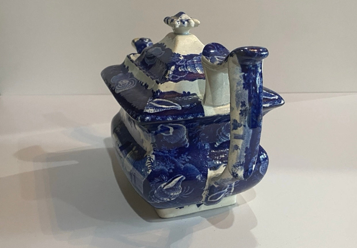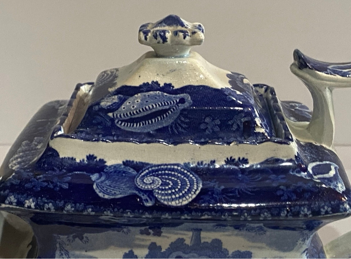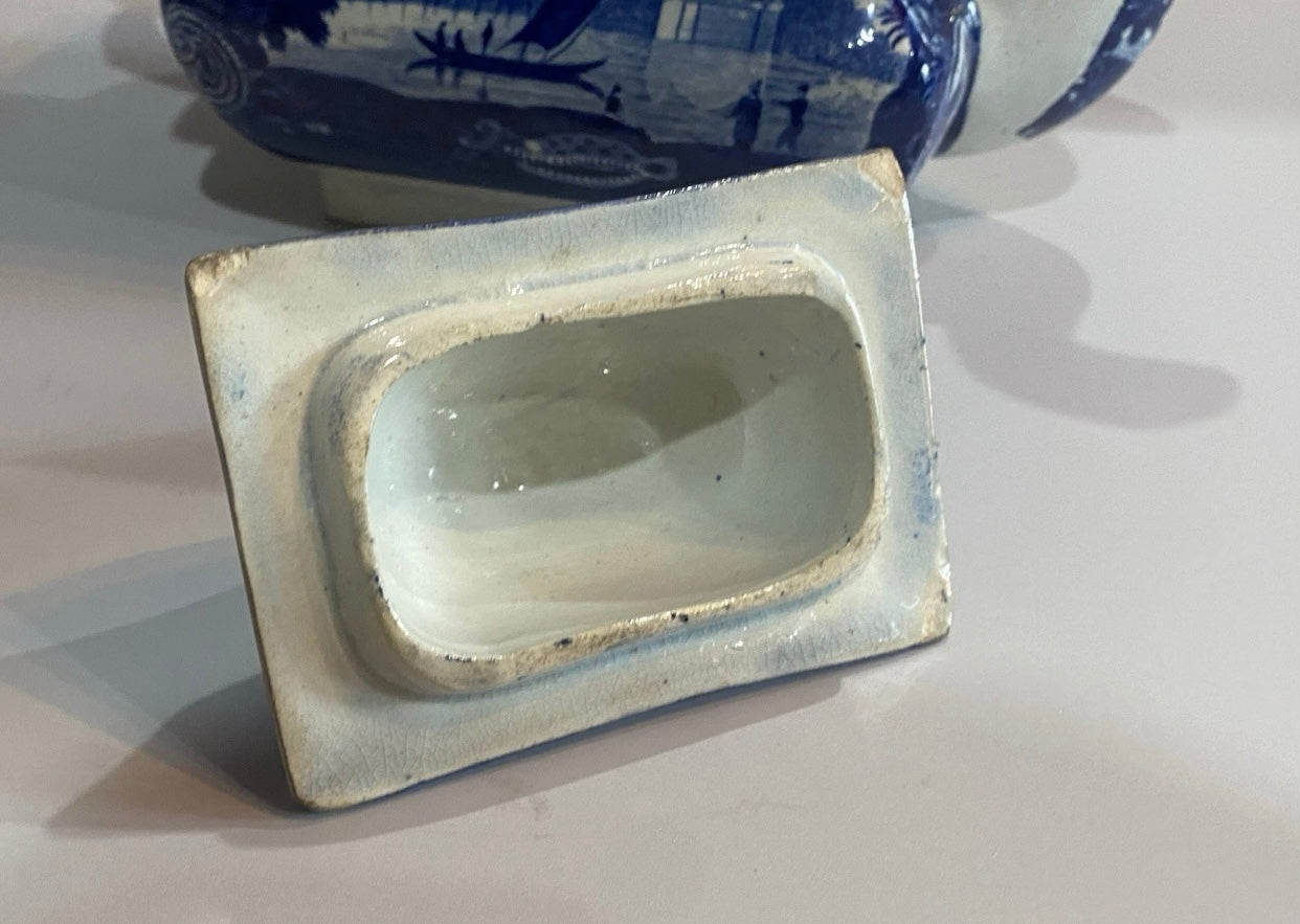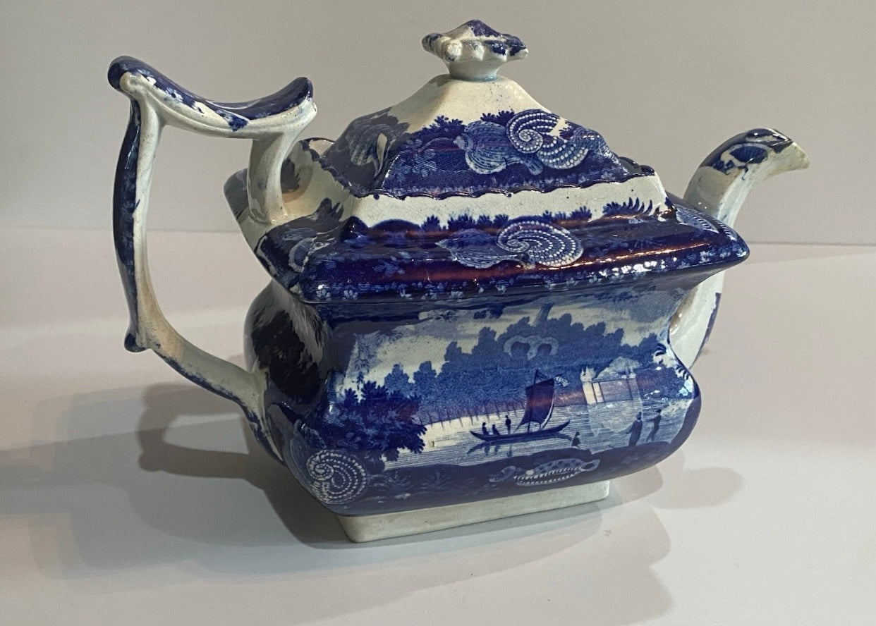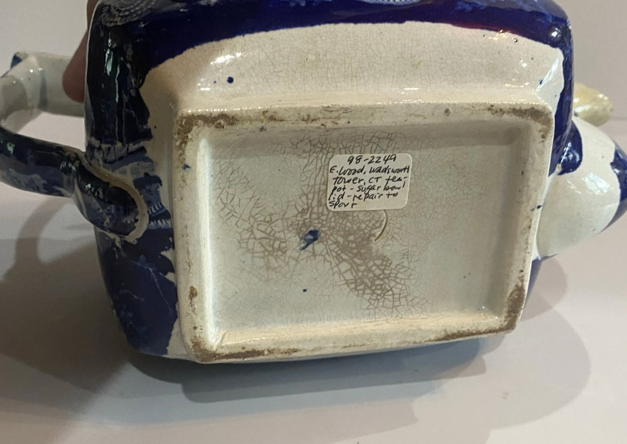Historical Staffordshire blue teapot in the “Wadsworth Tower Connecticut” pattern by Stevenson. This piece displays well with a slightly older repair to the spout tip and lid corner. Shows light staining and some minor chips on the underside of the lid as well. It measures 6” tall by 9 3/4” from the spout tip to the handle and dates circa 1825.