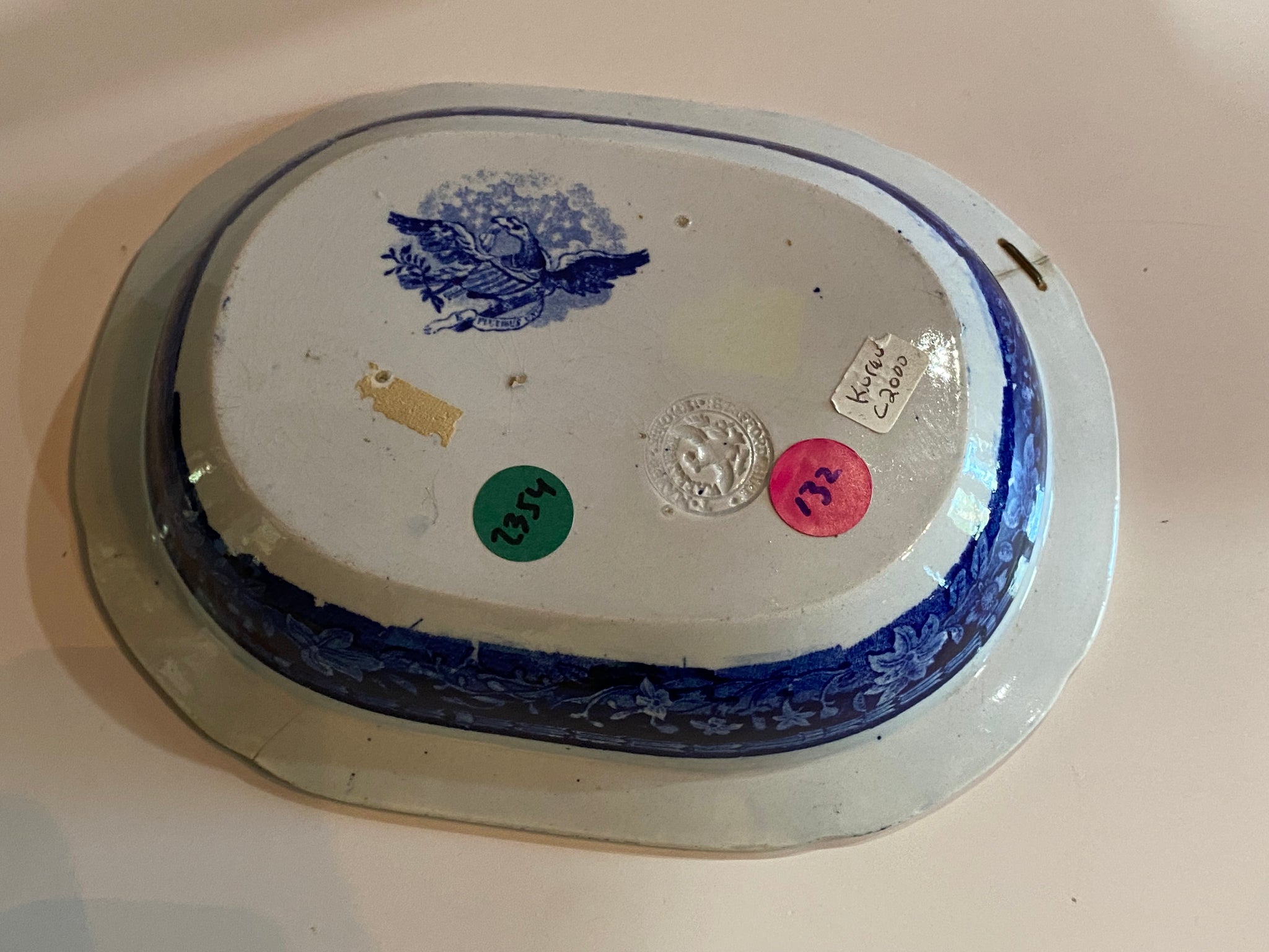 Historical Staffordshire blue vegetable dish with the “Arms of Massachusetts” by Thomas Mayer. Displays well with 2 short hairlines, one of which is rivet repaired. It measures 6 3/4” by 8 3/4” and dates circa 1825.