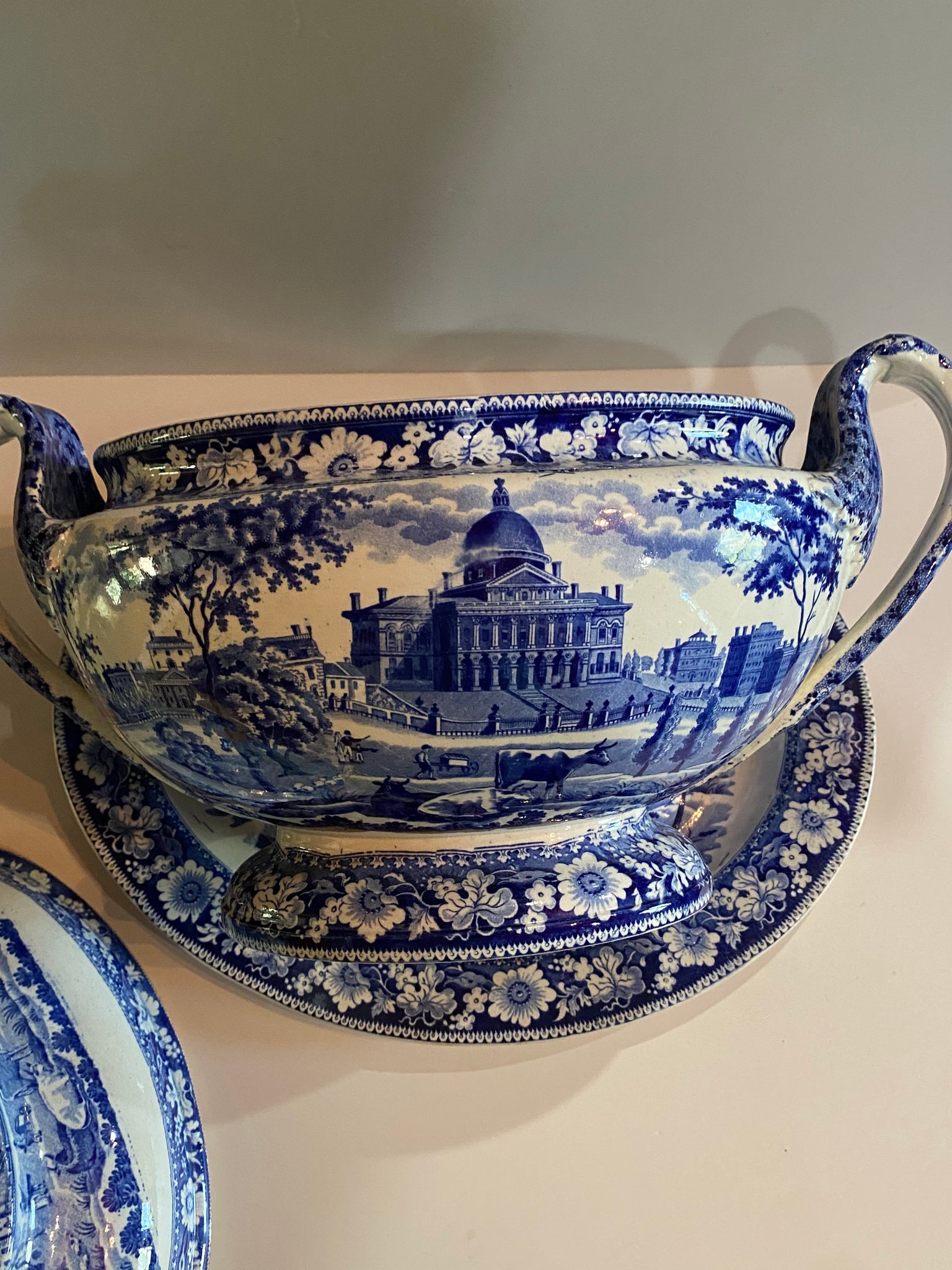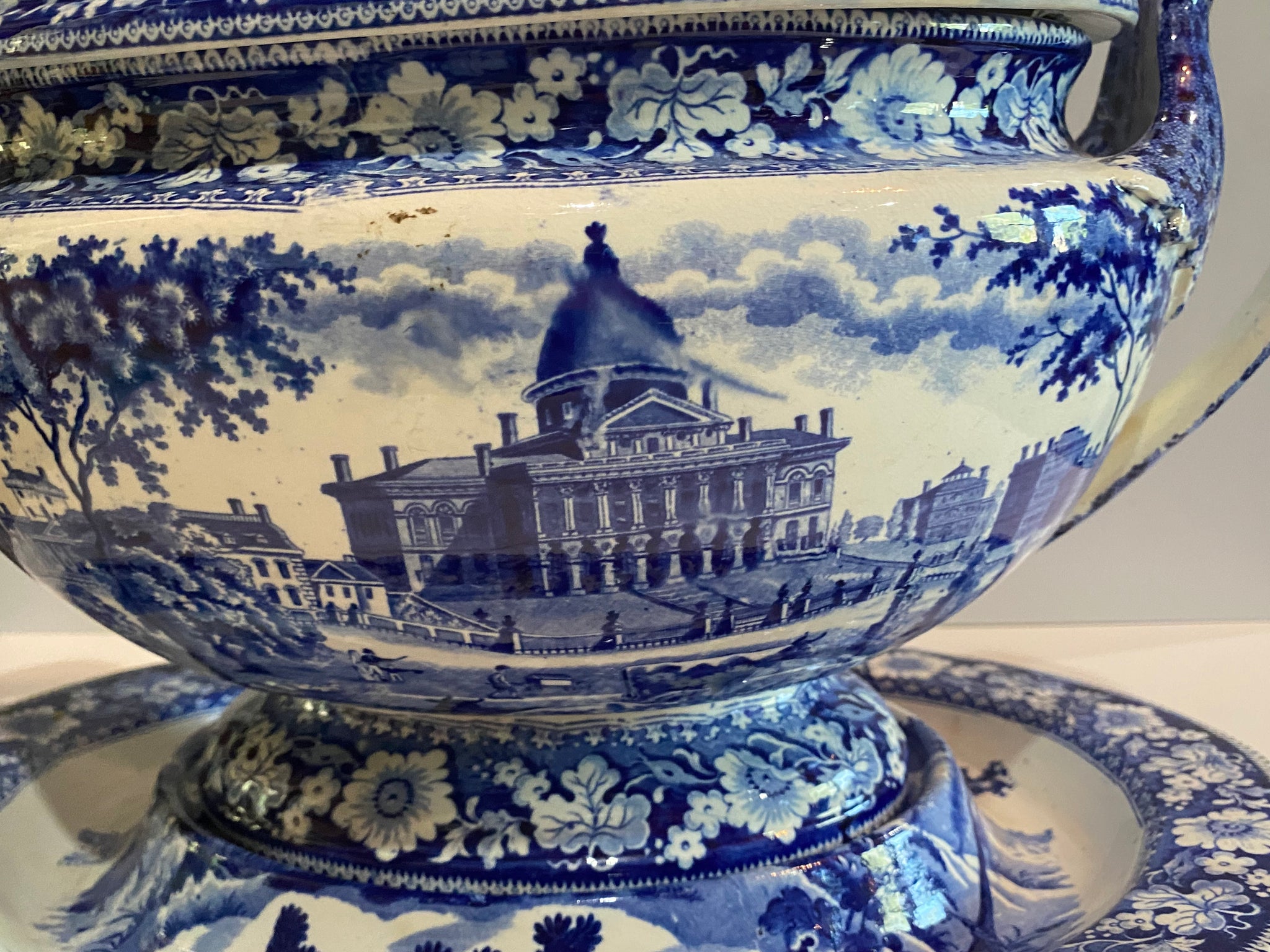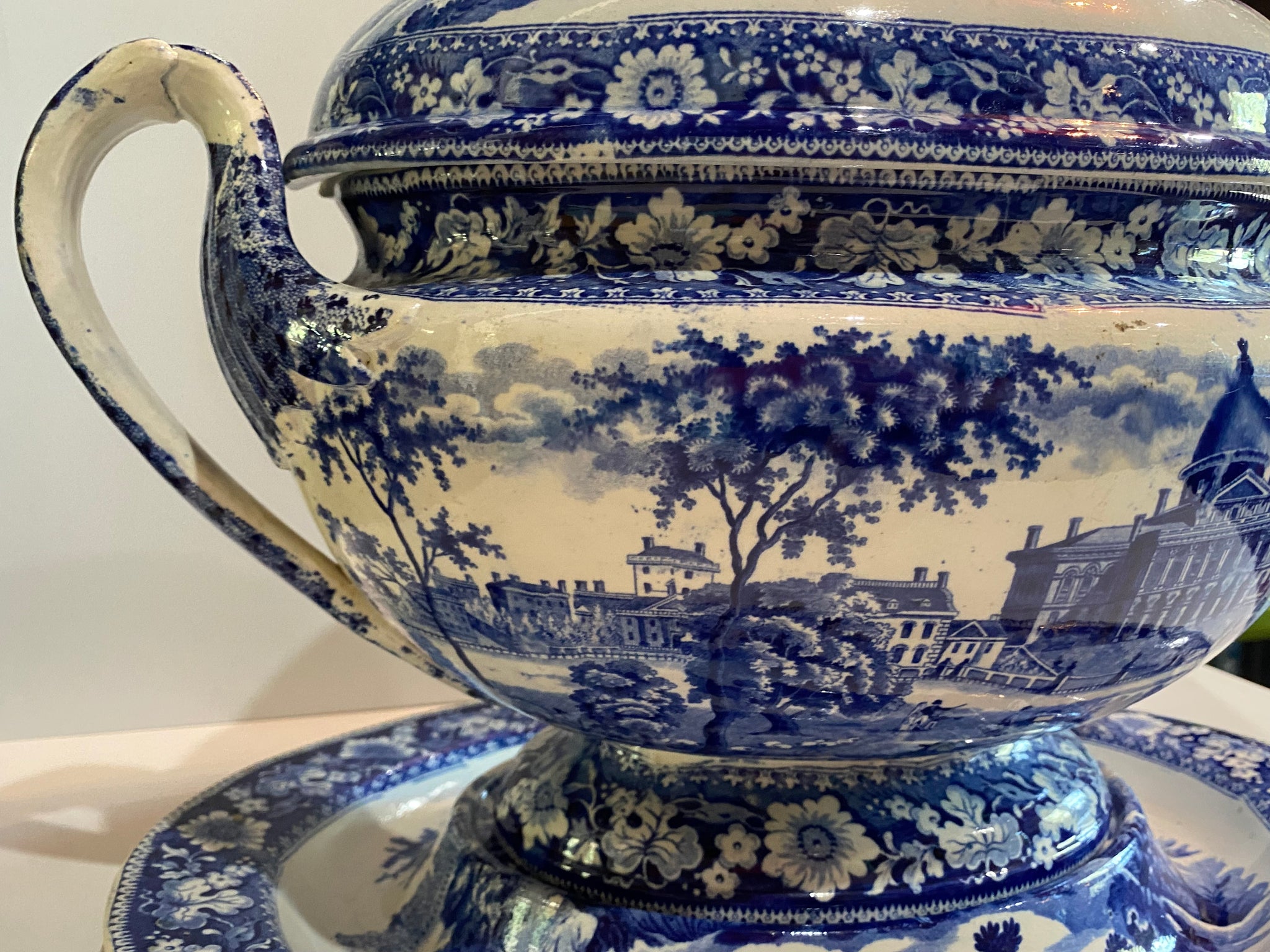 Historical Staffordshire blue soup tureen in the “Boston State House” pattern by Rogers. One of the most impressive soup tureens in Historical Staffordshire and the largest. In 50 years we have only had the pleasure of offering one other. In excellent condition with a professional repair to the finial being reattached. It measures 14 1/4” tall while on the stand by 15 3/4” across the handles. It dates circa 1825.