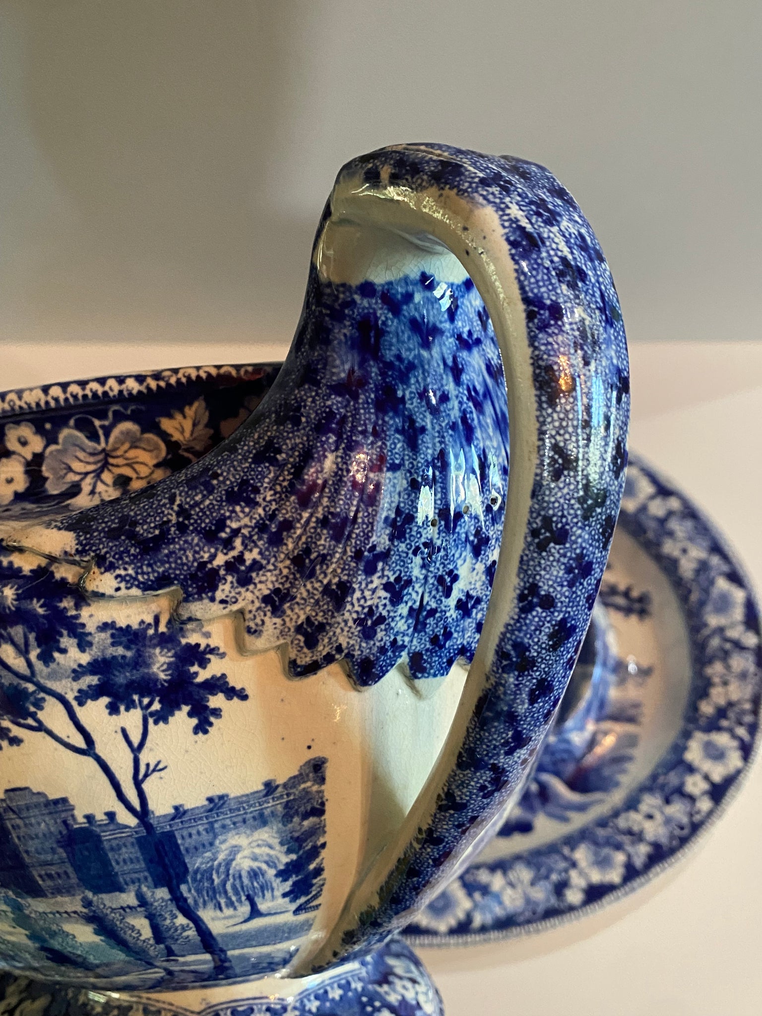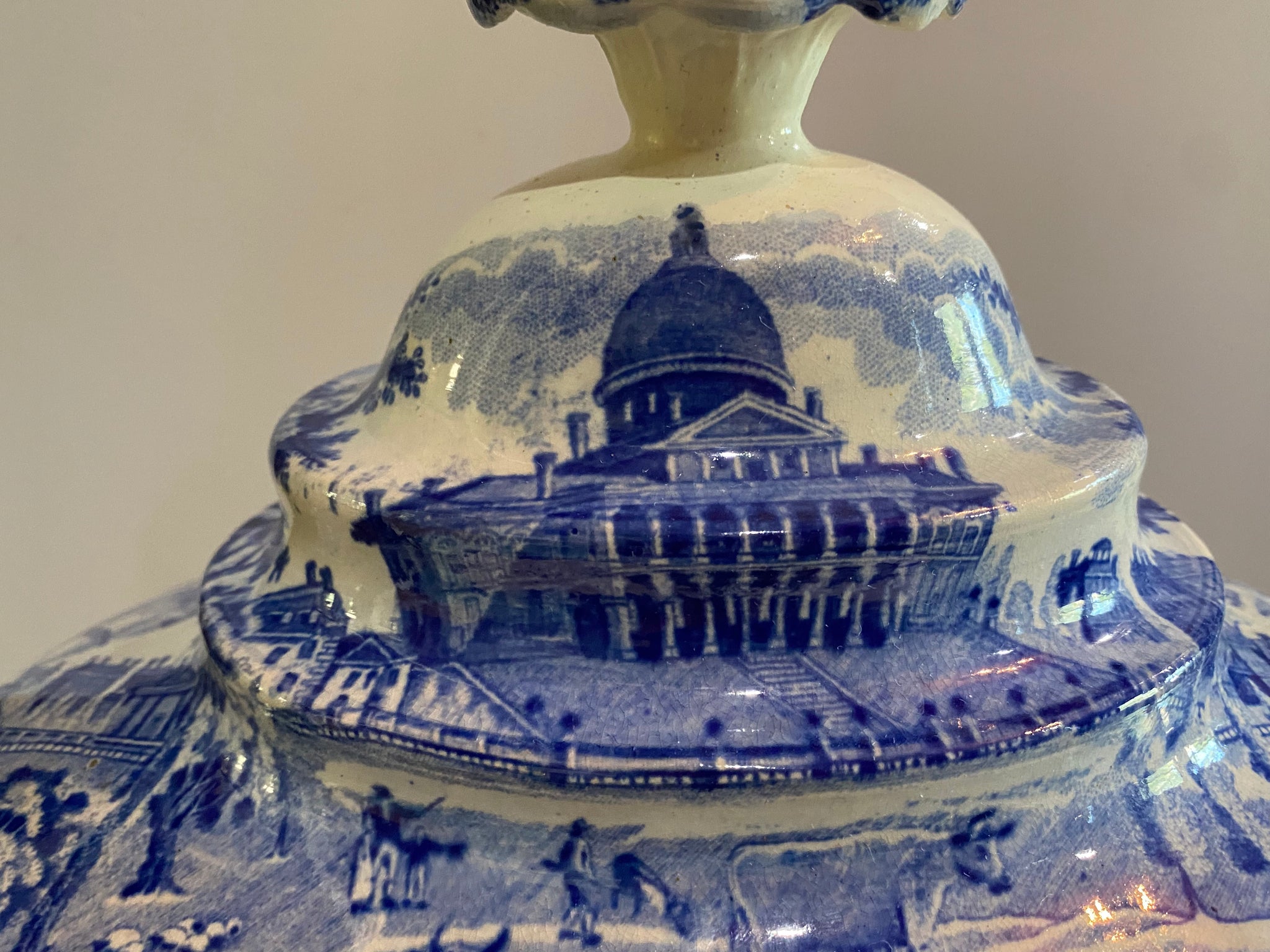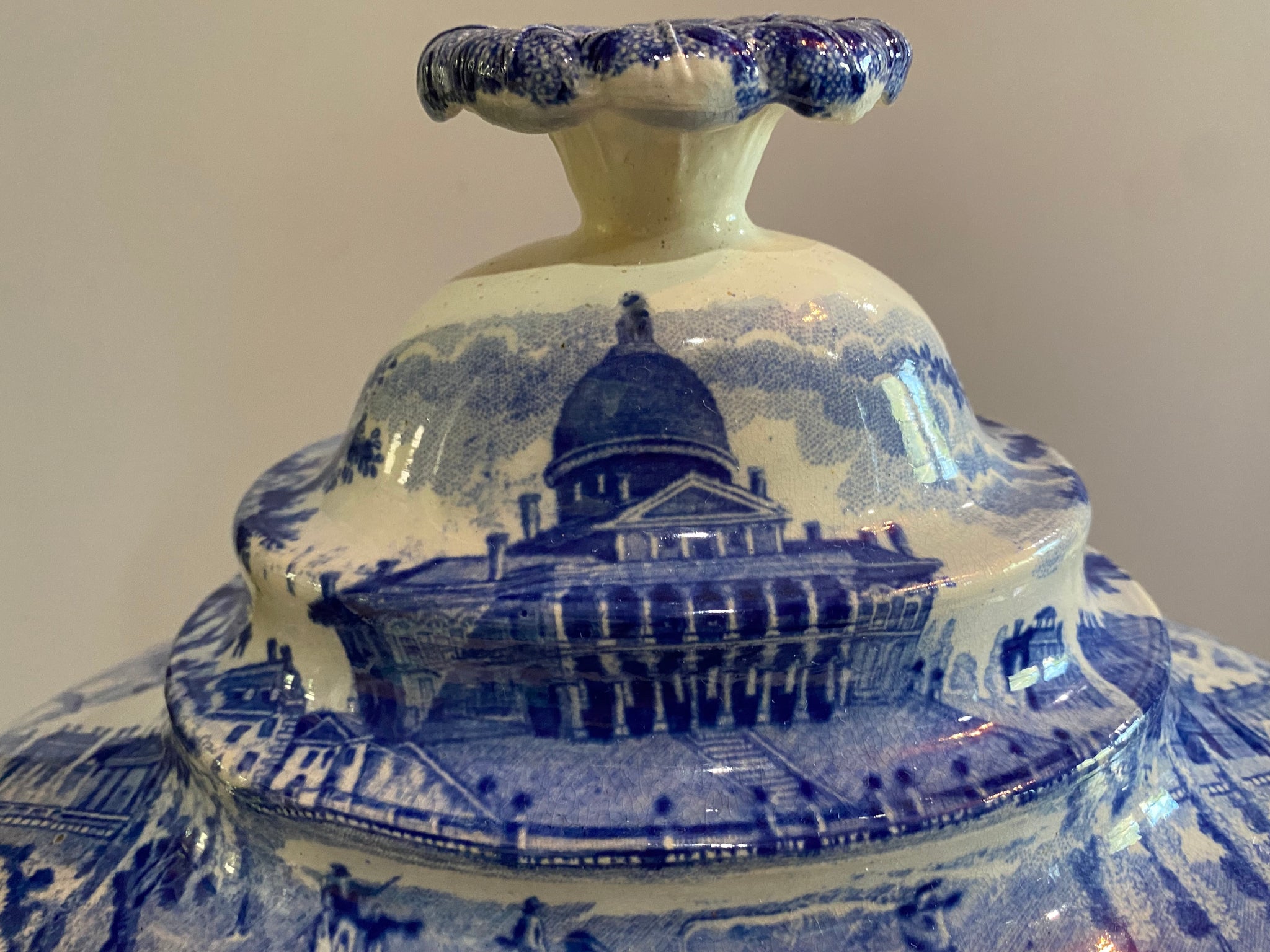 Historical Staffordshire blue soup tureen in the “Boston State House” pattern by Rogers. One of the most impressive soup tureens in Historical Staffordshire and the largest. In 50 years we have only had the pleasure of offering one other. In excellent condition with a professional repair to the finial being reattached. It measures 14 1/4” tall while on the stand by 15 3/4” across the handles. It dates circa 1825.