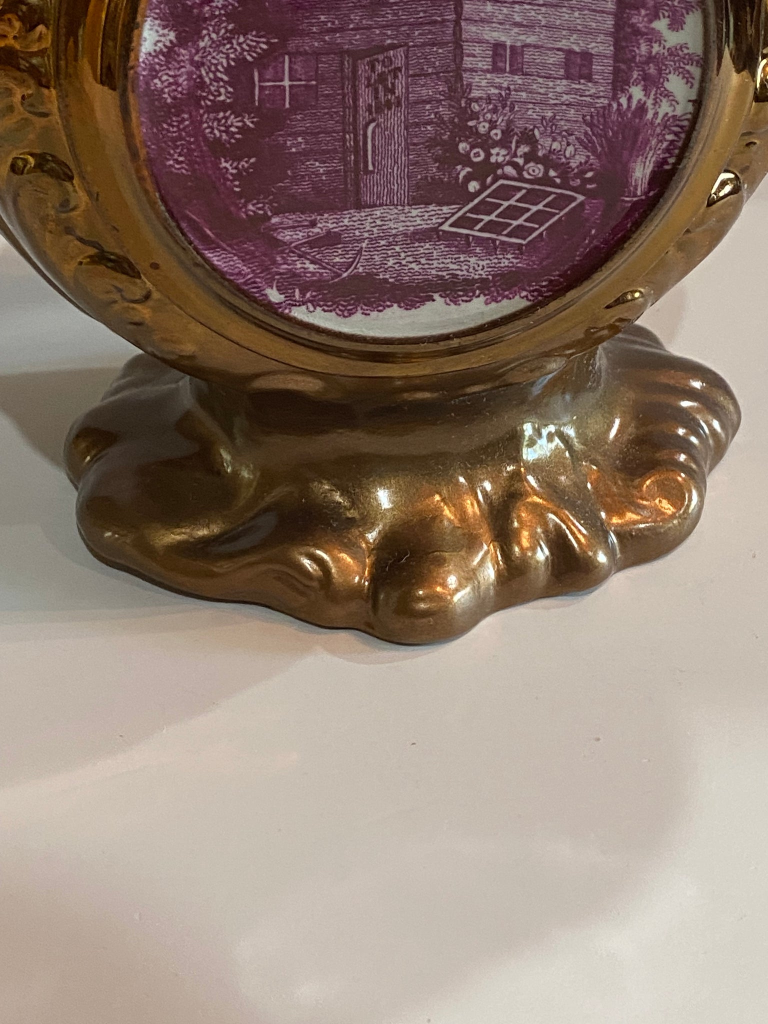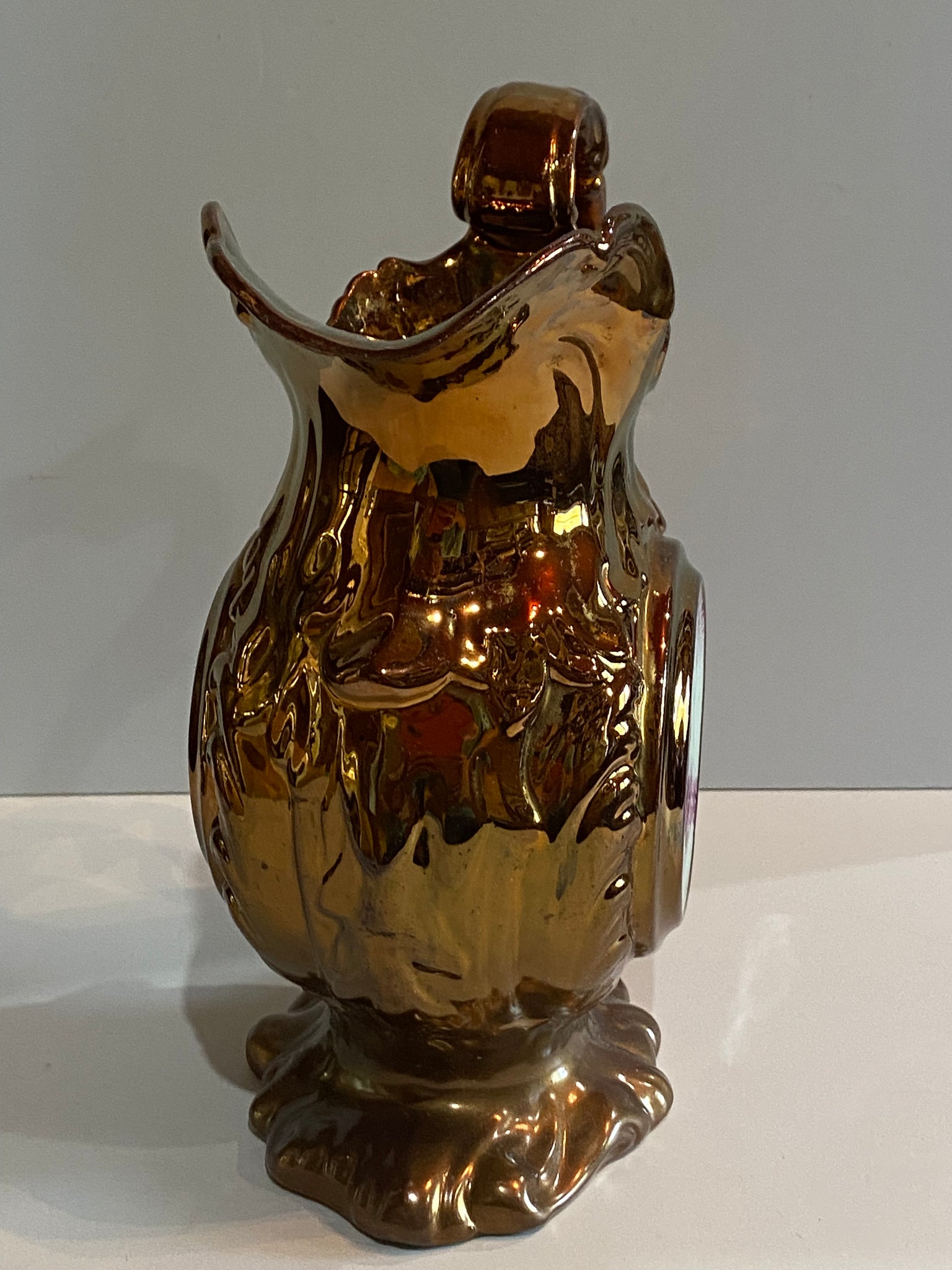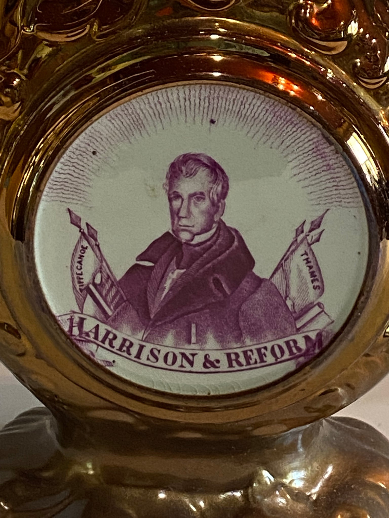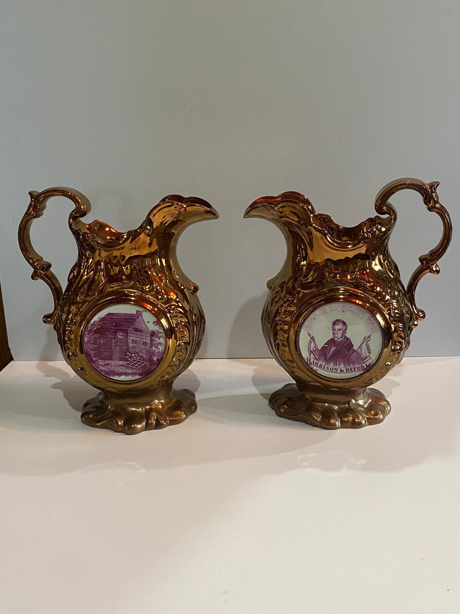 Historical Staffordshire copper luster large pitcher with William Henry Harrison Transfer with log cabin on reverse. This pitcher is very large measuring 9 1/2 tall by 8” from the tip of the spout to the handle. It dates circa 1840’s. This piece displays very well with a highly professional repair to the foot. What’s really neat is that we have a matched pair of these right now that we are offering in 2 separate auctions. Both identical in every way and even the same type of repair. These have definitely been together for their whole life in my opinion.