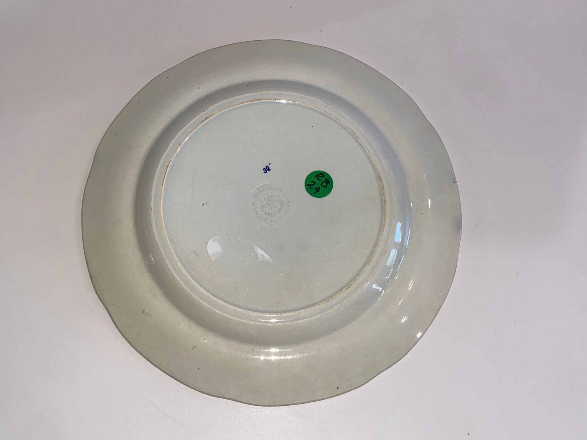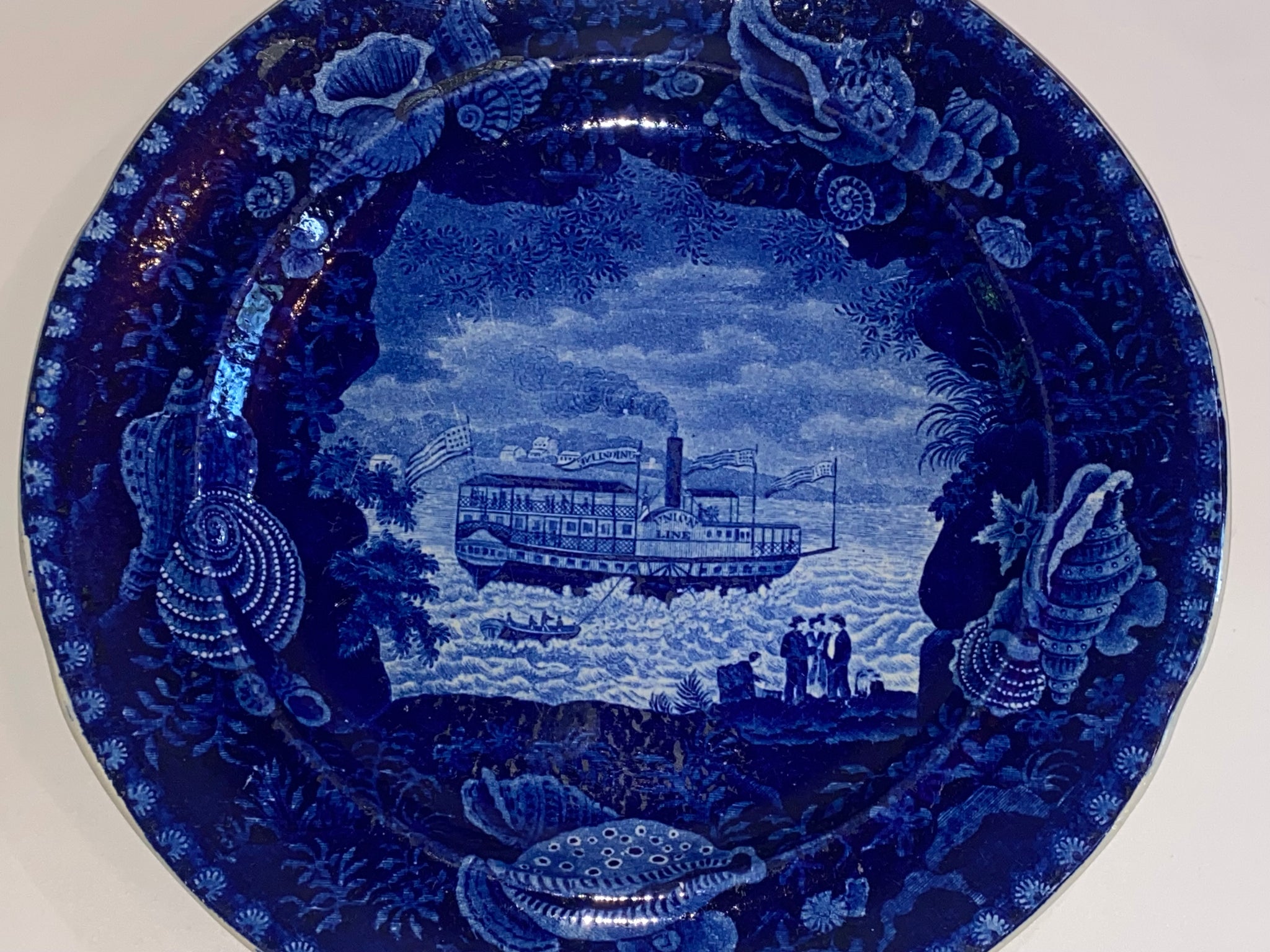 Historical Staffordshire Blue plate with view of the Ship “Union Line” by Enoch Wood and Sons. Excellent condition with no chips, cracks or repairs but does show a few minor spots where the glaze didn’t take in the making. Otherwise appears unused. It measures 10 1/8” and dates circa 1825.