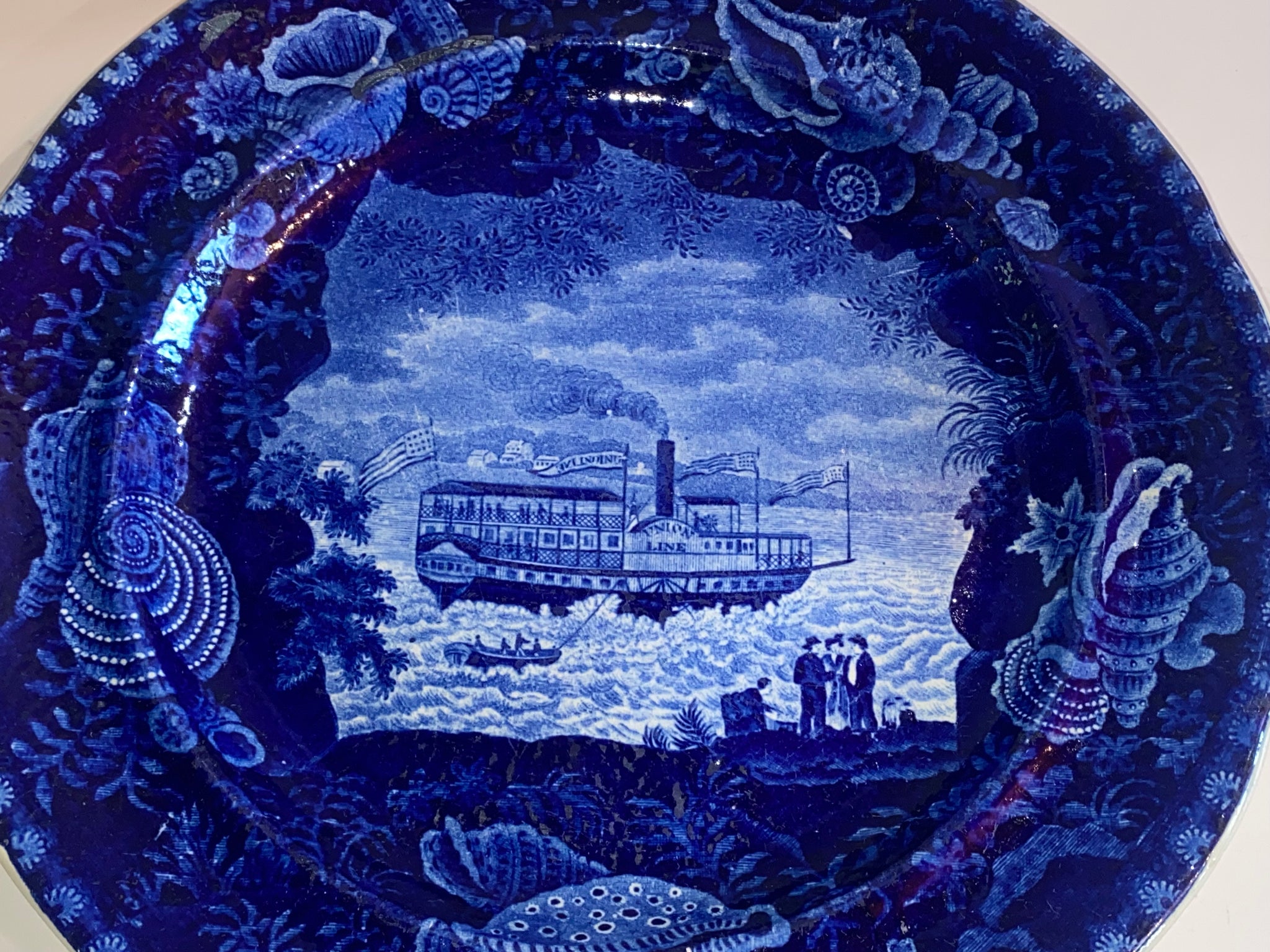Historical Staffordshire Dark Blue Plate Union Line Ship Wood