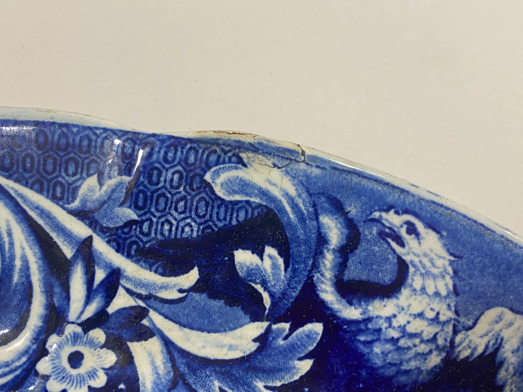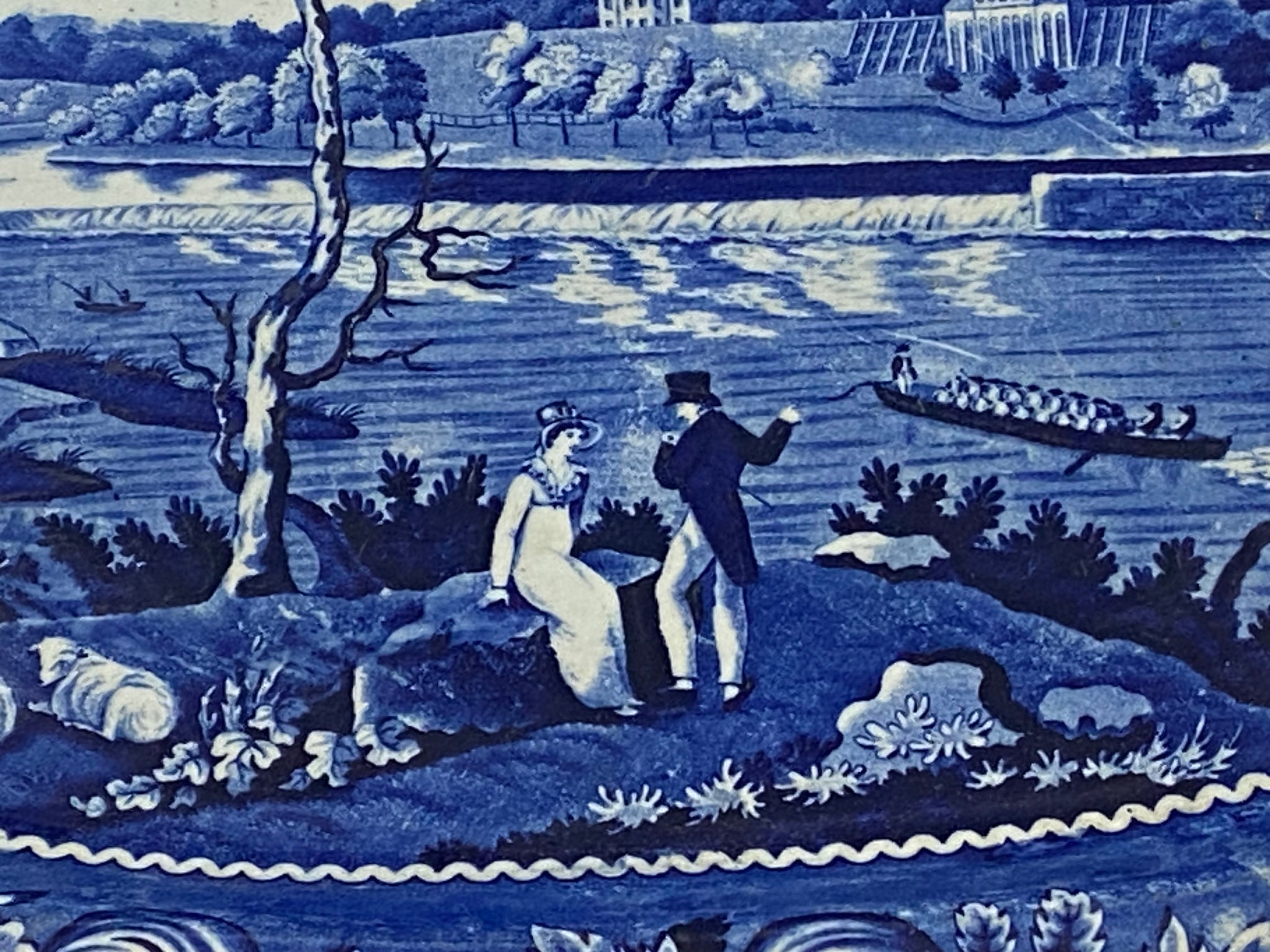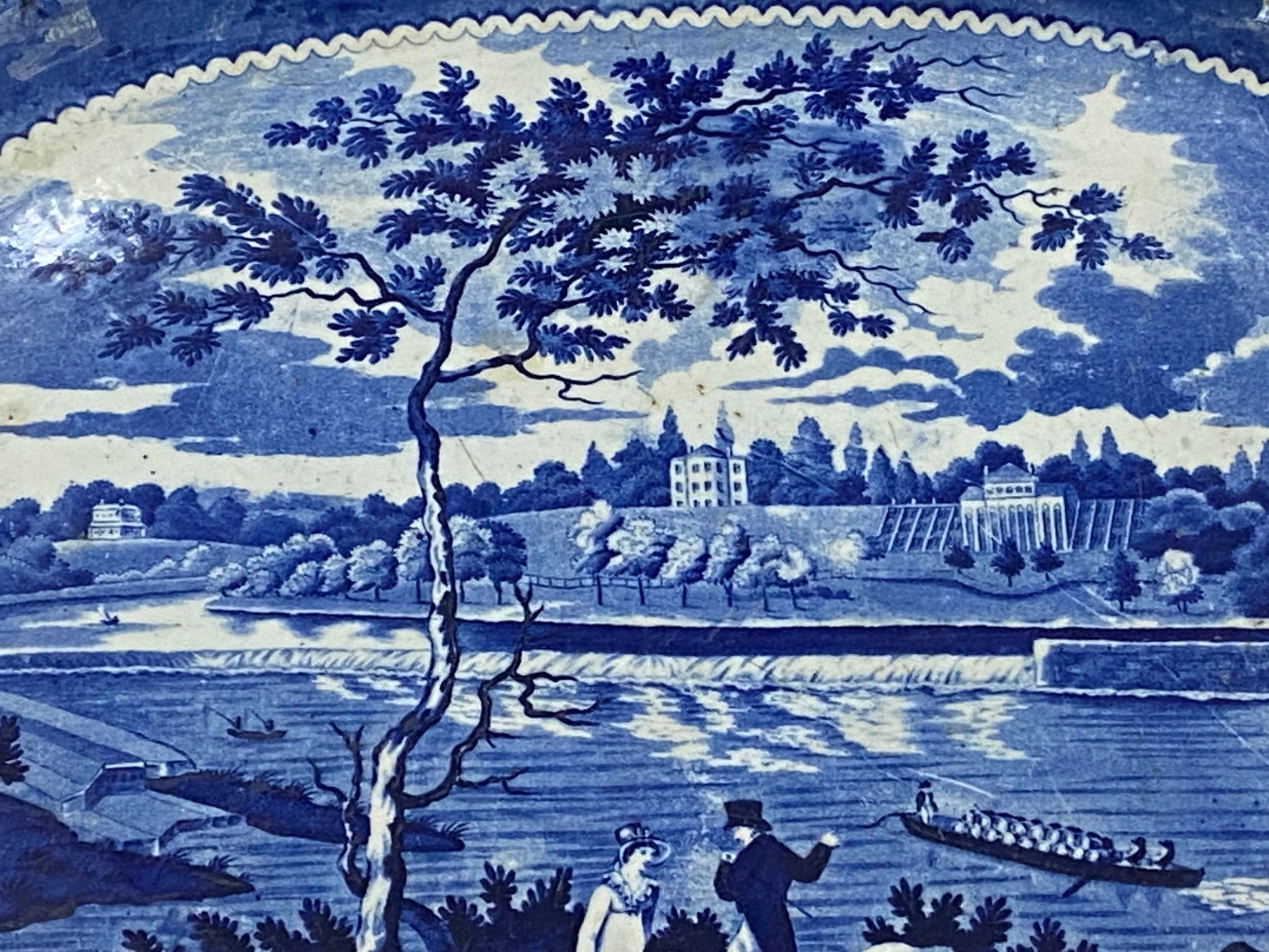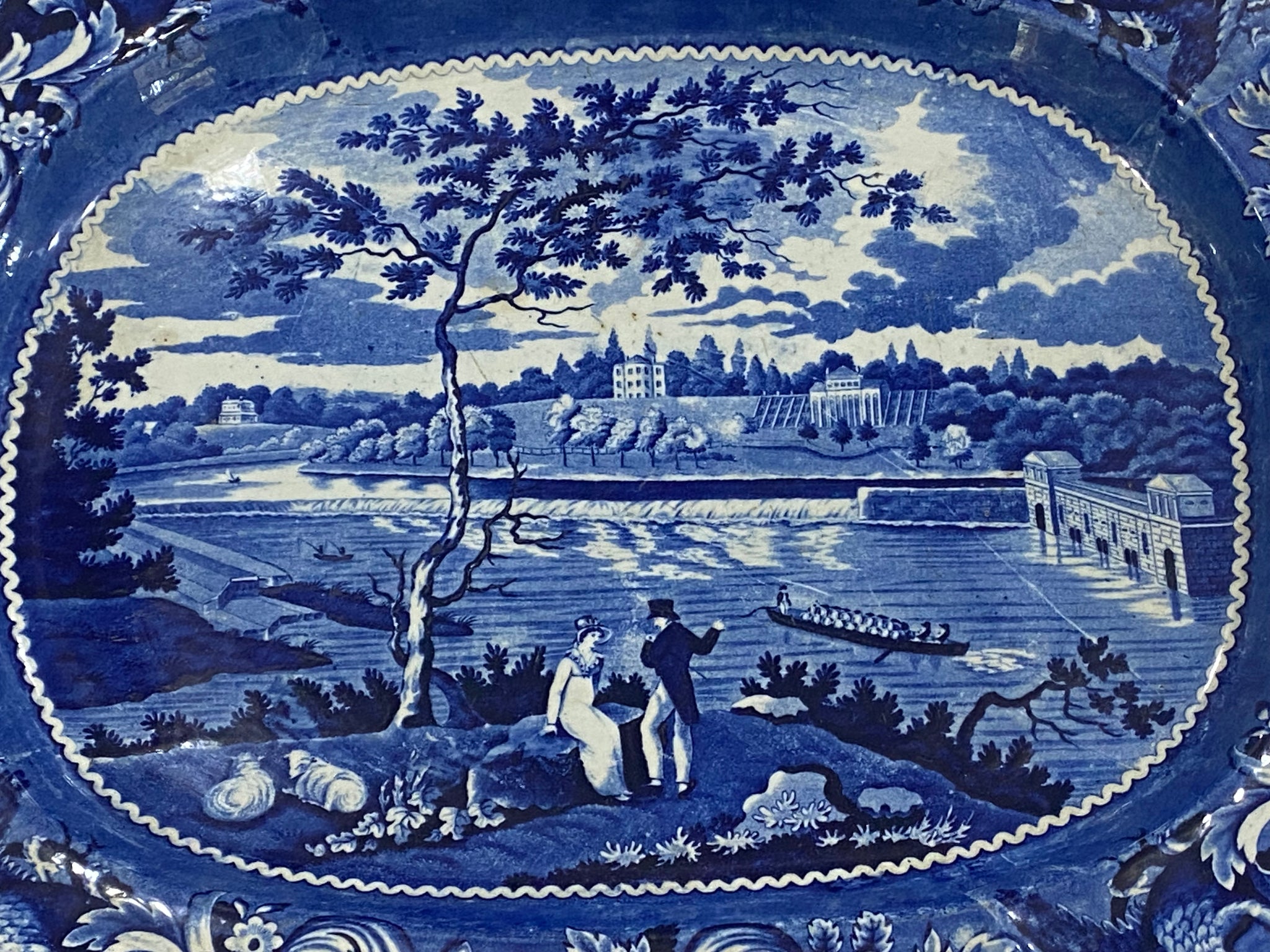 Historical Staffordshire blue platter with view of Fairmount Philadelphia by Joseph Stubbs. In good condition with a minor pottery imperfection on the rim. It measures 16 7/8” by 20 3/4” and dates circa 1825.