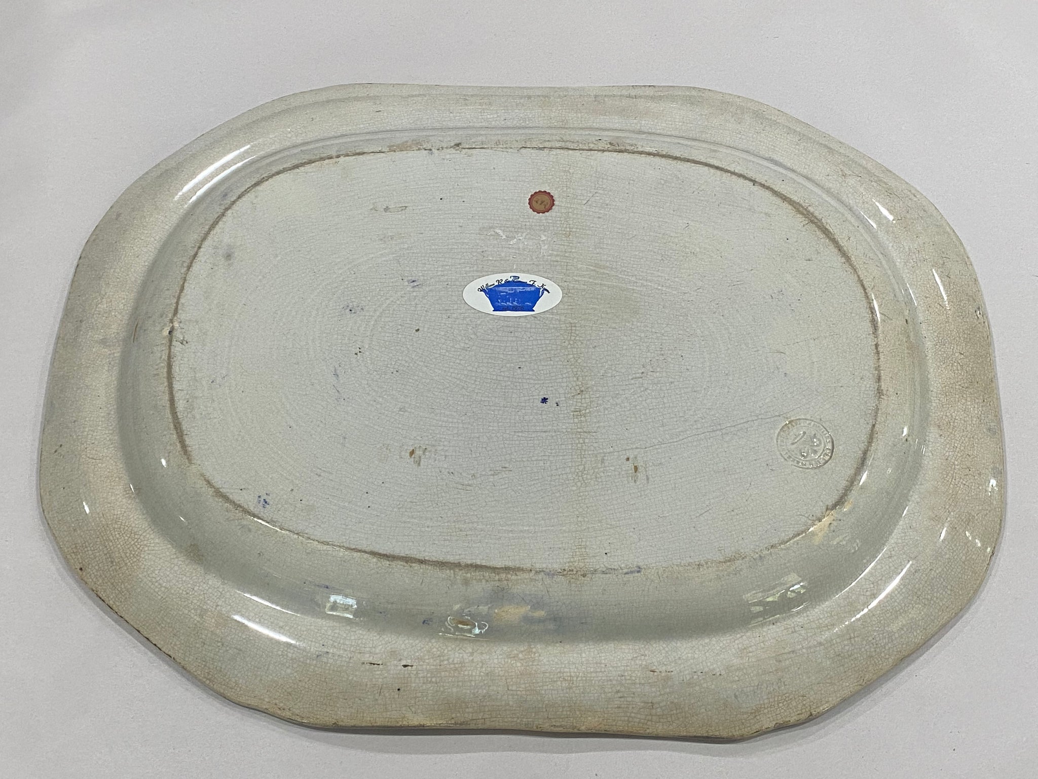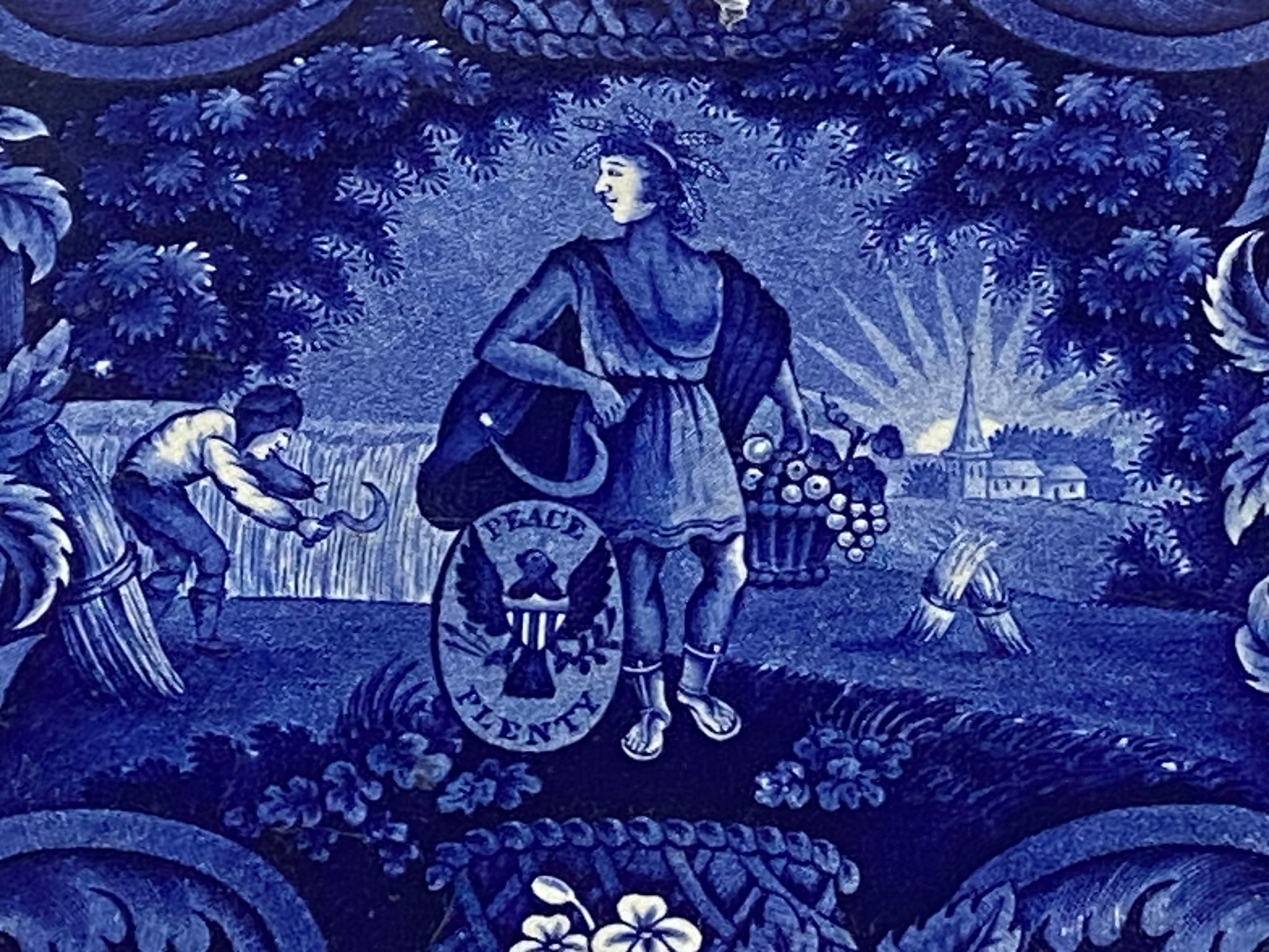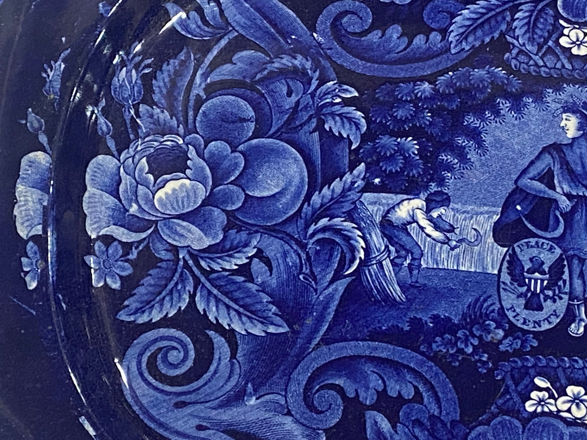 Historical Staffordshire Blue Platter in the “Peace and Plenty” pattern by James and Ralph Clews. In perfect condition with no chips, cracks or repairs. It measures 14 1/2” by 19 1/2” and dates circa 1825.