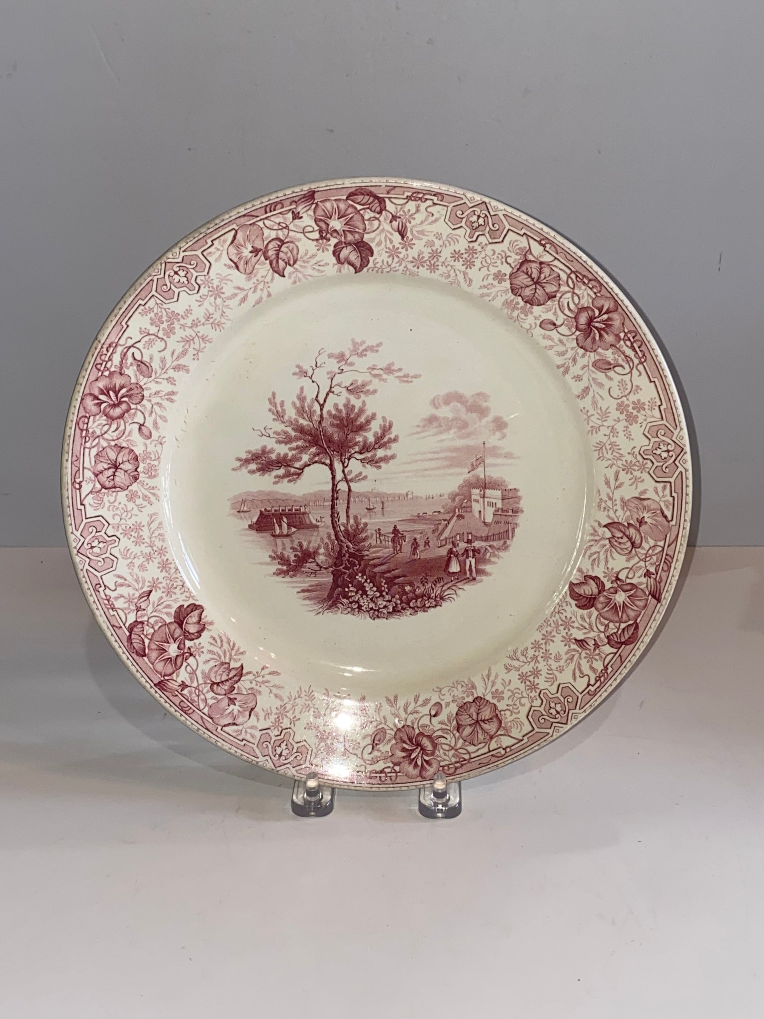 Historical Staffordshire pink transfer dinner plate with view of “Narrows From Fort Hamilton” by Godwin. In perfect condition with no chips, cracks or repairs. It measures 10 1/2” in diameter and dates circa 1835.