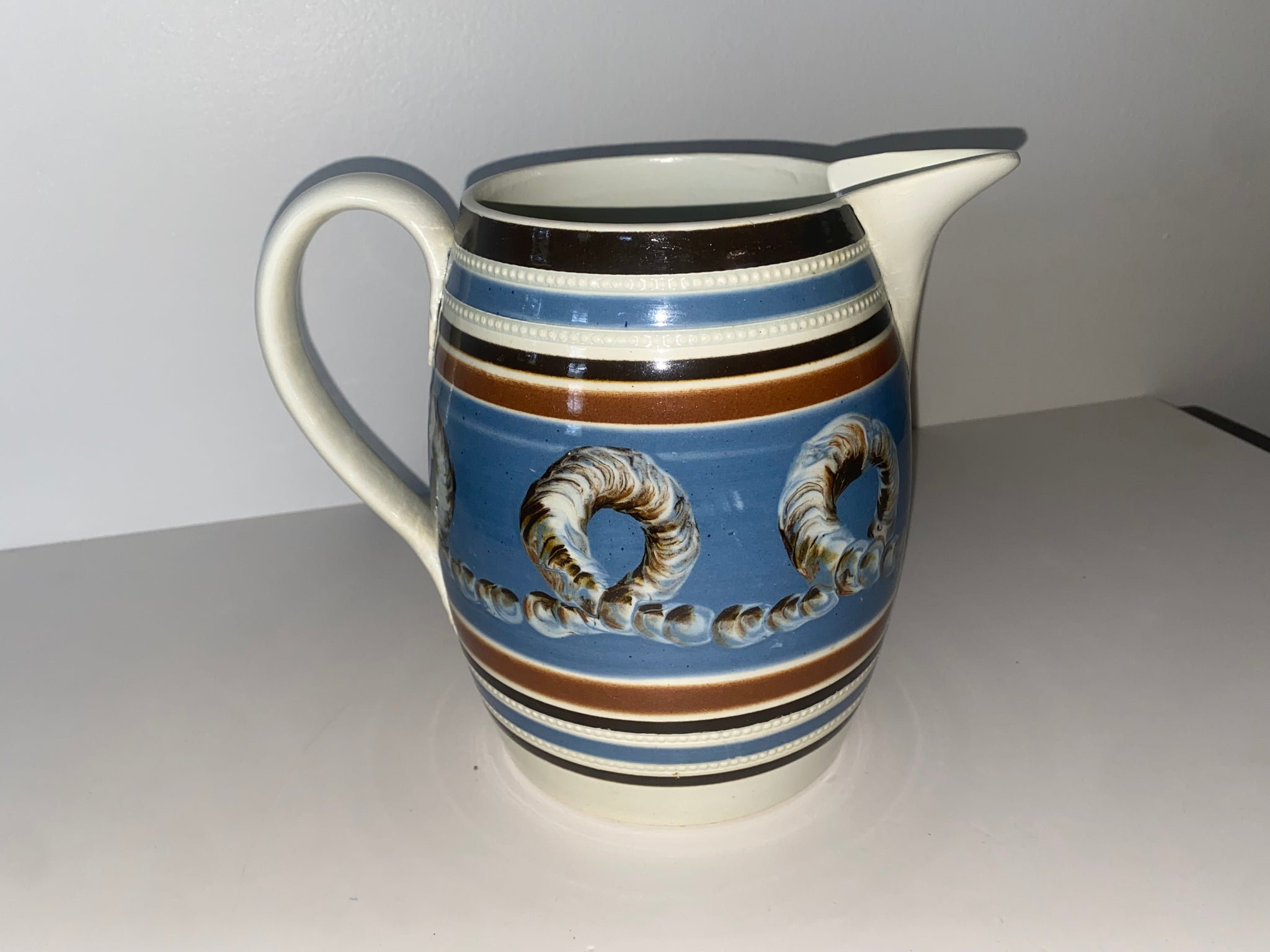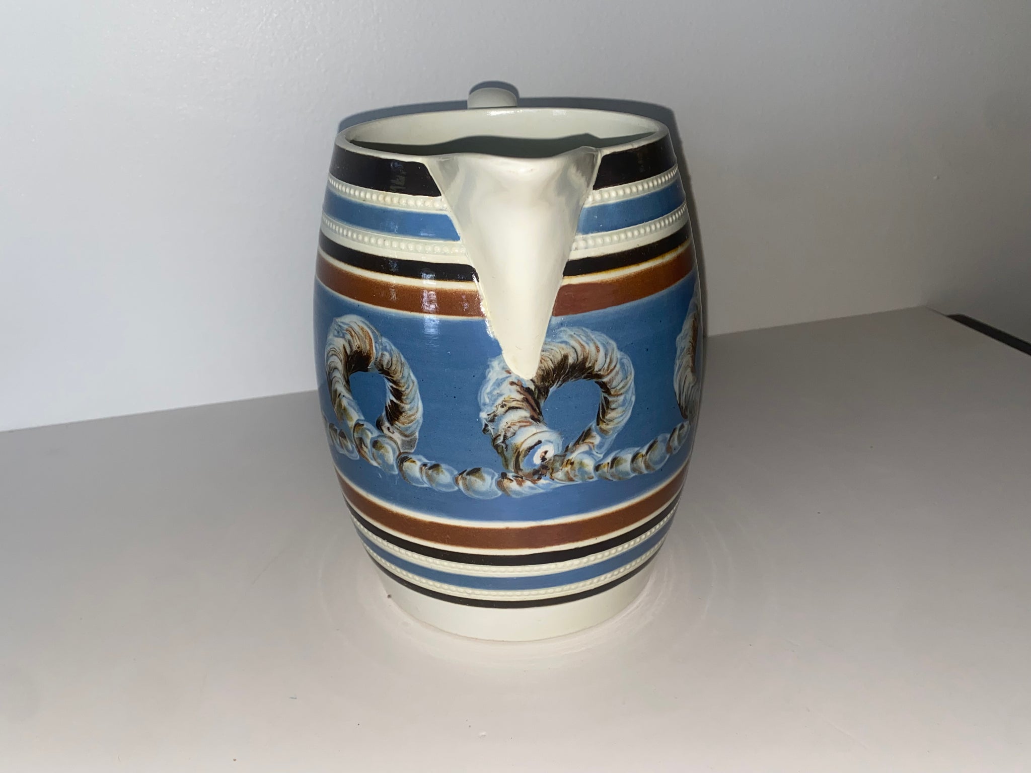 Staffordshire Mochaware pitcher with earthworm designs on a blue background with black, blue and pumpkin color bands separated by a engine turned dot design. It displays as perfect with what looks like professional repairs to the handle and spouts a nice measuring 7” tall and dates circa 1820.