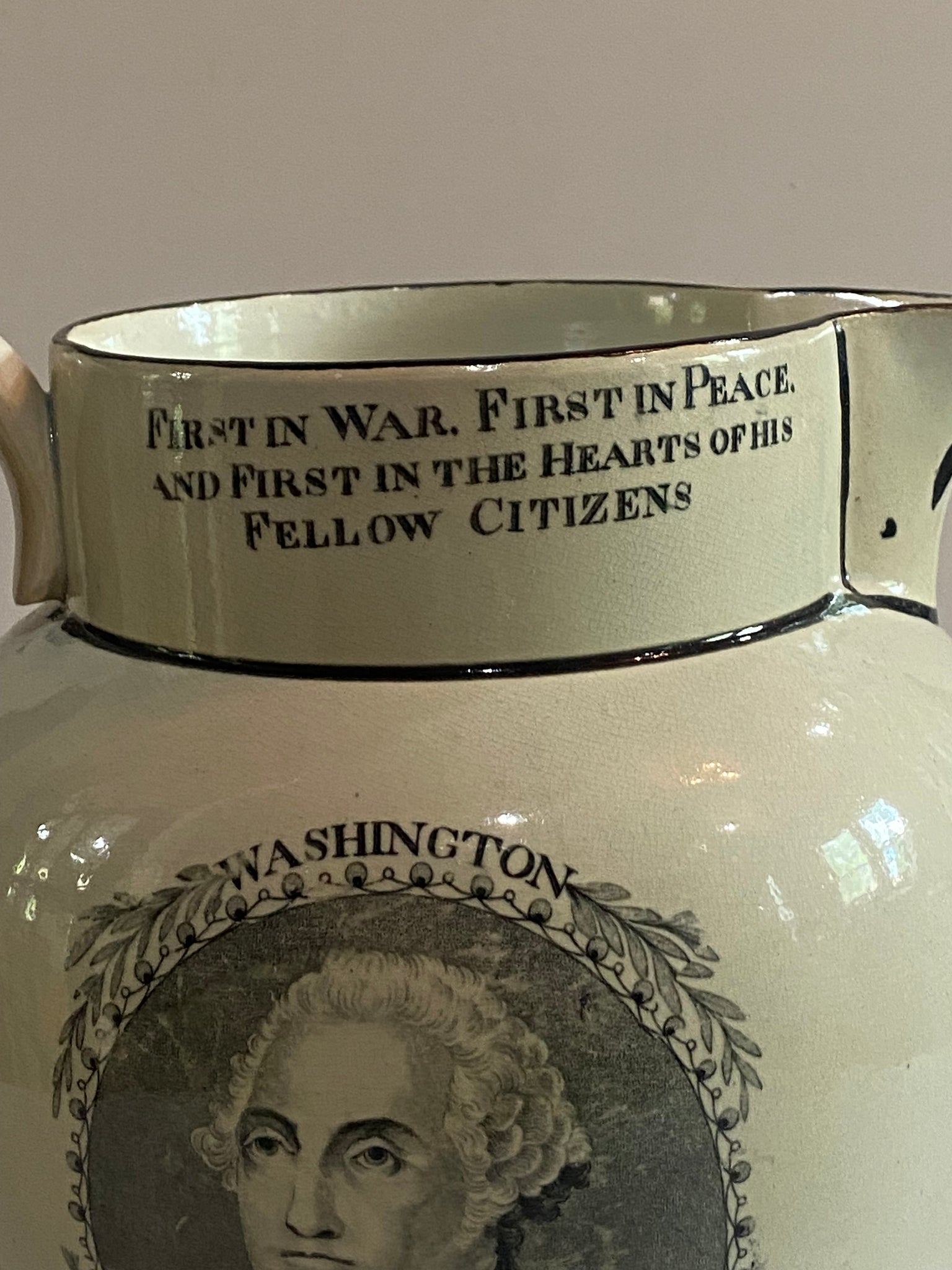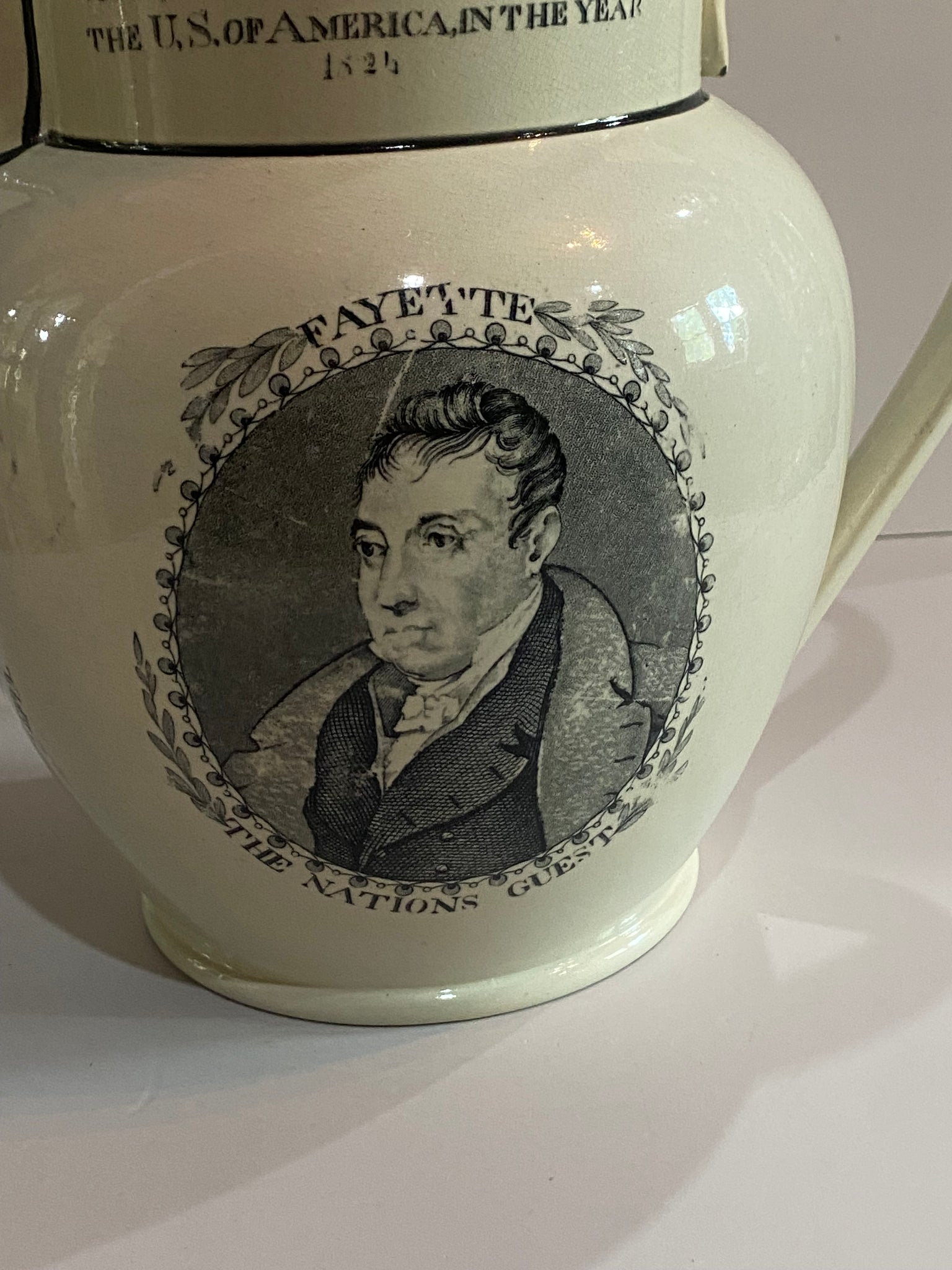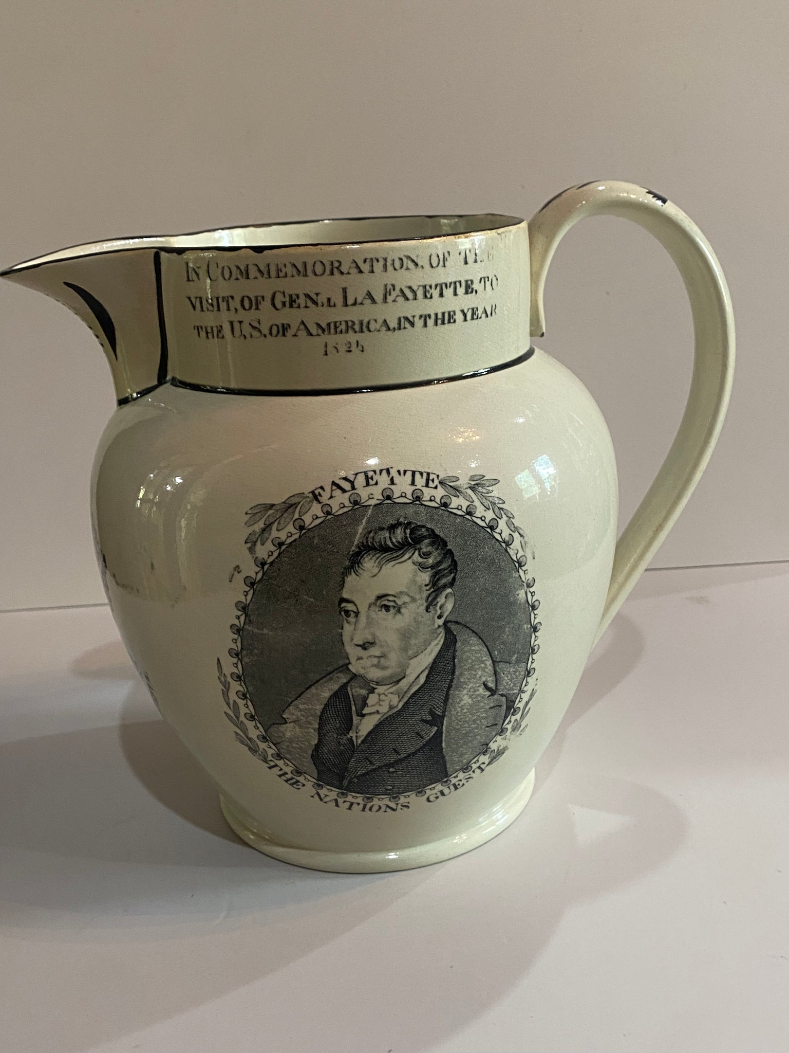 Staffordshire General Lafayette and George Washington Republicans are not always ungrateful pitcher. Displays as perfect with highly professional repairs to the spout. base and hairline repair . It measures 9” tall and dates circa 1825.