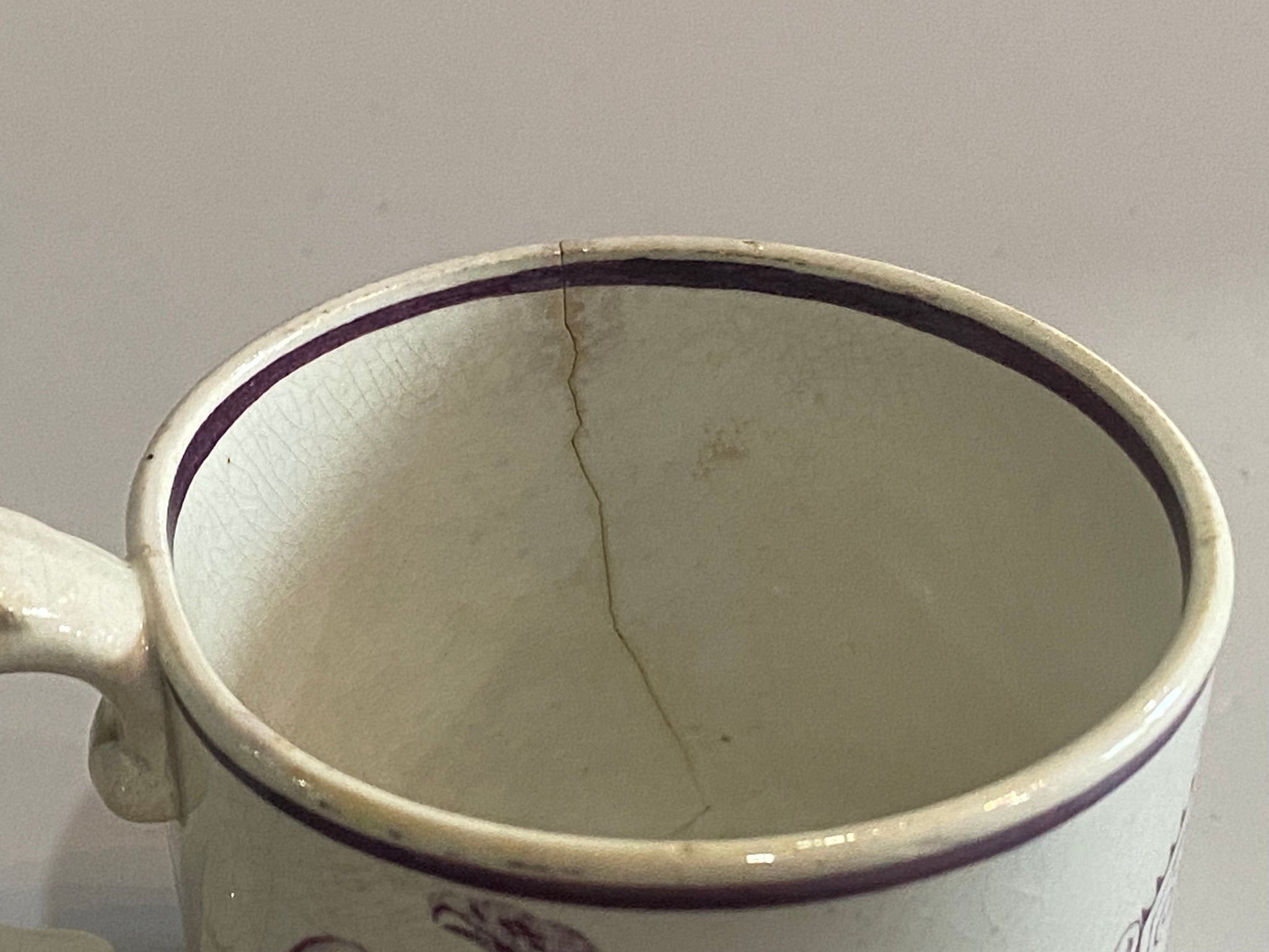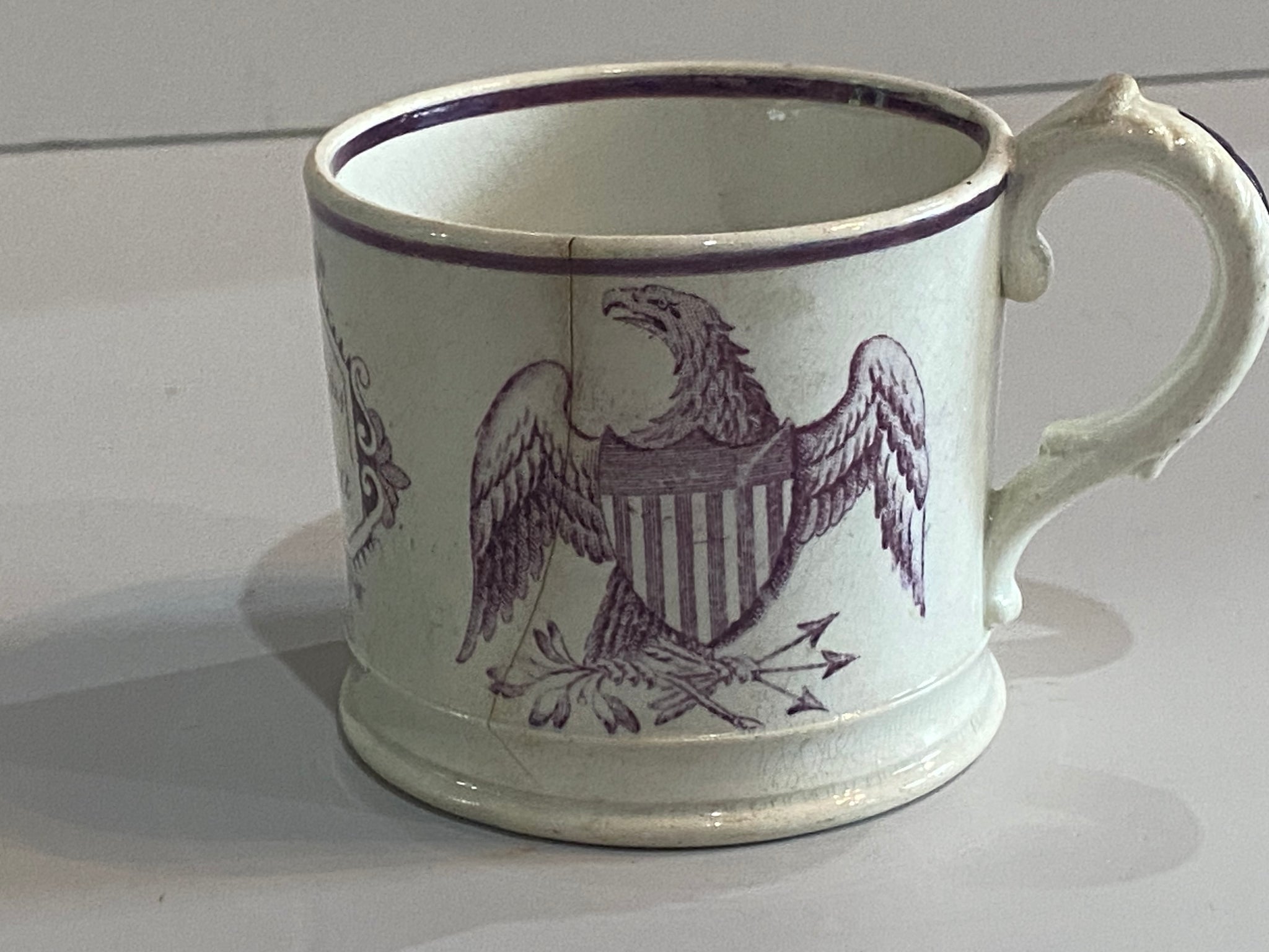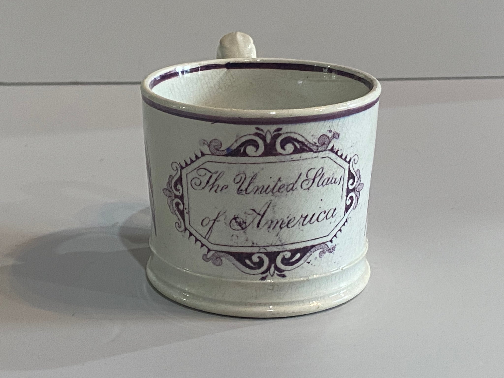 Staffordshire Childs mug with “The United States of America” surrounded by Eagles and Shields. Displays well but does have an hairline on the side. It measures 2 3/8” tall and dates circa 1830’s.