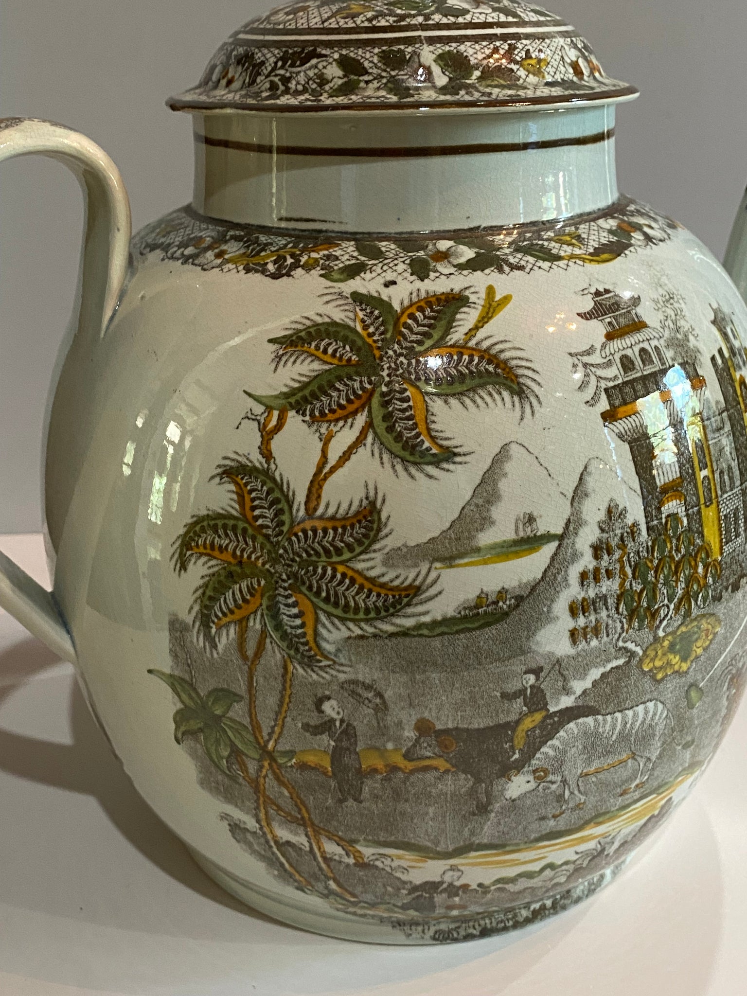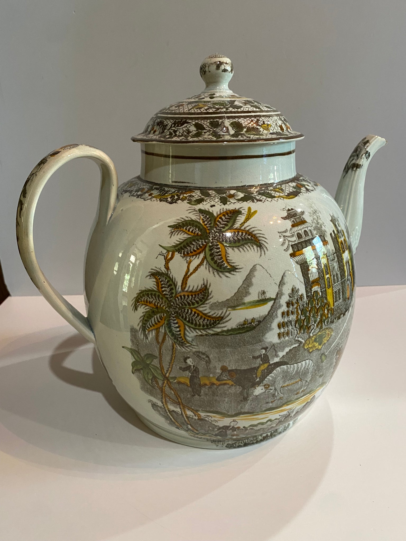 Staffordshire Pearlware Chinoiserie Pagoda type pattern barge pot. In very good condition with some minor chipping to the spout and underside of lid. Very impressive looking piece. It measures 11 3/8” tall by 13 1/4” from the spout to the handle and dates circa 1820’s.