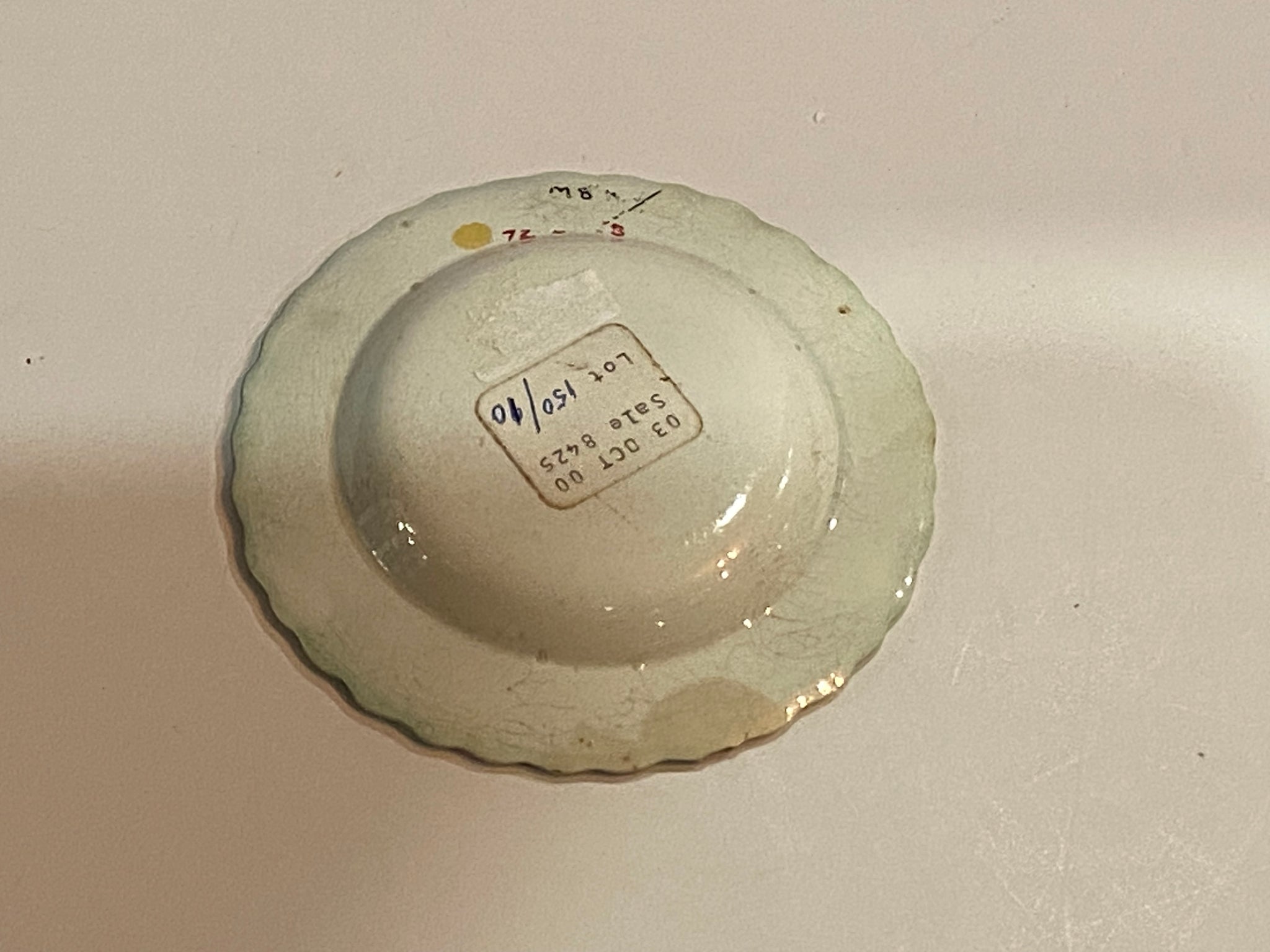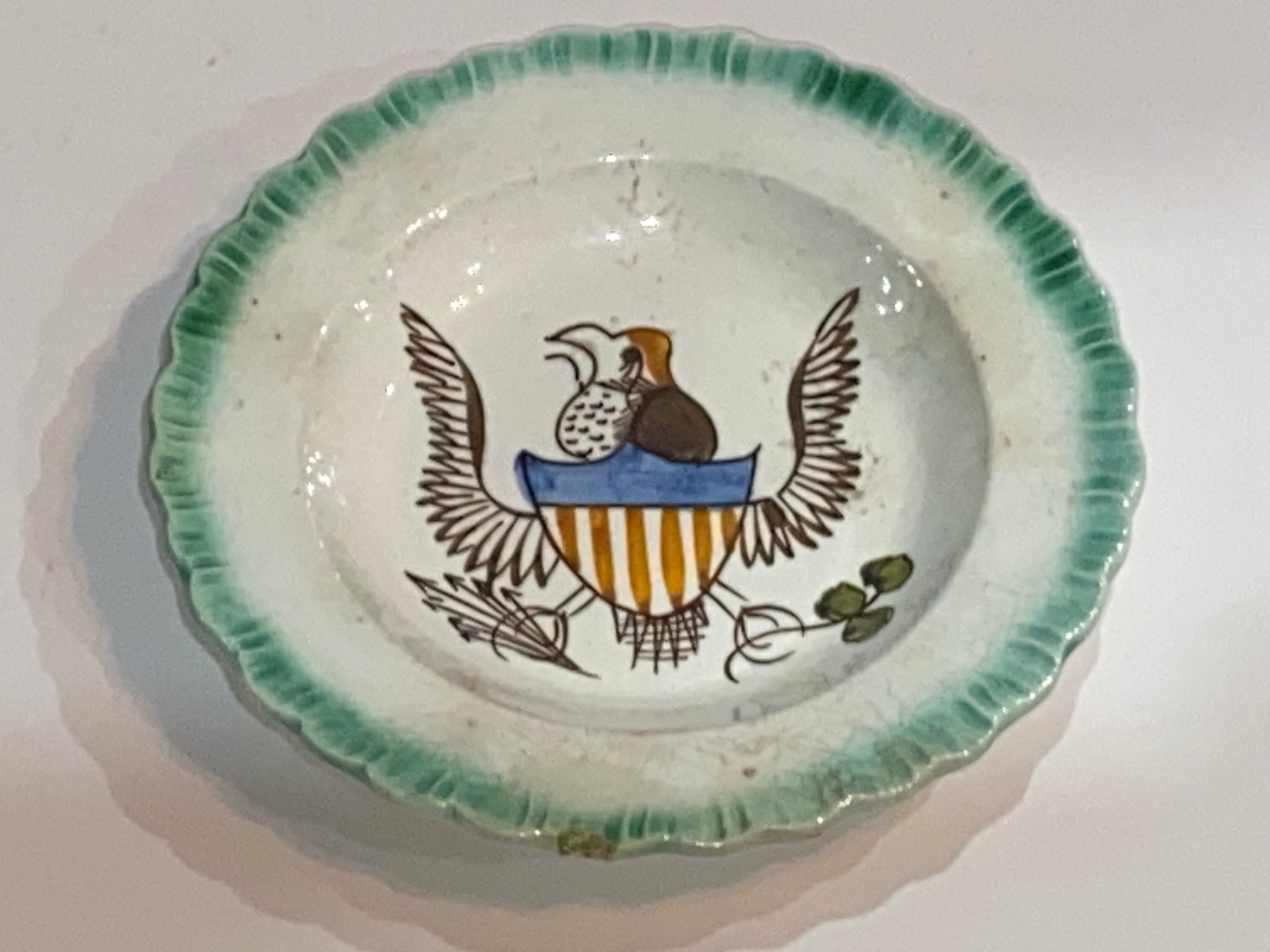 Staffordshire Pearlware green edge Leeds Eagle and Shield cup plate. Extremely scarce size for one of these measuring just 4 1/4” in diameter. One very minor small chip. It dates circa 1820’s.