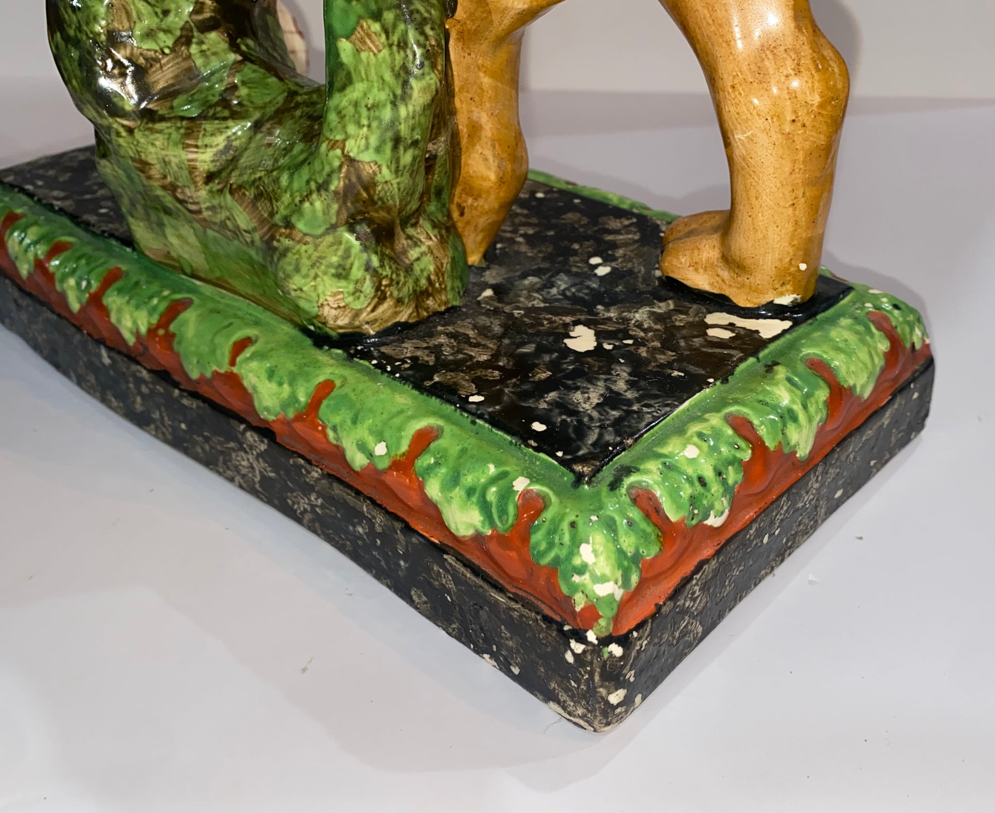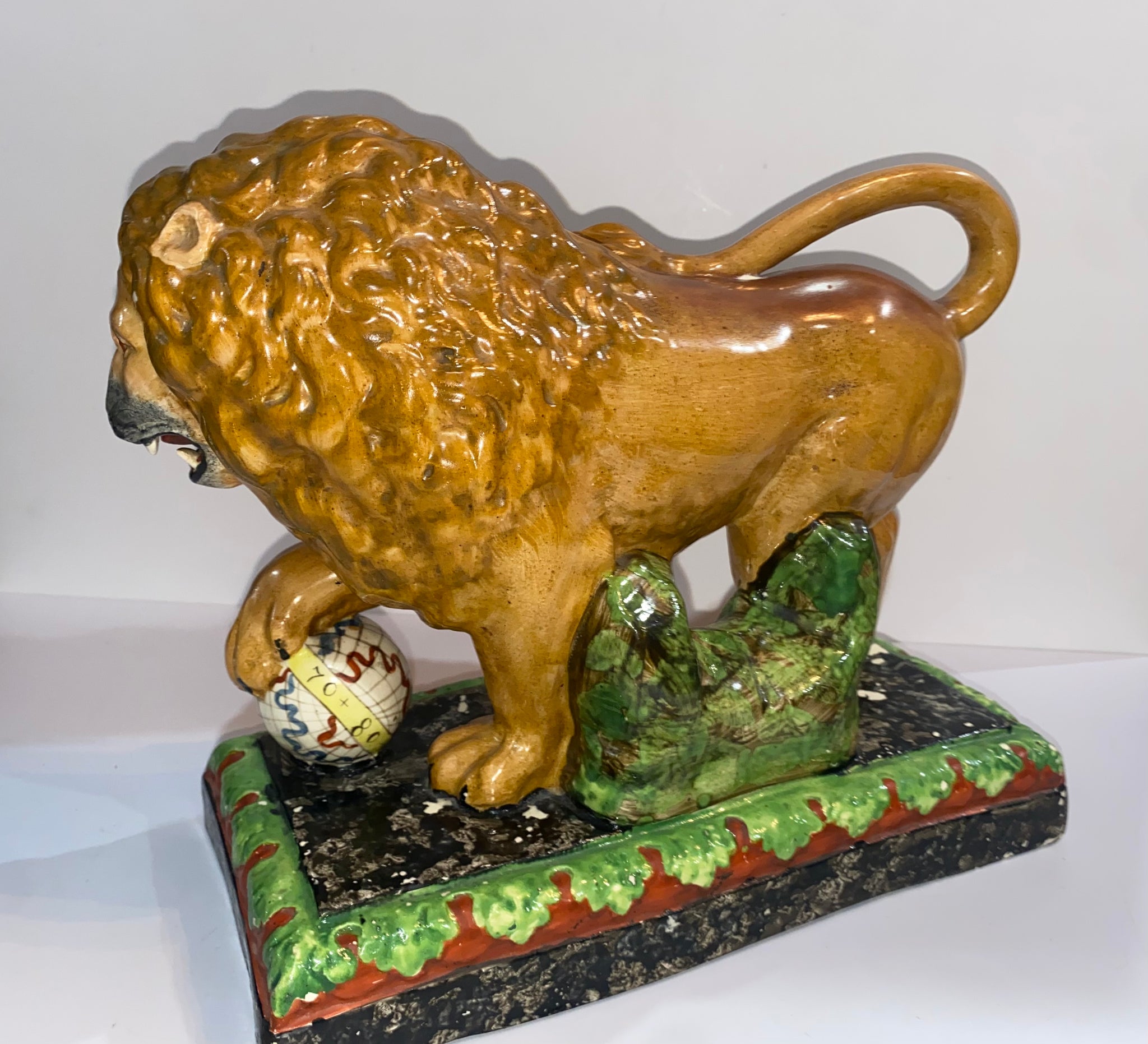 Staffordshire Pearlware Lion mantle figure with globe. Very nicely detailed lion and globe. Very good condition with a minor repair to the lions tail and some light loses to the enamel decoration on the base. Otherwise looks very good. The base measures 5” by 10 1/2” and he stands 9 1/8” tall. It dates circa 1820’s. |