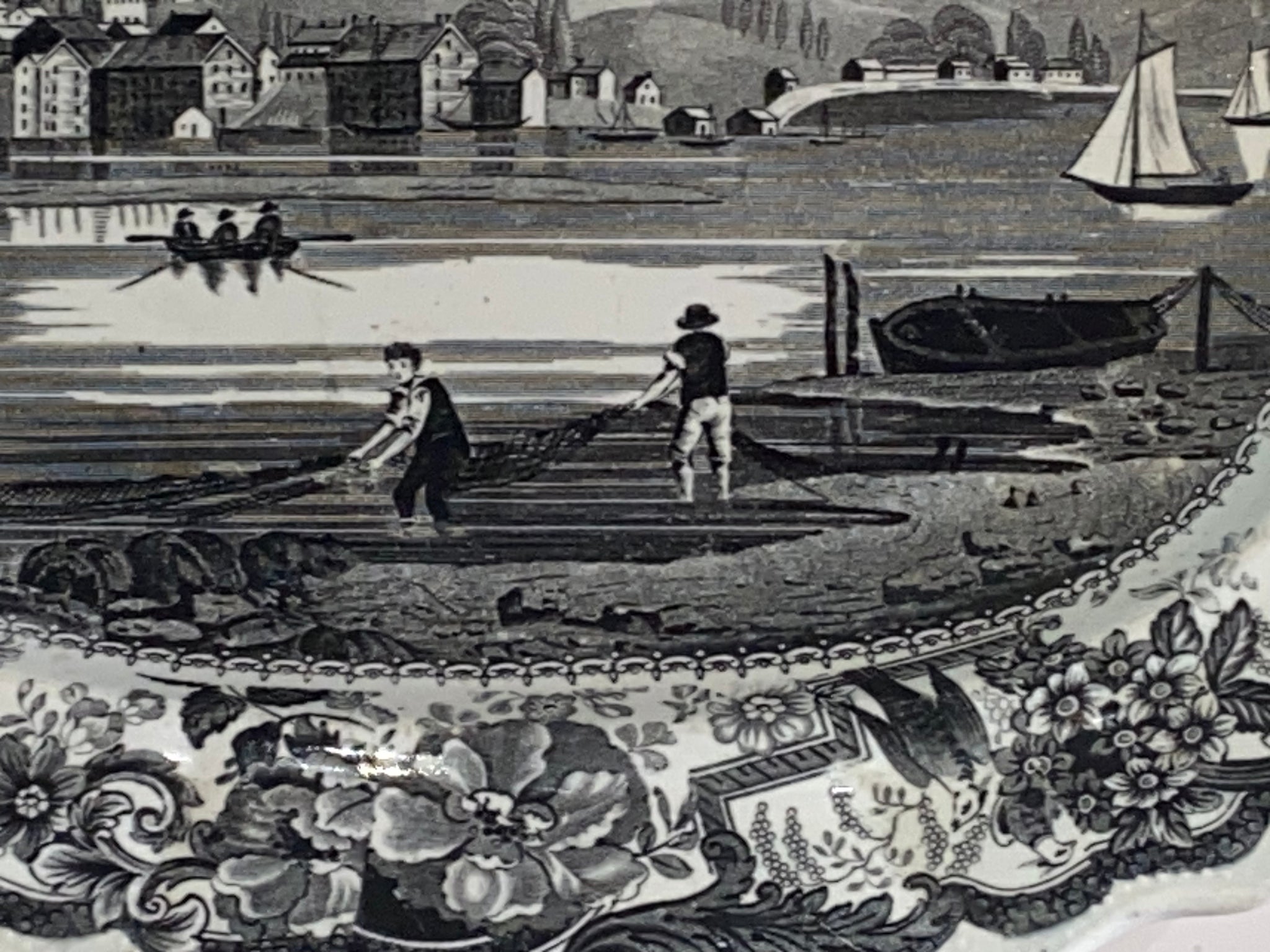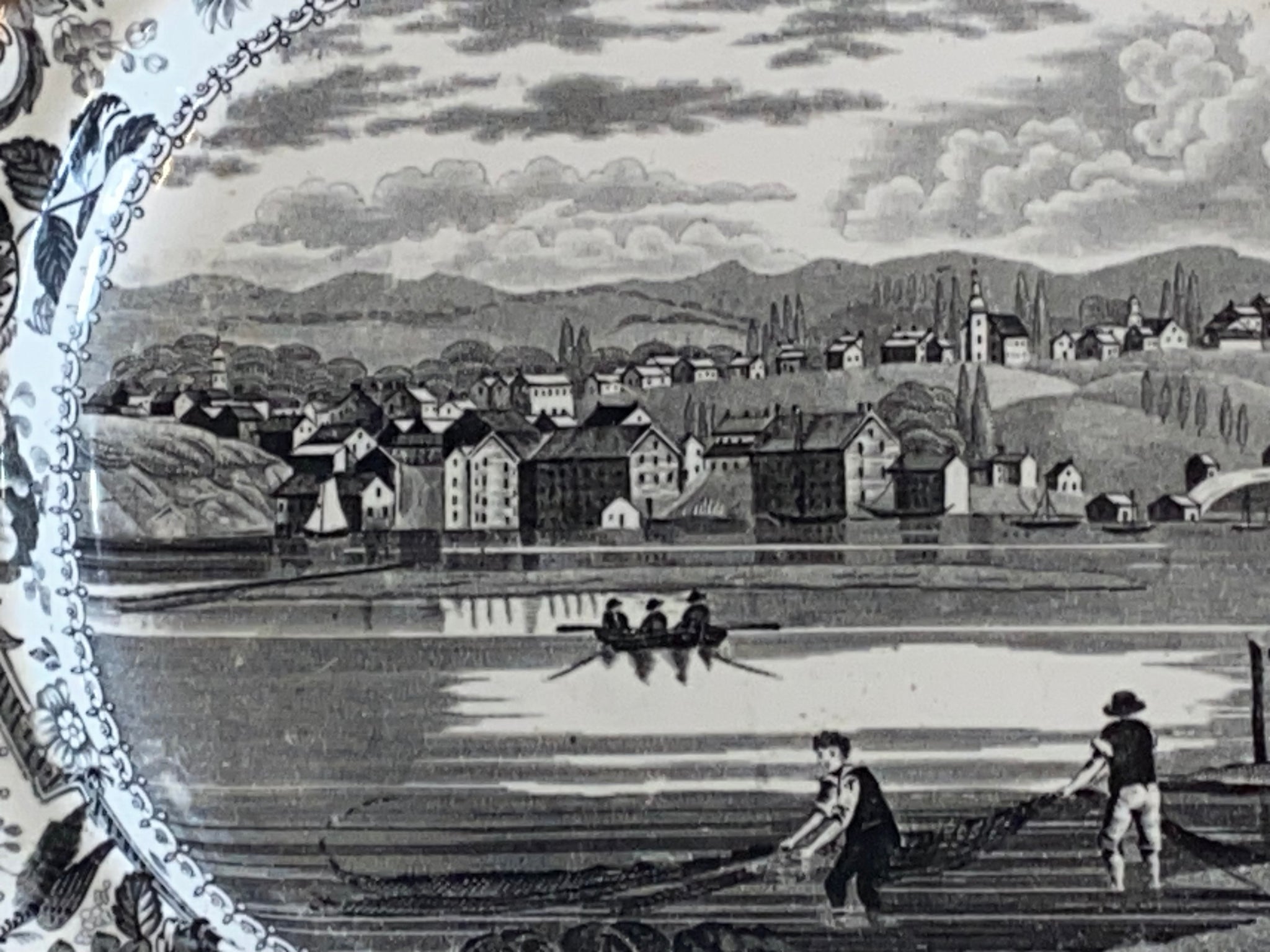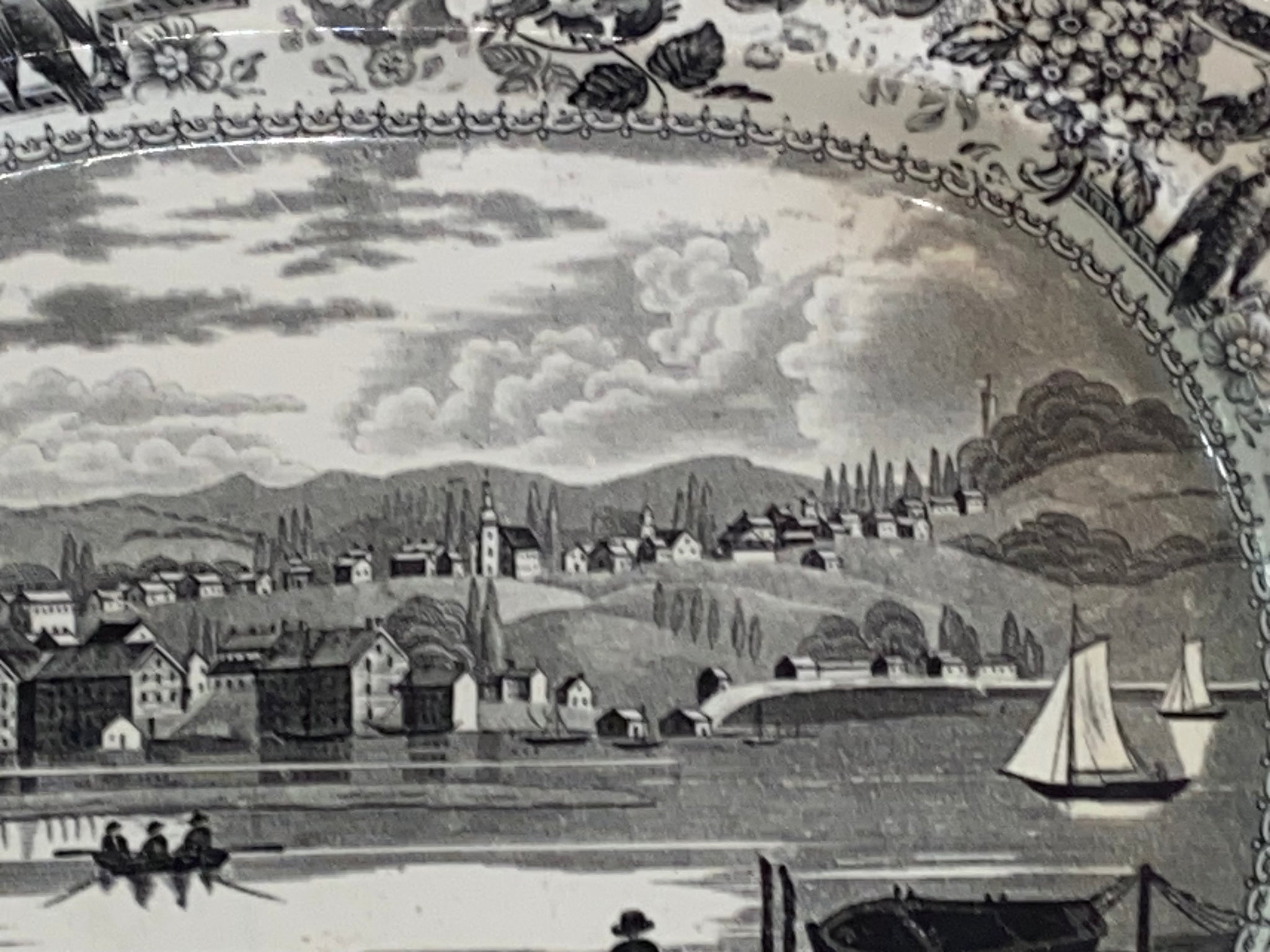 Historical Staffordshire black transfer platter with “view of Hudson, Hudson River” By James and Ralph Clews. This is one of the harder view to find in this series. It’s in perfect condition with no chips, cracks or repairs. It measures 10” by 12” and dates circa 1835.