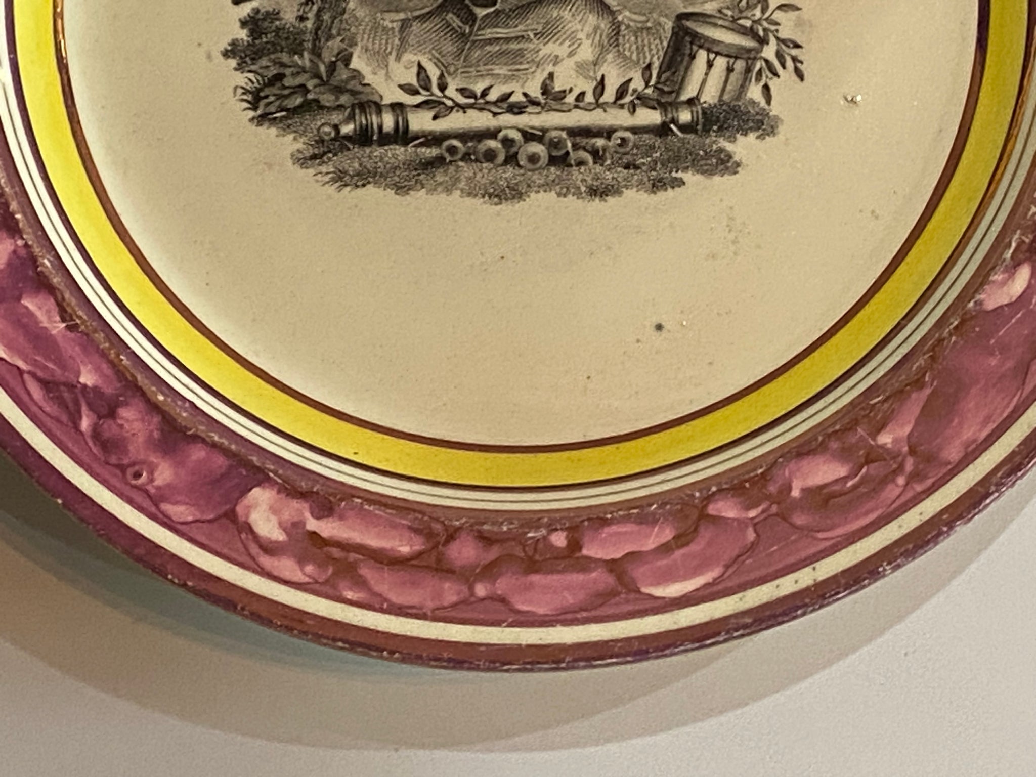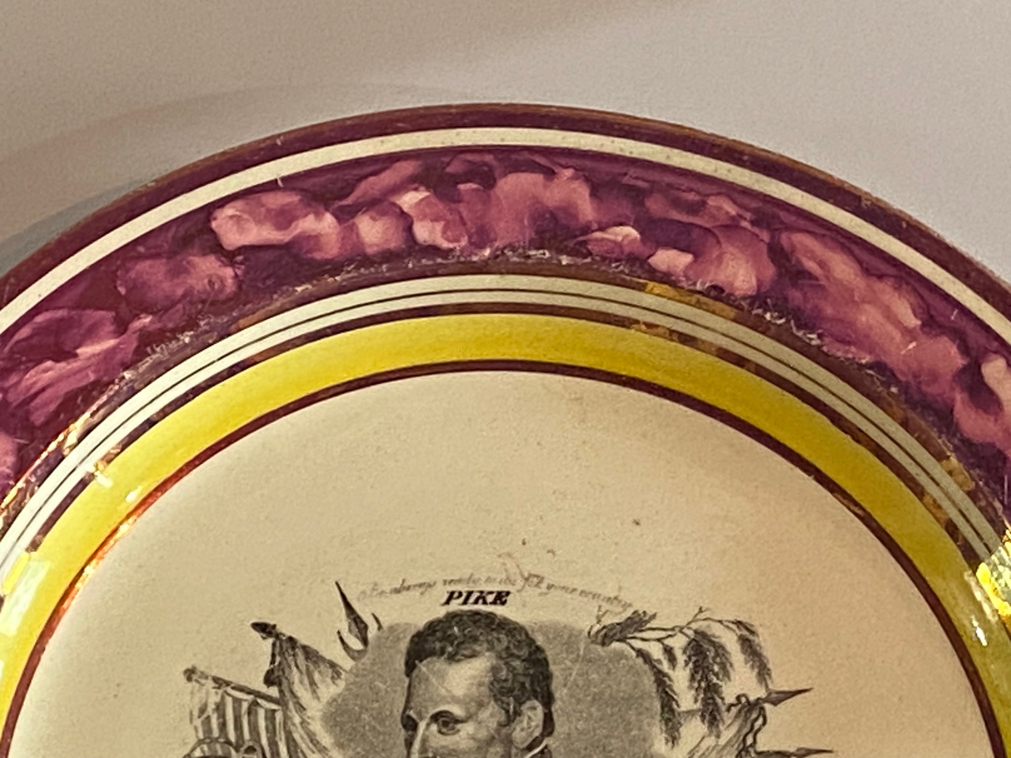 Staffordshire creamware plate with a War of 1812 transfer of Pike. Beautifully executed with a splash pink luster border with a yellow accent band. These particular plates are quite scarce. Normally you find the pitchers. It measures 10” in diameter and dates circa 1815.