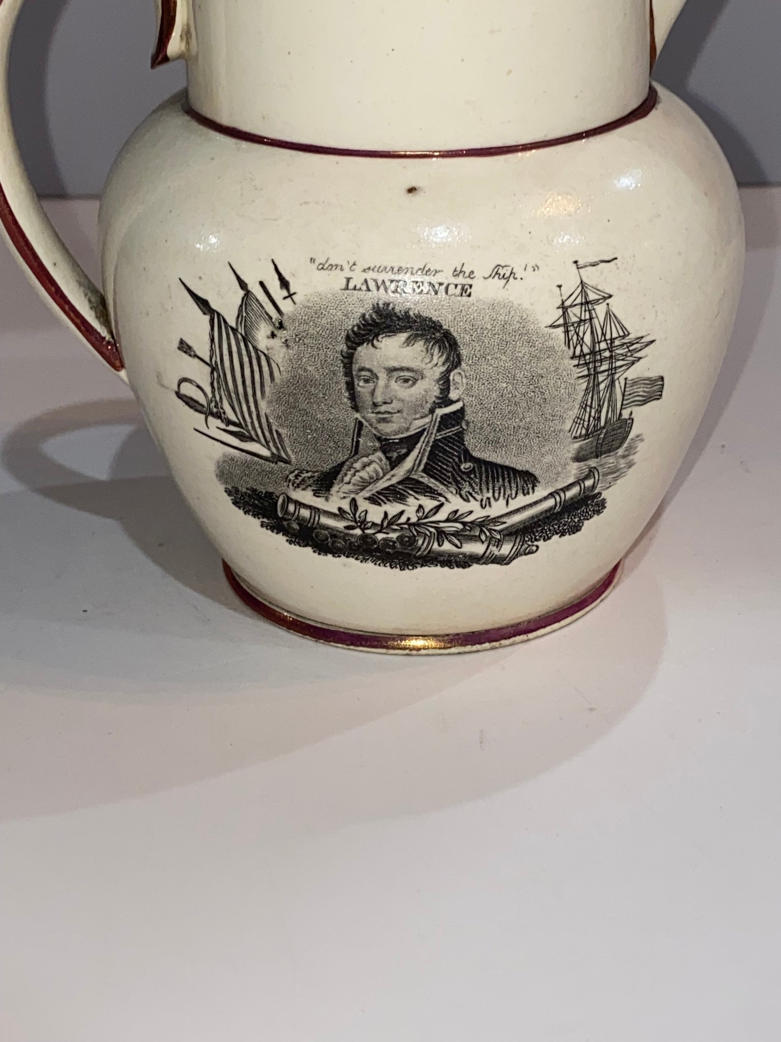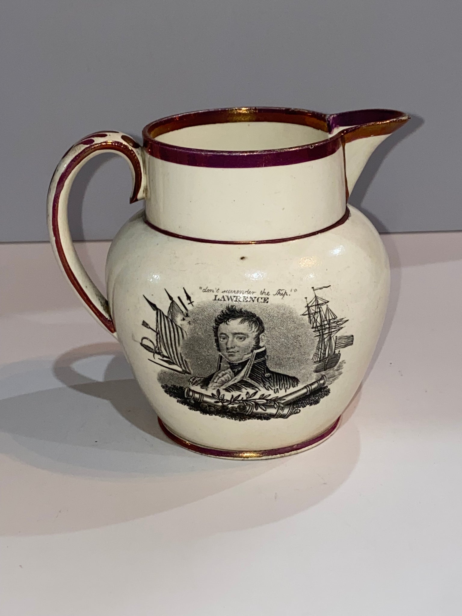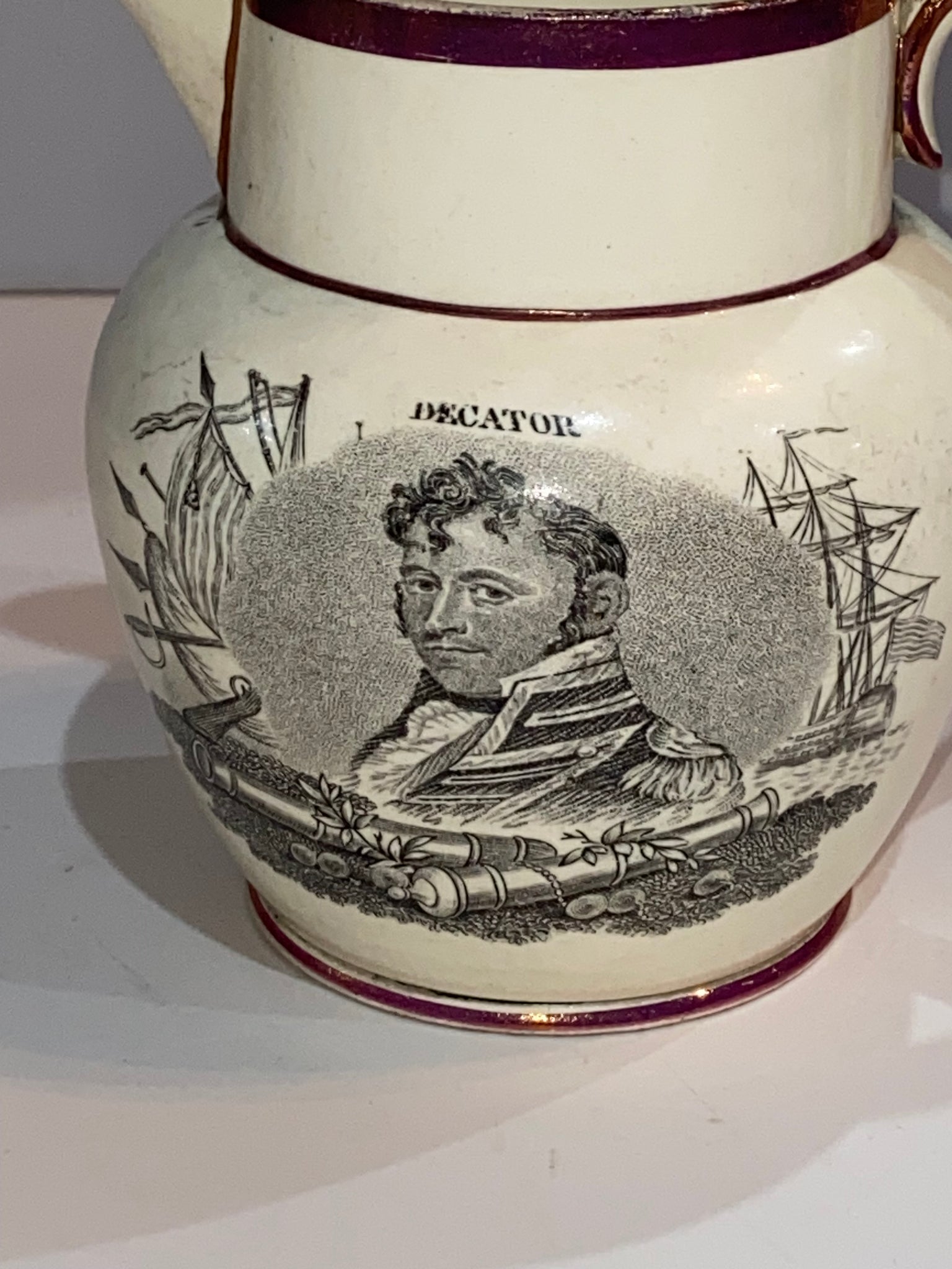 Historical Staffordshire War Of 1812 pitcher with Decator and Lawrence. This little pitcher is in very good condition with just a small spout chip and glaze line in the base that could most likely could be in the makng when the foot was attached to the base. Presents very well with crisp transfers, it measures 4 7/8” from the tip of the spout to the handle by 4 1/2” tall and dates circa 1815.