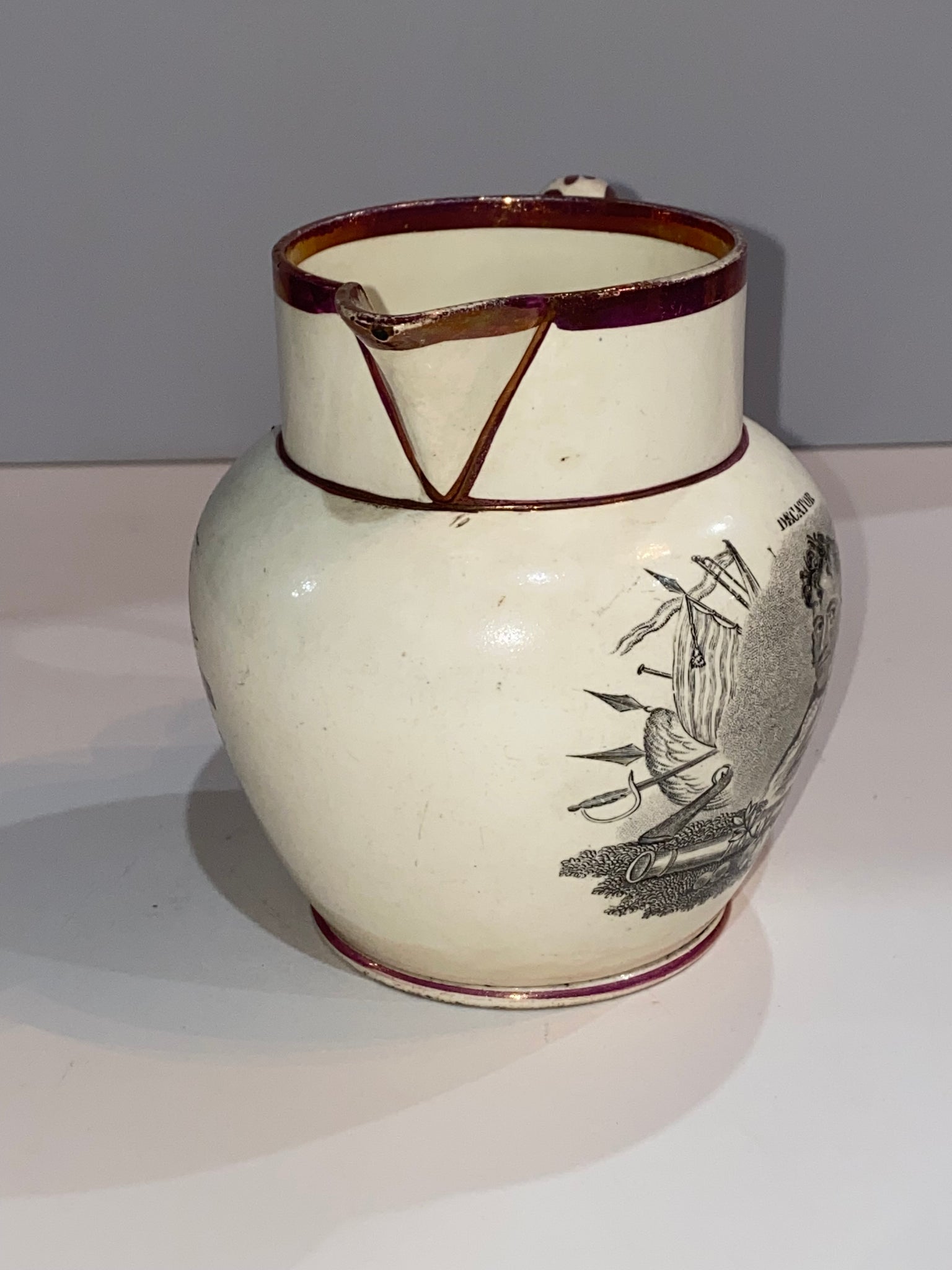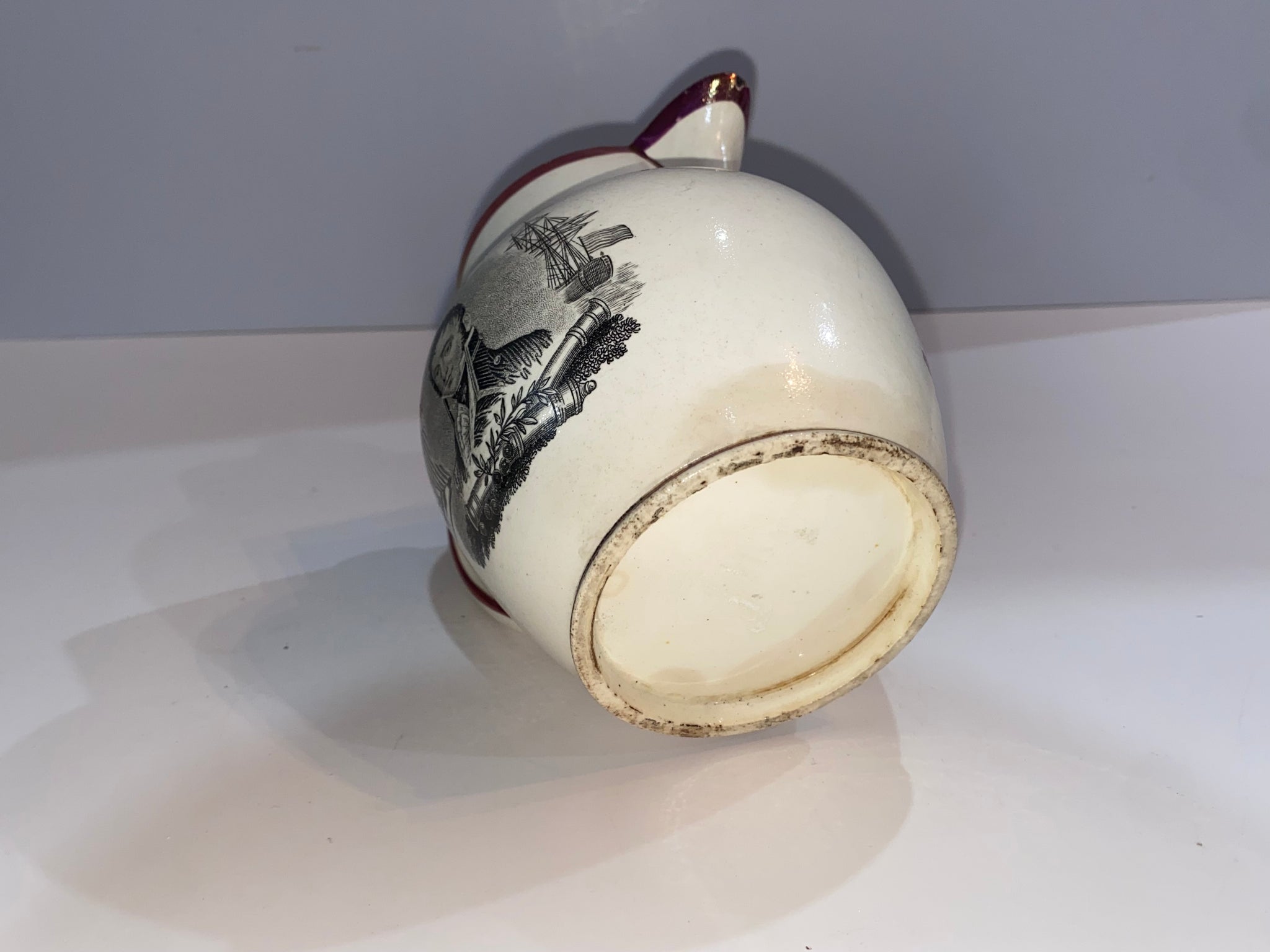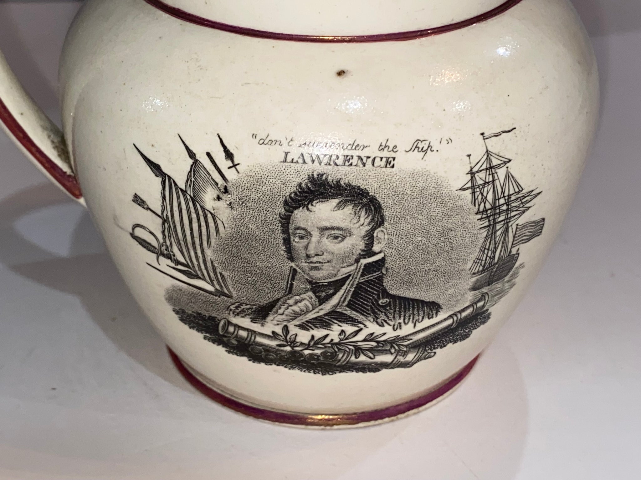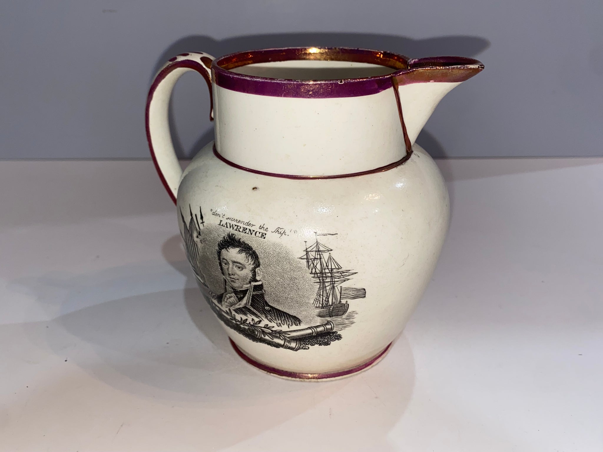 Historical Staffordshire War Of 1812 pitcher with Decator and Lawrence. This little pitcher is in very good condition with just a small spout chip and glaze line in the base that could most likely could be in the makng when the foot was attached to the base. Presents very well with crisp transfers, it measures 4 7/8” from the tip of the spout to the handle by 4 1/2” tall and dates circa 1815.