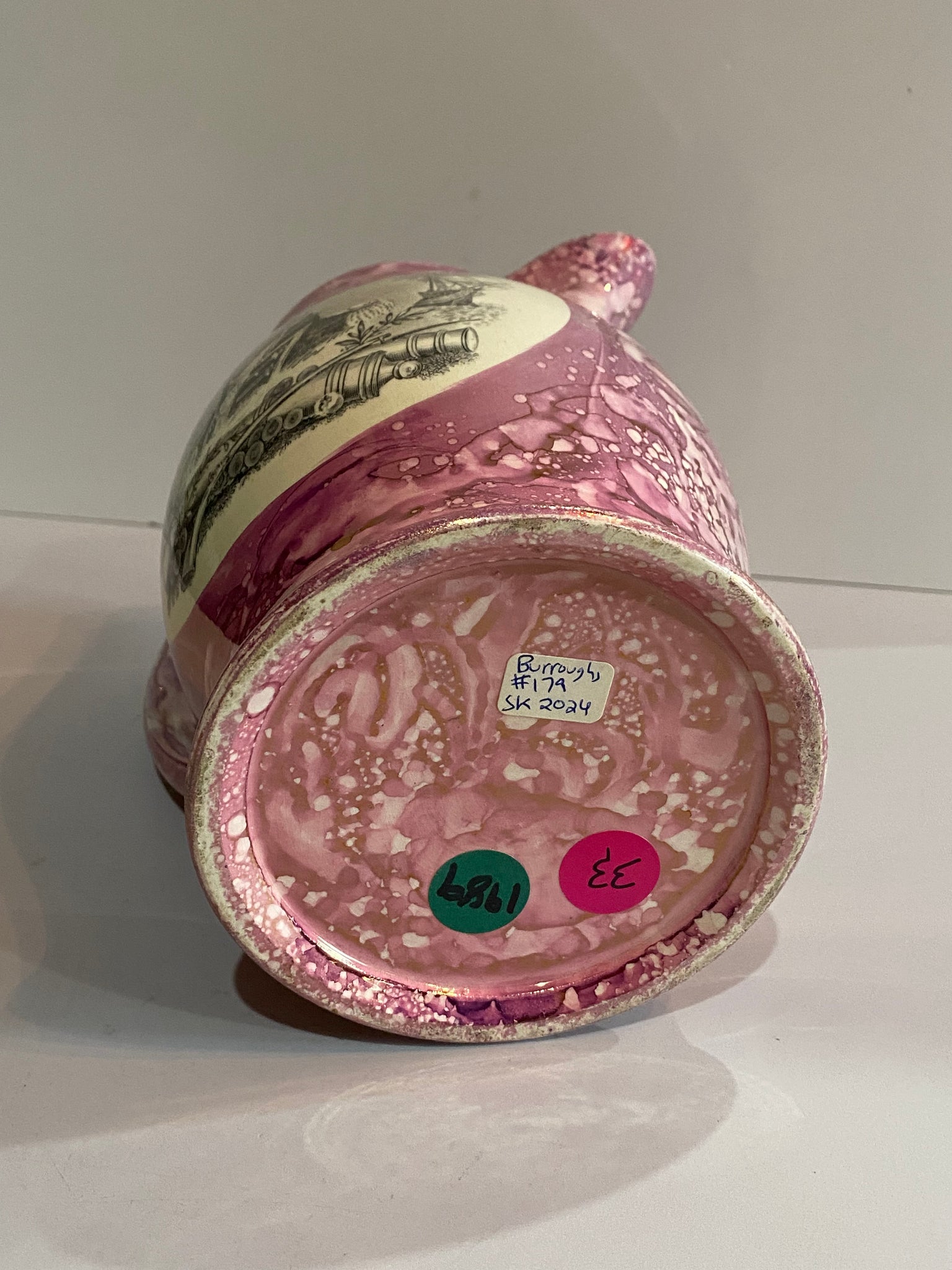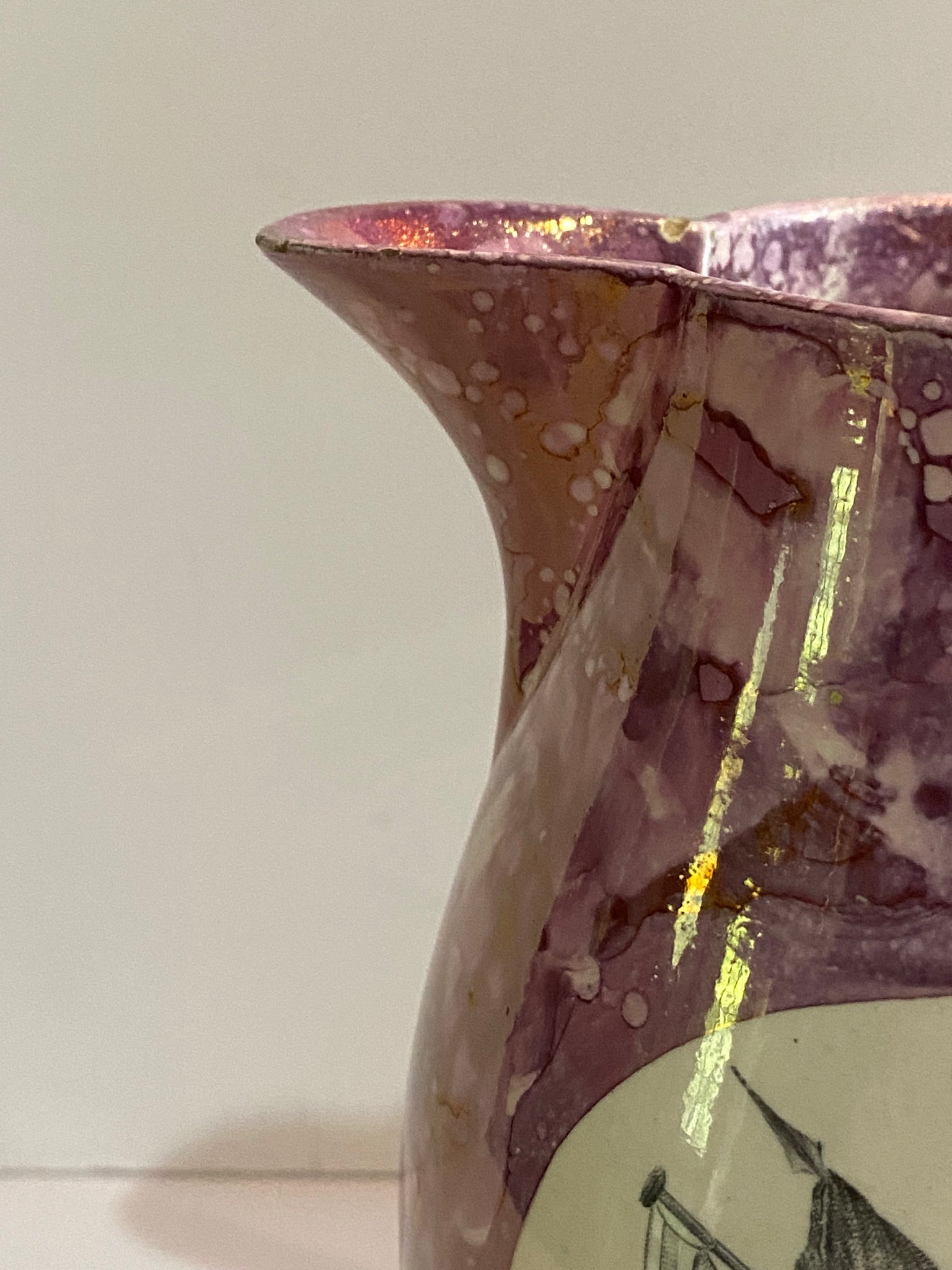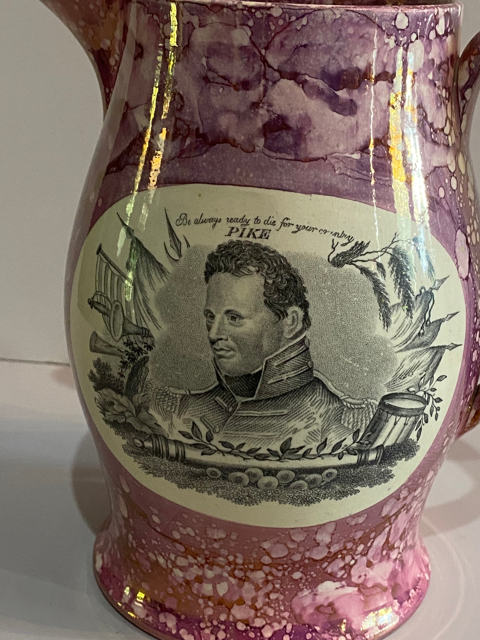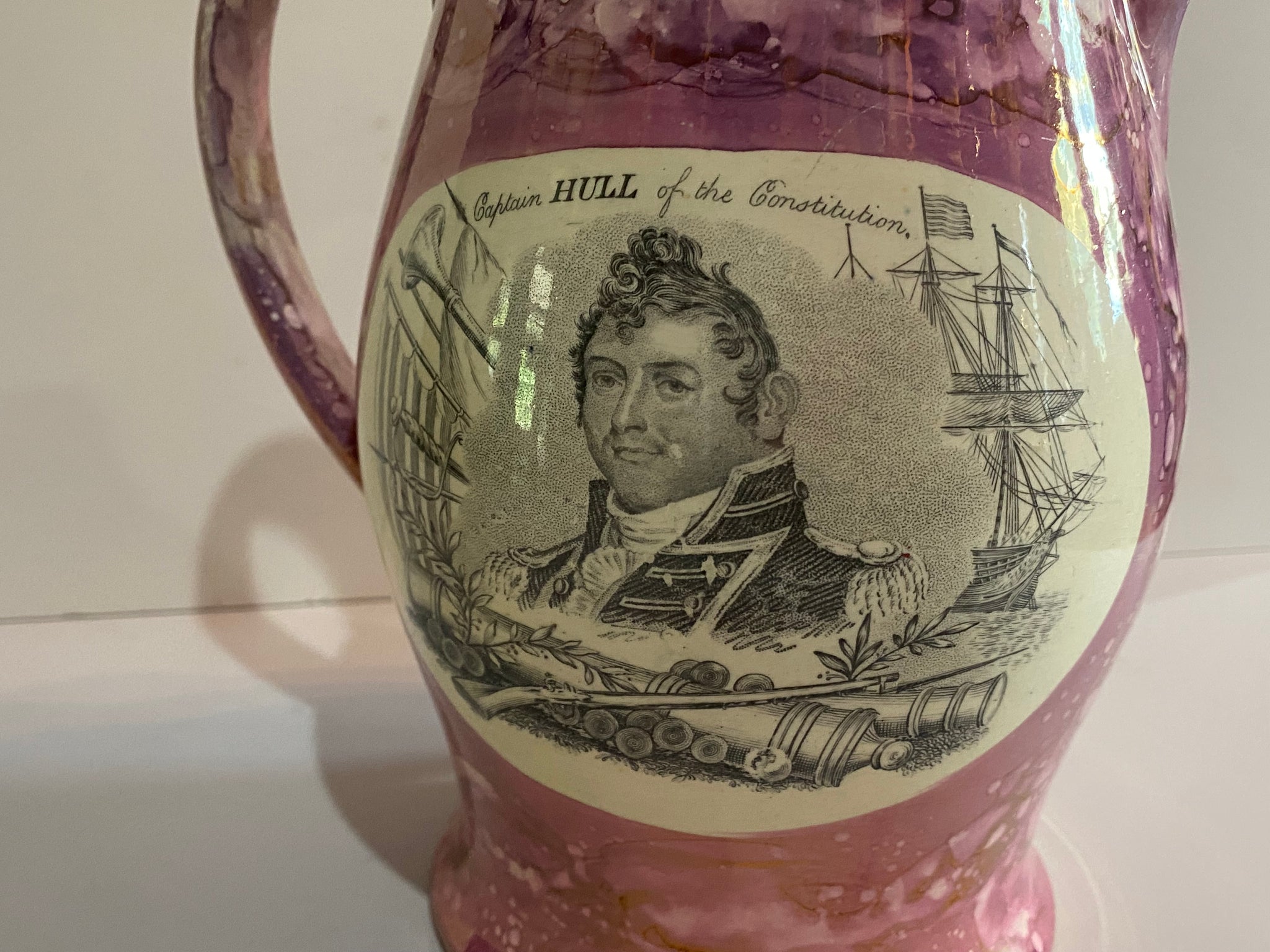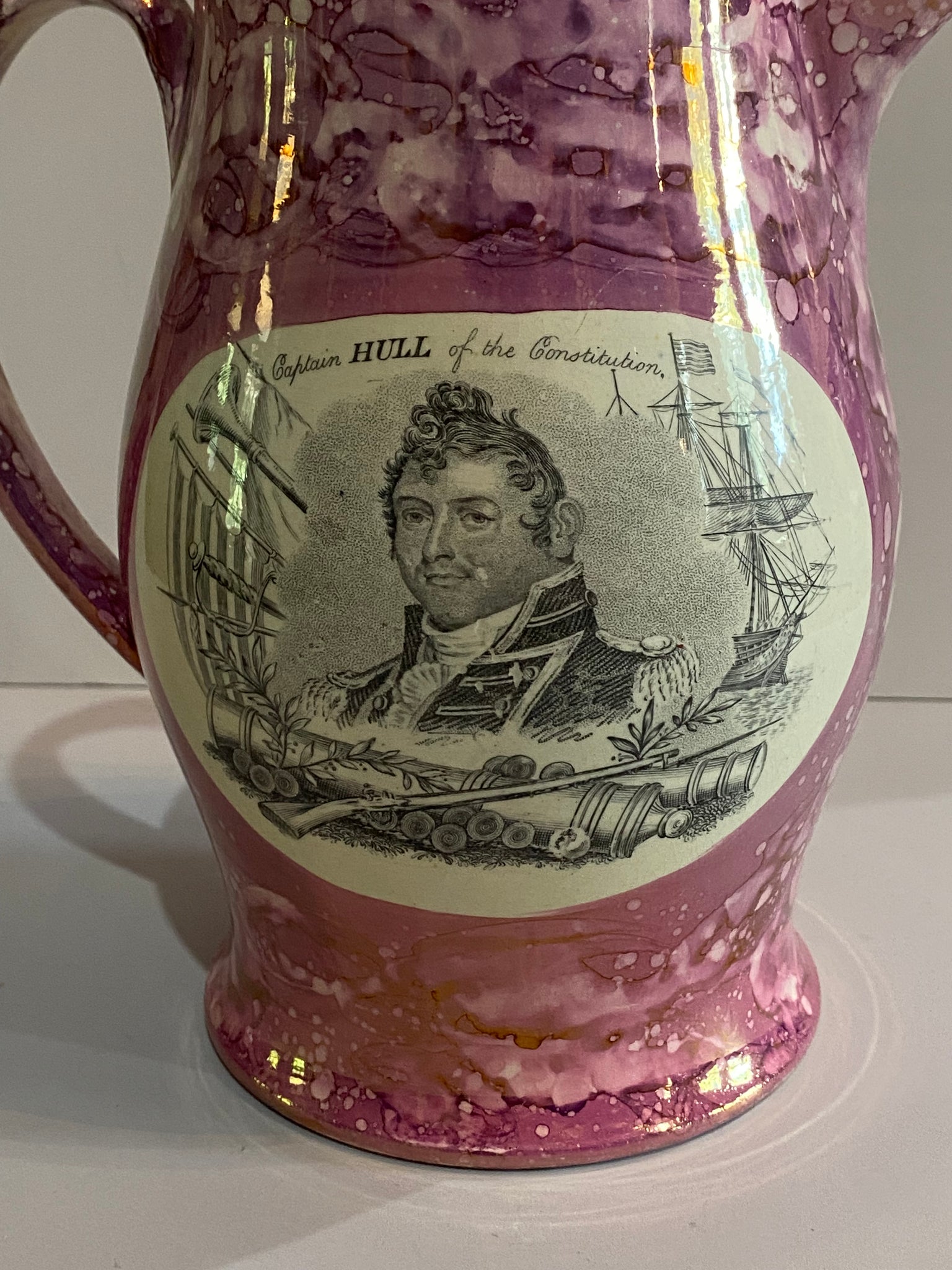 Historical Staffordshire splash pink luster pitcher with War of 1812 Captains Hull and Pike. These are quite rare and you almost never see them. This one is in perfect condition with no chips, cracks or repairs. It measures 7 1/4” tall and dates circa 1815.