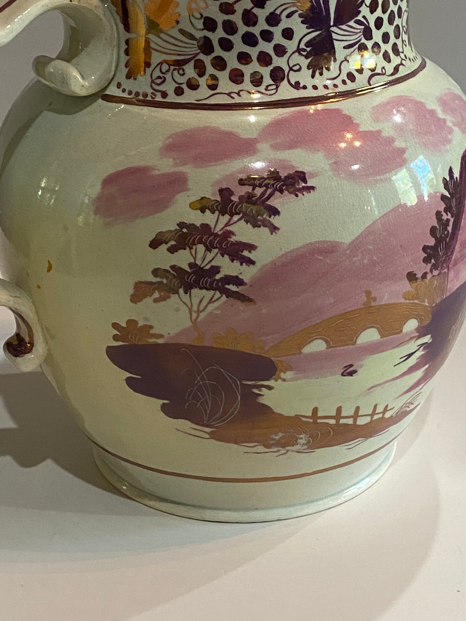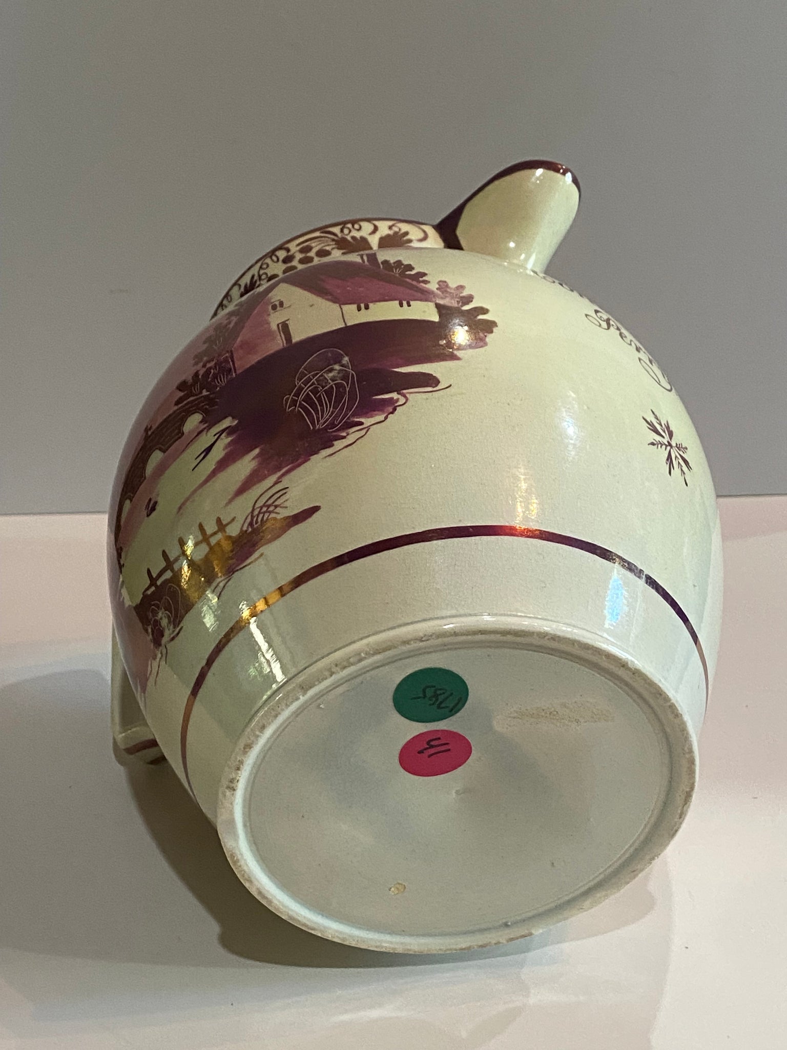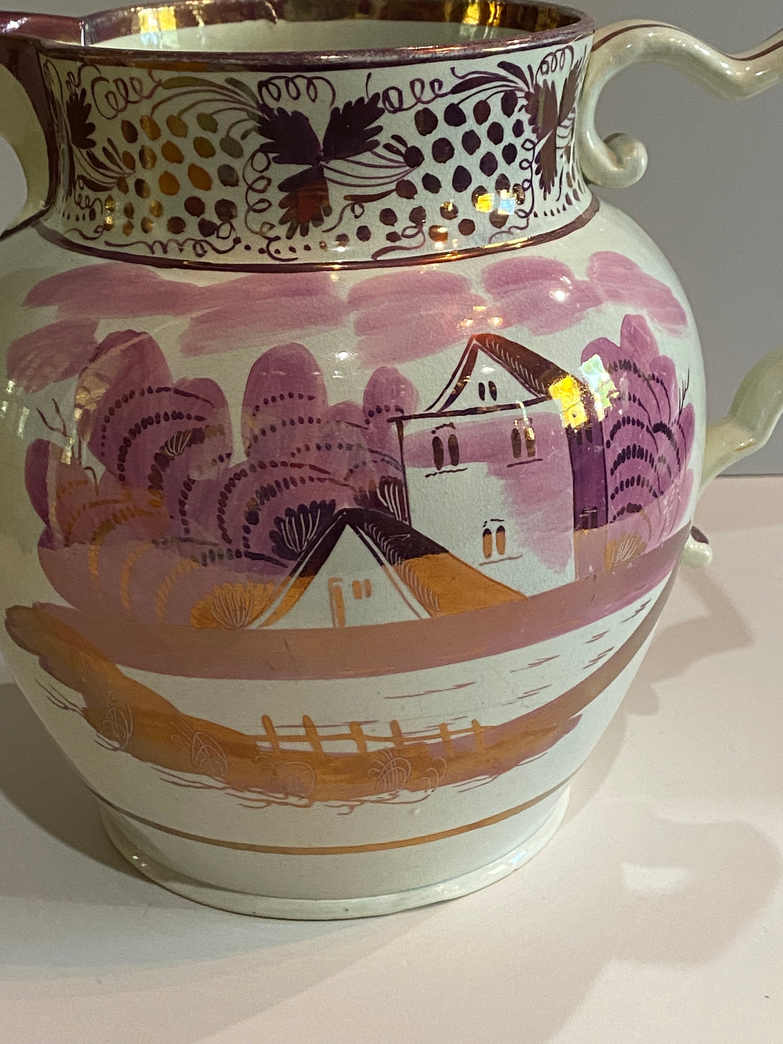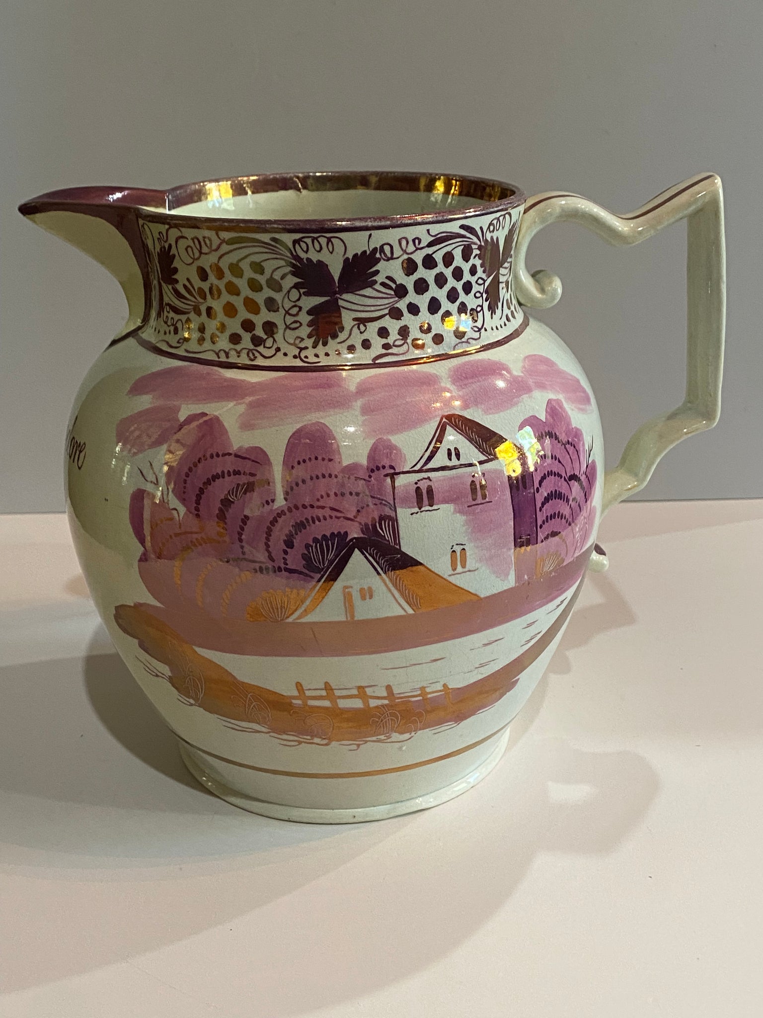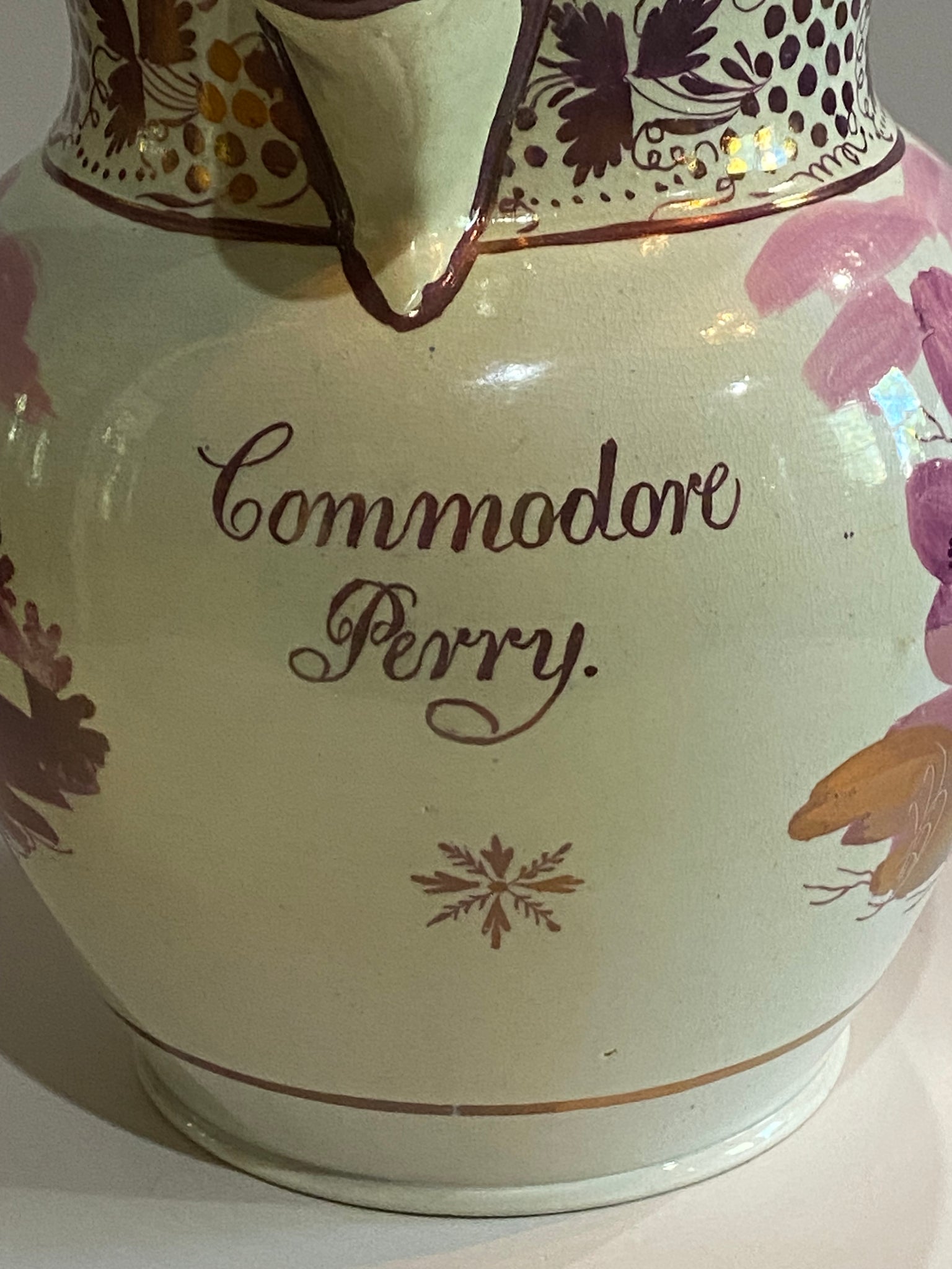 Staffordshire Pearlware pink luster house pattern pitcher with “Commodore Perry” under the spout. Displays well with older hairline and spout repairs. It measures 8 1/8” tall by 9 1/4” from the spout tip to the handle. It dates circa 1820.